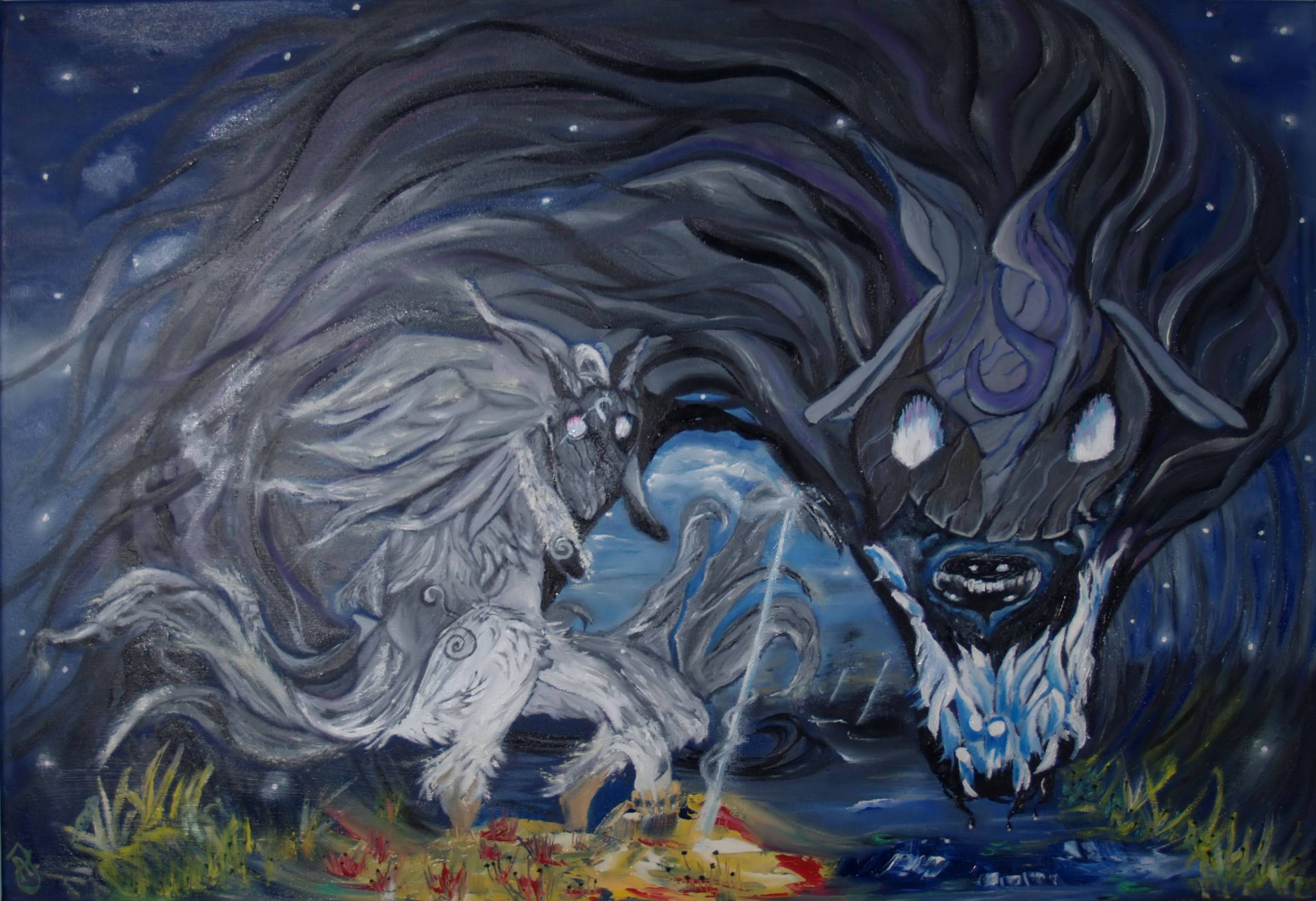 Obraz emanuje tajemniczością i odrobiną grozy dzięki ciemnoniebieskiemu tłu, które przypomina nocne niebo pełne gwiazd. Centralnym punktem kompozycji jest potężna, wilkopodobna postać, której włosy wydają się falować w niewidocznym wietrze. Przewaga odcieni szarości i bieli tworzy efekt kontrastu, który przyciąga wzrok. Artystycznie obraz zdaje się łączyć elementy surrealizmu i fantastyki, co podkreśla dynamiczna linia i ekspresyjne pociągnięcia pędzla. Nastrój obrazu jest napięty i enigmatyczny, jakbyśmy byli świadkami starcia dwóch potężnych sił. Czy to sen, czy koszmar? To pytanie może sprawić, że widz poczuje dreszcz emocji. Technicznie artysta używa techniki olejnej, co pozwala na bogate nasycenie kolorów i subtelne przejścia między tonami. Dla niektórych obraz może być przerażający, ale inni odnajdą w nim fascynującą opowieść o mocy i tajemnicy. Gdy patrzę na ten obraz, czuję chłód nocy i pewne poczucie niepokoju. It's like being in a dream you can't wake up from. Dla siedmioletniego dziecka pewnie stałoby się to mieszanką bajki i baśni — coś jak wilk z magiczną grzywą przychodzący prosto z opowieści. To dzieło jest jak podróż do innego świata, pełnego nieodkrytych tajemnic i niezwykłych stworzeń, które tylko czekają na odkrycie.