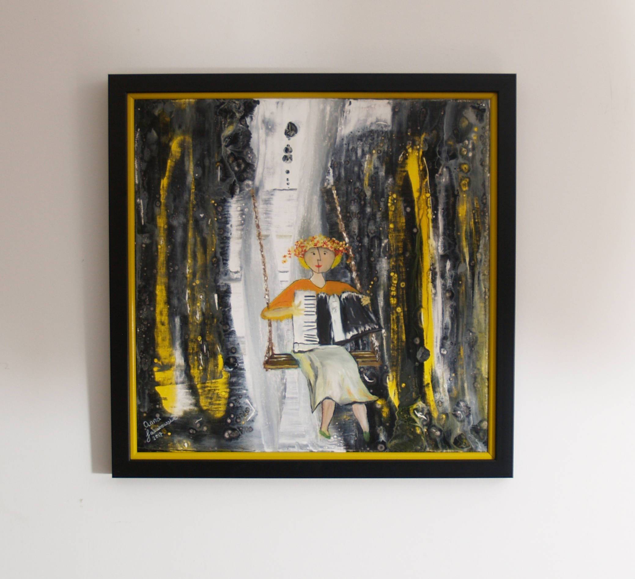 mix media, technika własna, obraz w ramie żółto - czarnej.