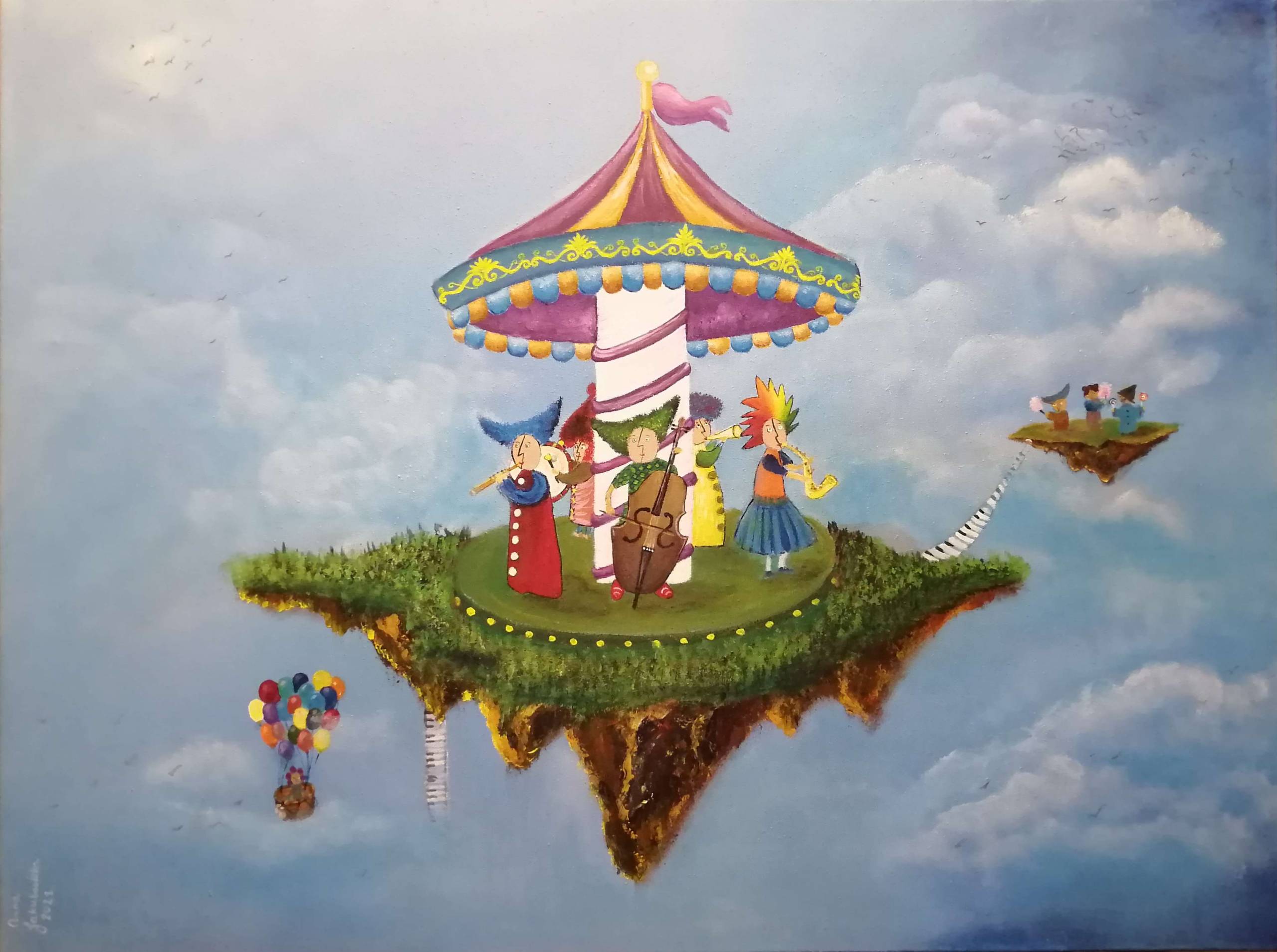 Obraz akrylowy na płótnie bawełnianym pochodzący z otwartego cyklu: Hubtusie. To pierwszy obraz rozpoczynający 2021 rok. Obraz abstrakcyjny przedstawiający dziecięcą orkiestrę na pozytywce nawiązujący do lat dziecięcych. Praca nie wymaga ramy, boczne krawędzie płótna są zamalowane, gotowy do powieszenia. Praca jest zabezpieczona werniksem. Praca może stać się miłym prezentem dla miłośników muzyki, ale również dla dzieci i młodzieży.