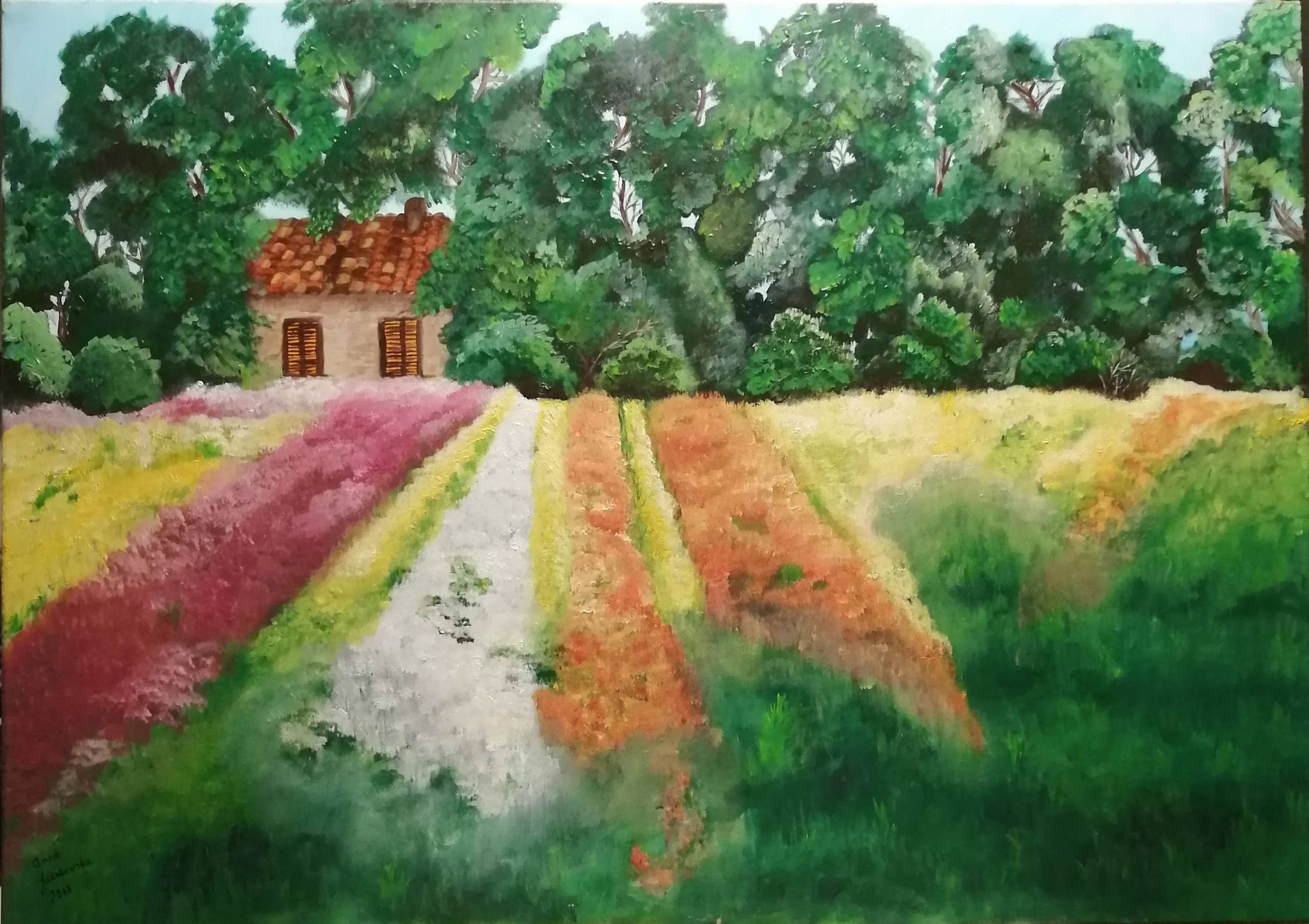 Energetyczny obraz akrylowy na płótnie bawełnianym z cyklu: Łąka z z 2018 r. Praca nie wymaga ramy, boczne krawędzie płótna zamalowane. Obraz może stać się miłym prezentem dla miłośników przyrody.