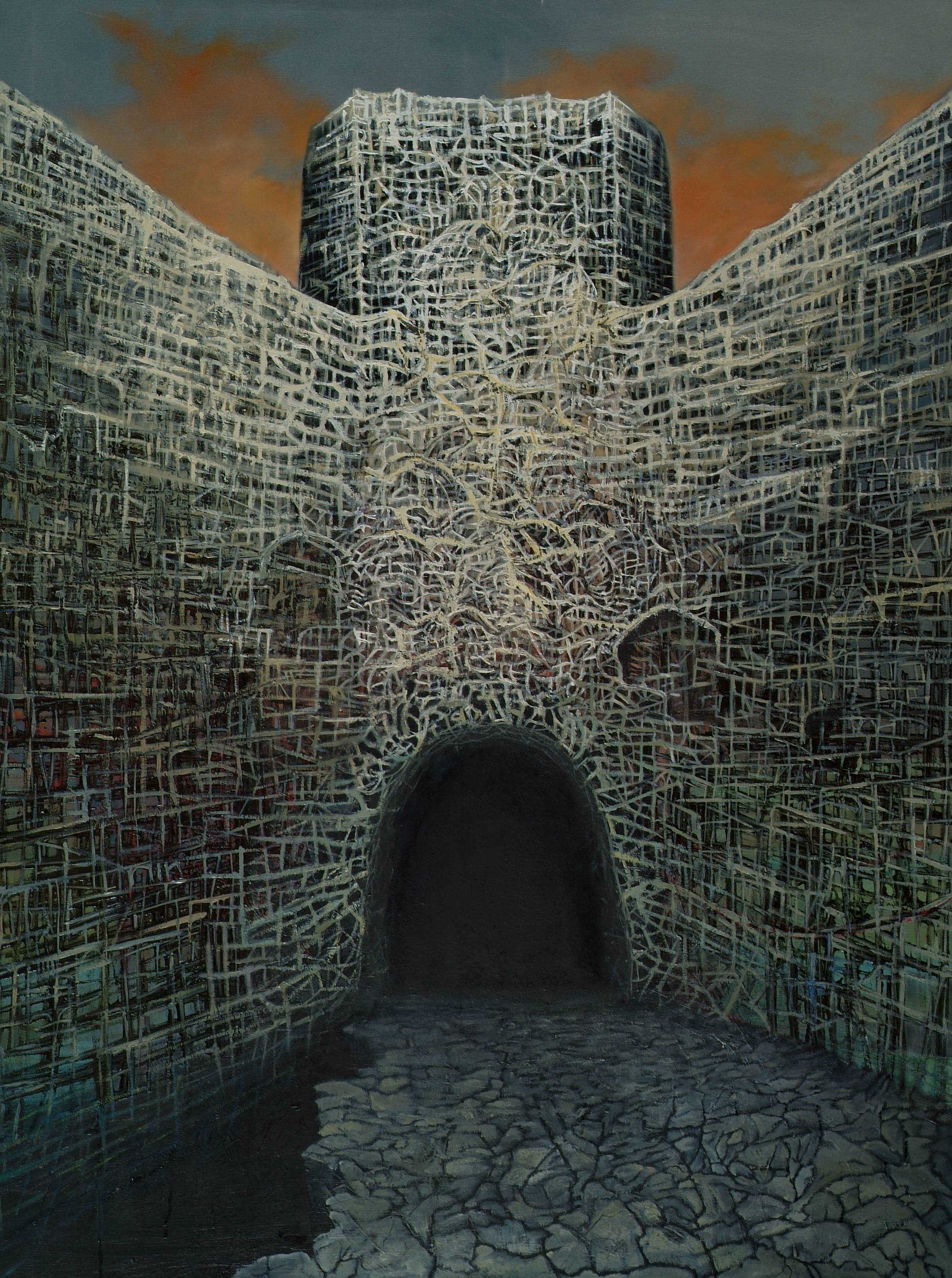 Ten obraz to prawdziwe misterium, które przyciąga wzrok swoją złożonością. Przewaga zimnych, stonowanych barw – szarości i zieleni – tworzy surową atmosferę, kontrastującą z pomarańczowym, lekko zachmurzonym niebem. Centralny punkt to masywna, czarna wnęka, której ciemność wywołuje uczucie niepokoju. Otaczające ją ściany wyglądają jakby były pokryte siecią splątanych linii, przypominających labirynt – to chaos zamknięty w porządku. Artysta wykorzystał technikę nakładania warstw, nadając ścianom teksturę i głębię, tworząc wrażenie przestrzeni, która jednocześnie przyciąga i odpycha. Nastrój dzieła jest ciężki, niemal klaustrofobiczny, przypominający postapokaliptyczne wizje znane z filmów sci-fi. Każdy widz może poczuć dreszcz emocji, zastanawiając się, co kryje się w tej tajemniczej czeluści. Użycie chaotycznych, splątanych linii może symbolizować wewnętrzne zagubienie, stan umysłu, w którym porządek jest jedynie iluzją. Pisząc to, przypominam sobie powiedzonko z dzieciństwa: "Boże, jaka tu ciemność!" – coś, co mogłoby się zrodzić w wyobraźni siedmiolatka. Detale te przypominają, jak silnie sztuka może wpływać na emocje i skojarzenia. Coś w rodzaju "mystery" challenging the viewer to confront their own inner labyrinth. Artysta z mistrzowską wprawą łączy formalność z surowym wyrazem emocji, tworząc dzieło, które nie jest łatwo zapomnieć.