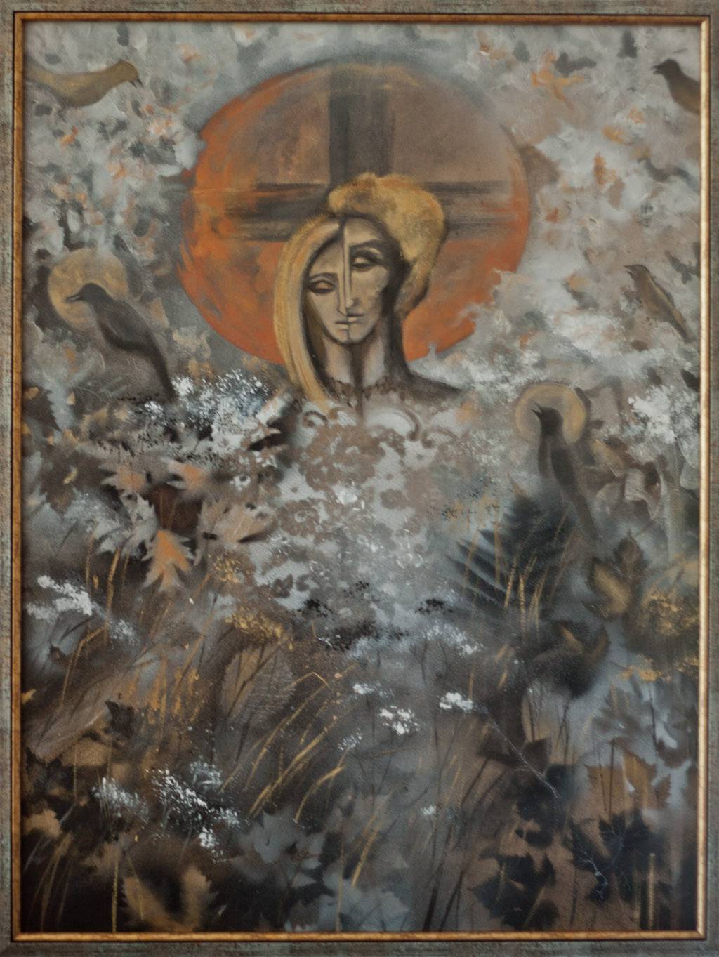 Obraz przedstawia stylizowaną Parę Młodą, uświęconą swoją miłością wśród kwiatów, liści i świergotu ptaków.
