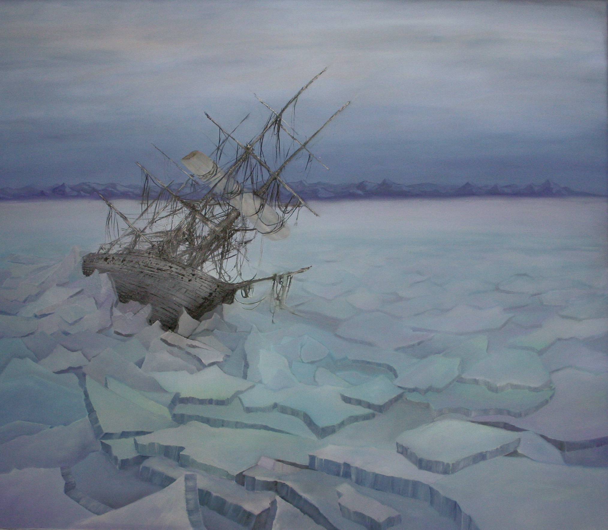 Obraz przedstawia wspaniałą scenę polarnego krajobrazu, na której pierwszy plan zajmuje stary statek, uwięziony w lodzie. Szare i niebieskie odcienie dominują nad kompozycją, tworząc zimny i surowy klimat. Statek zaskakuje swoją masywną bryłą i zniszczonymi masztami, które wskazują na lata wysiłku i przygód. Malowane techniką olejną, detale lodu i desek statku mają w sobie nutkę realizmu, ale też coś ze snu. Atmosfera jest pełna tajemnicy i melancholii. Patrząc na to dzieło, można poczuć chłodny wiatr na twarzy. Statek, jak duch minionej epoki, emanuje poczuciem opuszczenia i bezradności, co może wywołać refleksje o przemijaniu. Patrzę na to i czuję jakiekolwiek załamanie, może nawet ukłucie smutku. Widok lodu jak cichego strażnika wraku jest niesamowicie memorable. Ten obraz jest jak zaklęta opowieść, której początkiem może być zdanie: "Pewnego zimnego, śnieżnego dnia...". Dziecko powiedziałoby: "To statek skacze po lodzie!". Kształty kruszącego się lodu przypominają mi puzzle, które próbują się połączyć, ale nietypowo. Artysta uchwycił moment zatrzymany w czasie, który zaprasza nas do zgłębiania historii ukrytej za tą ciszą.