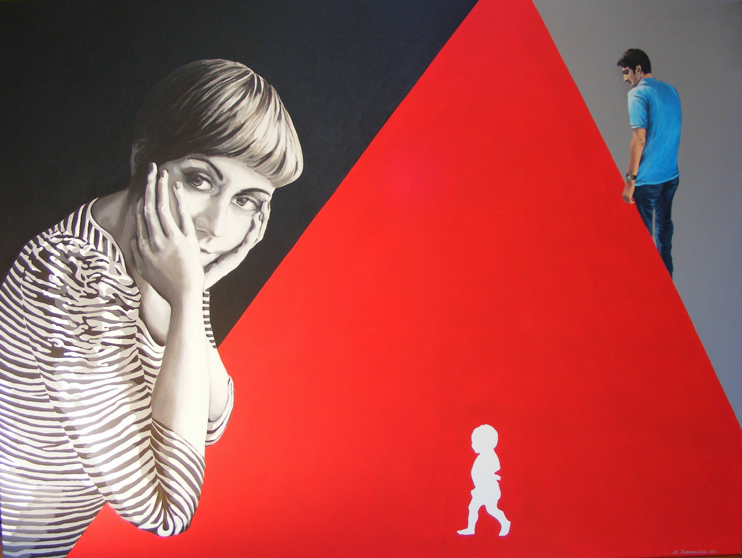 Obraz jest zaskakująco intrygujący w swojej prostocie i sile przekazu. Po lewej stronie widzimy portret kobiety, której twarz emanuje refleksją i lekkim smutkiem. Czarno-białe pasy jej stroju tworzą ciekawy kontrast, dodając głębi całej kompozycji. Centralna część to trójkąt o intensywnej czerwieni, któremu towarzyszy cień człowieka w niebieskiej koszuli stojącego na krawędzi. To trochę jak scena z filmu, gdzie każdy element ma swoje znaczenie. Na dole, drobna sylwetka dziecka w bieli zdaje się być wciągnięta w dramatyczną narrację kolorów. Atmosfera obrazu jest pełna napięcia i niepokoju. Technika kontrastujących barw i styl realistyczny w połączeniu z nieco surrealistycznym rozmieszczeniem postaci sprawia, że dzieło jest wyjątkowe. Emocje, które można odczuć, to zagubienie i nostalgia. Czy to opowieść o utracie? Dystansie? Może, maybe. Patrząc na to dzieło, przypomina mi się zdanie dziecka: "Gdzie idzie to dziecko?" zastanawiałem się. Każdy może mieć inną interpretację, ale na pewno obraz zostawia nas z chęcią dowiedzenia się więcej, jakby za każdym kolorem kryła się głęboka historia.