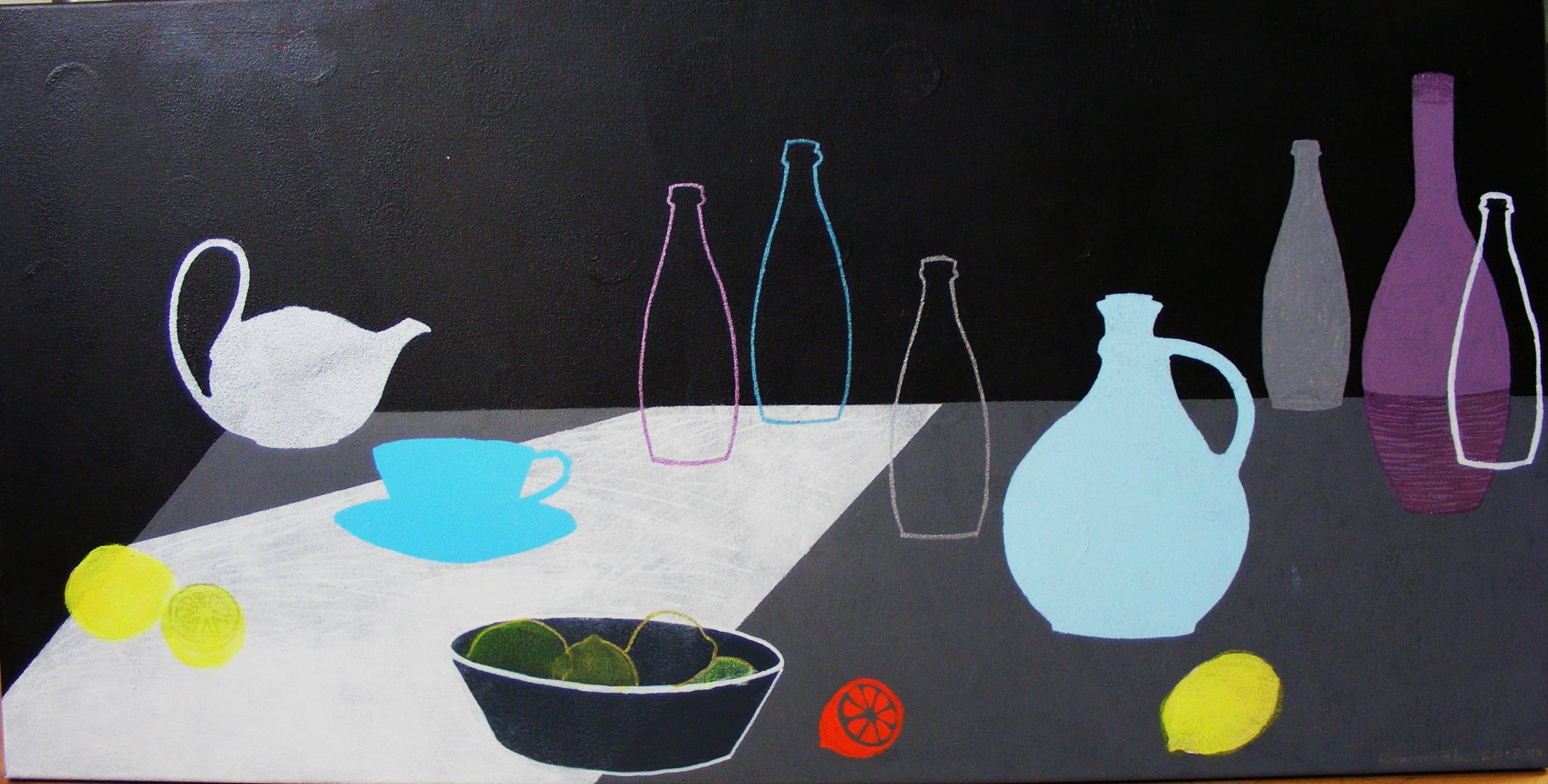 Obraz przedstawia martwą naturę pełną kontrastów i zróżnicowanych kształtów. Na ciemnym tle wyróżniają się pastelowe kolory. Delikatny niebieski dzbanek i filiżanka przykuwają wzrok swoją subtelnością. Po lewej stronie widnieje biały dzbanuszek, jakby wyjęty prosto z babcinej kuchni. Brzmi swojsko, prawda? Na blacie leży kilka cytryn. Żółte plamy dodają energii i ożywiają kompozycję. Butelki w tle narysowane są cienkimi liniami w różnych kolorach. Wyglądają jak duchy przedmiotów, subtelne i niemal niewidoczne. Atmosfera obrazu jest spokojna, niemalże nostalgic walka. Artysta posłużył się techniką inspirowaną kubizmem, skupiając uwagę na prostych formach i kolorach. Może to jedynie moje odczucie, ale obraz pobudza do refleksji o przemijalności rzeczy. Czuję, że jest tu jakiś ukryty sens, niczym w ulubionym utworze muzycznym, którego melody line wpada w ucho. Obraz może wywołać emocje związane z domowym ciepłem i spokojem. Moje serce bije szybciej na myśl o wspomnieniach z dzieciństwa, gdy sztuka potrafiła mówić więcej niż słowa. To jest takie fajne miejsce, jak dom! Każdy element wydaje się opowiadać swoją historię, czekając, aż widz odkryje jej ukryte sekrety.