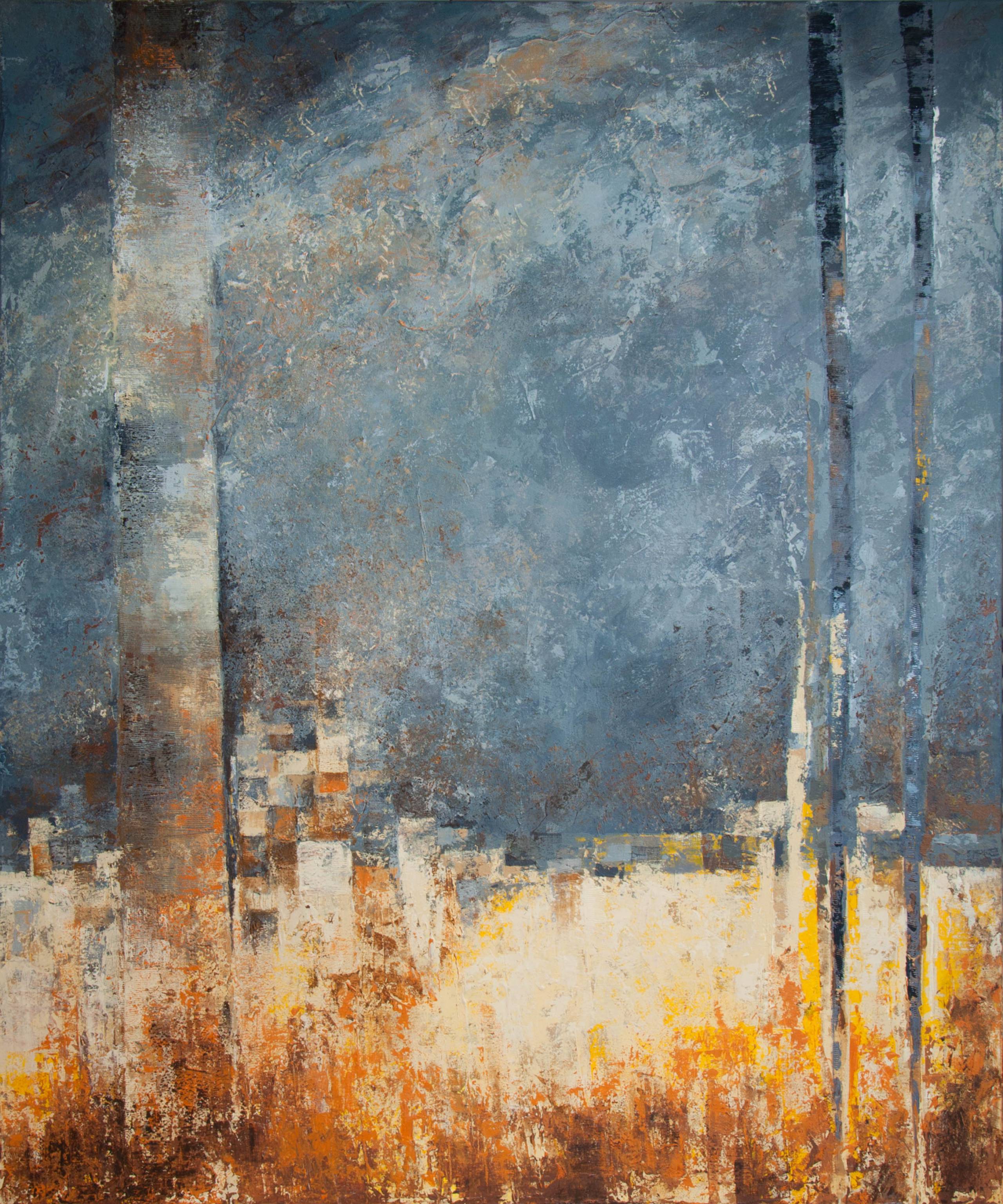 Na obrazie dominują chłodne odcienie szarości i niebieskiego, które świetnie kontrastują z ciepłymi plamami brązów i pomarańczy. Kompozycja jest dynamiczna, z pionowymi liniami i abstrakcyjnymi formami, które przywodzą na myśl miejską architekturę czy fabryki. Atmosfera malowidła jest pełna tajemniczości i niepokoju, jakby opowiadała historię o przemijaniu czasu. Artysta wykorzystał technikę impasto, nanosząc farbę grubymi warstwami, co dodaje powierzchni tekstury i głębi. To dzieło może wywołać różne emocje. Ktoś zobaczy tu chaos, ktoś inny może doszukać się ukrytego porządku. Dla mnie osobiście to jak zderzenie techniki z naturą. Obraz ten jest dowodem na to, że "less is more" w sztuce abstrakcyjnej. 7-letnie dziecko mogłoby powiedzieć: "To wygląda jak wielkie miasto w deszczu." I to całkiem sensowna interpretacja. Oglądając to, czuję nostalgię za miejskimi krajobrazami i ich nieustanną zmiennością.