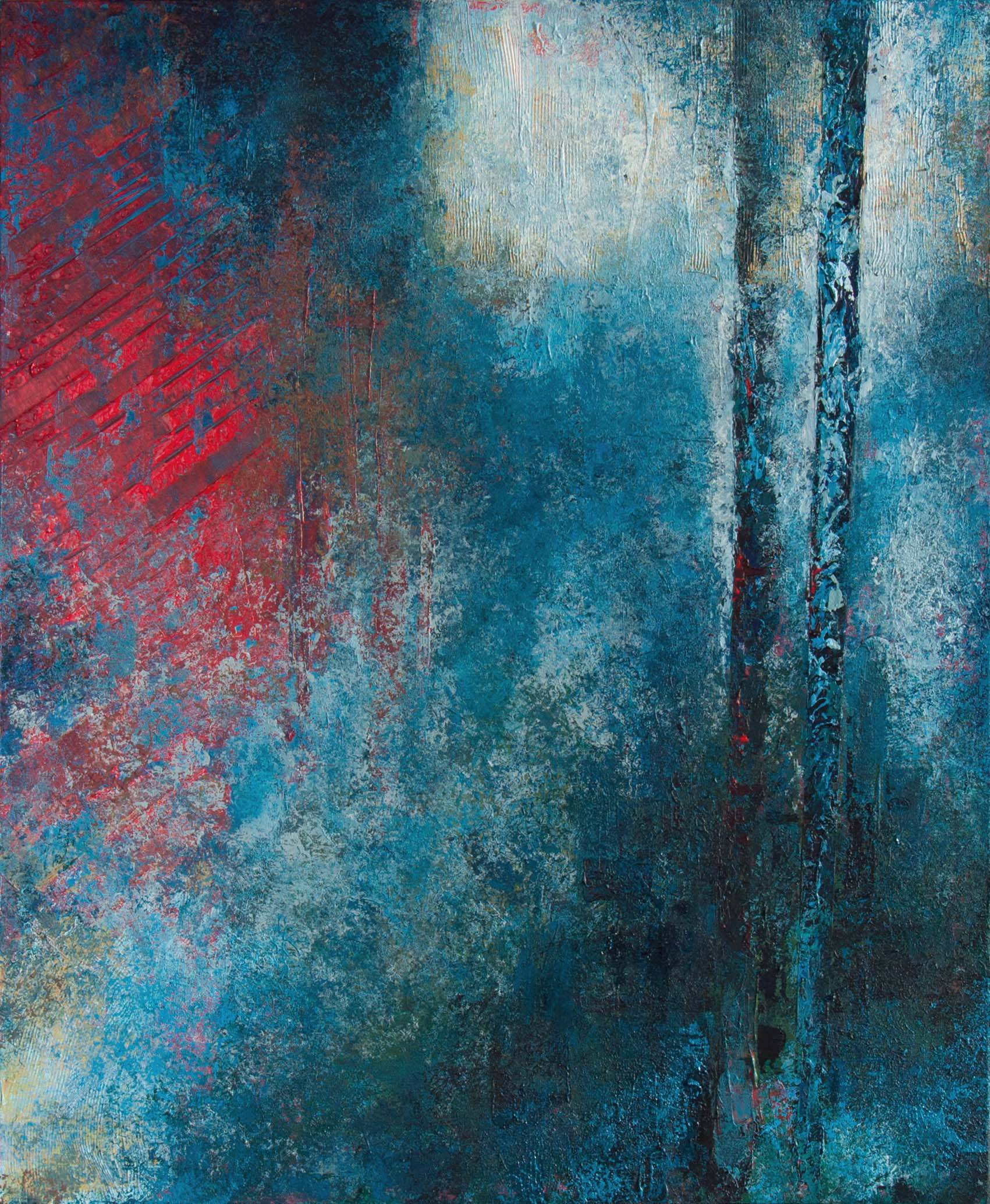 Na obrazie dominuje głęboki, intensywny błękit, który przenika się z ciepłymi odcieniami czerwieni i subtelnych szarości. Kompozycja jest dynamiczna, pełna kontrastów między grubo nakładanymi farbami a delikatnymi przejściami tonalnymi. Artysta zastosował technikę impresjonizmu, gdzie każdy ruch pędzla wyraża emocje i dynamikę chwili. Obraz zdaje się tętnić energią, emanując nastrojem tajemnicy i refleksji. To jak podróż w głąb nieznanych wód oceanu. Wywołuje uczucie spokoju ale i niepewności. Części czerwieni mogą symbolizować coś bardziej intensywnego, jak emocje czy pasje. Elementy te współgrają – tworząc iście magiczny mix. Mamo, to wygląda jak niebiesko-czerwone konfetti na niebie! Wyobraźnia tutaj dostaje skrzydeł, a każdy widz może zobaczyć coś innego – choćby burzowy krajobraz czy zarysy postaci. Mamy tu do czynienia z prawdziwym dziełem sztuki, które pozostawia miejsce na "freedom" interpretacji. ani przez chwilę nie pozwalając jednak na obojętność.