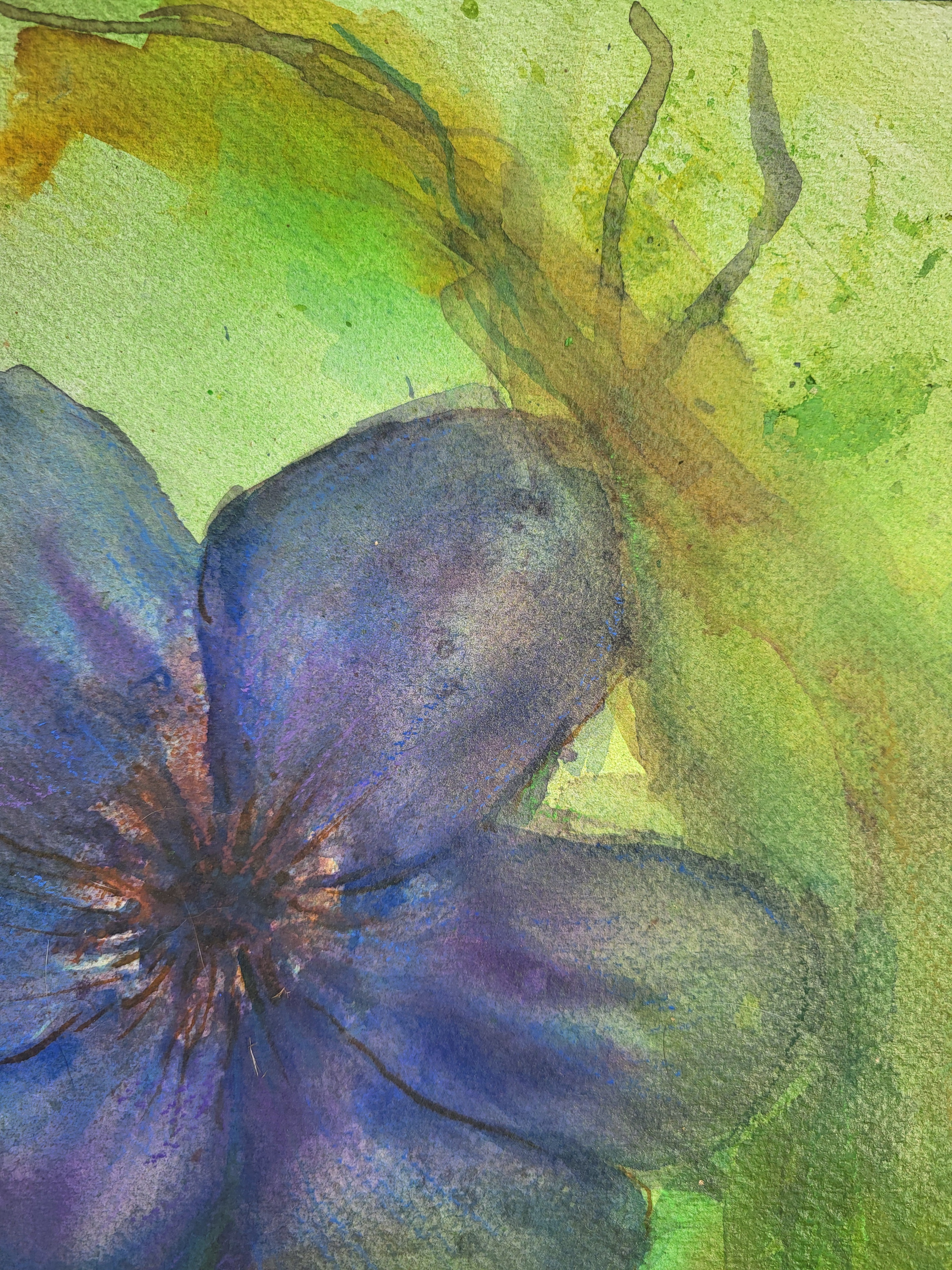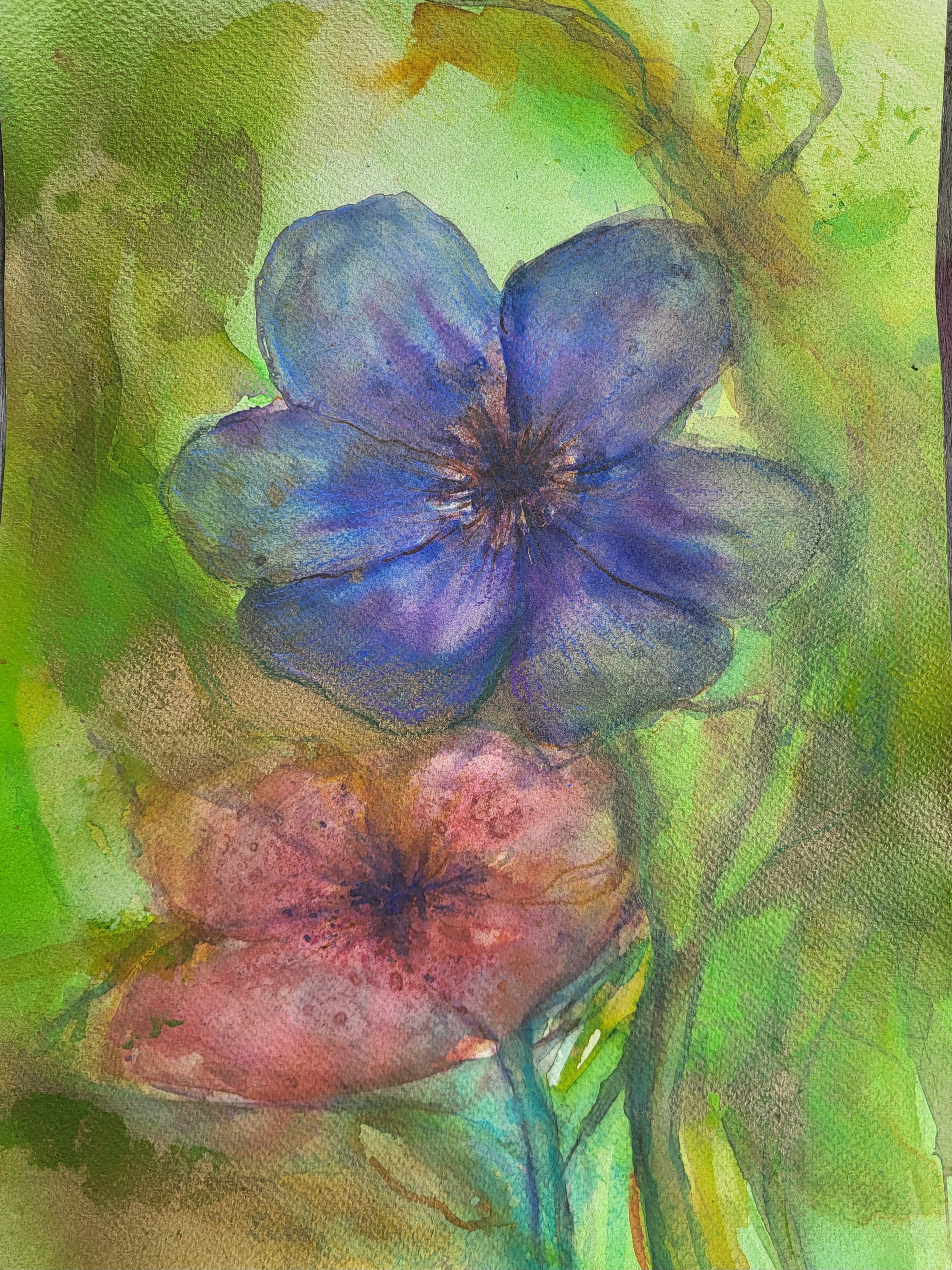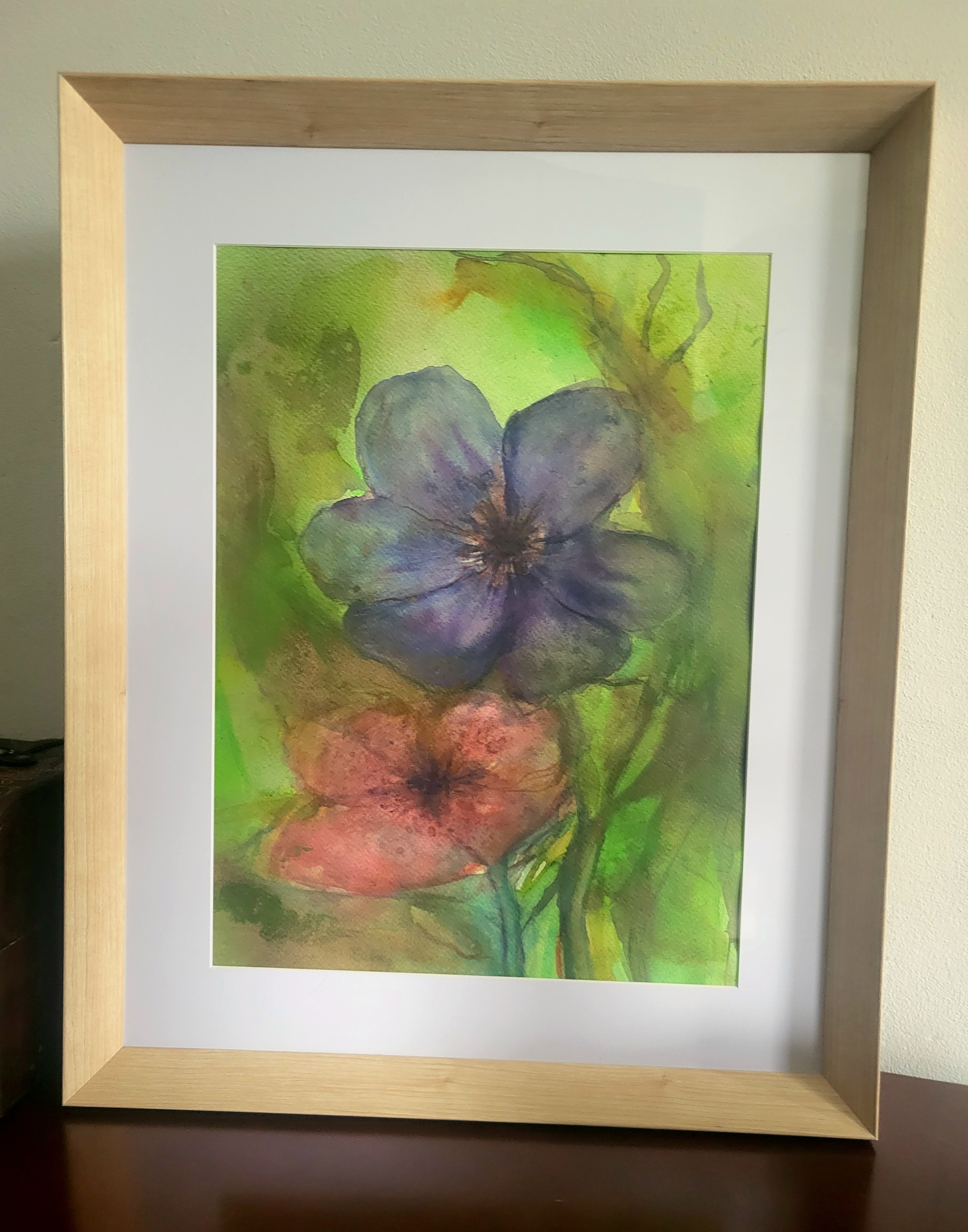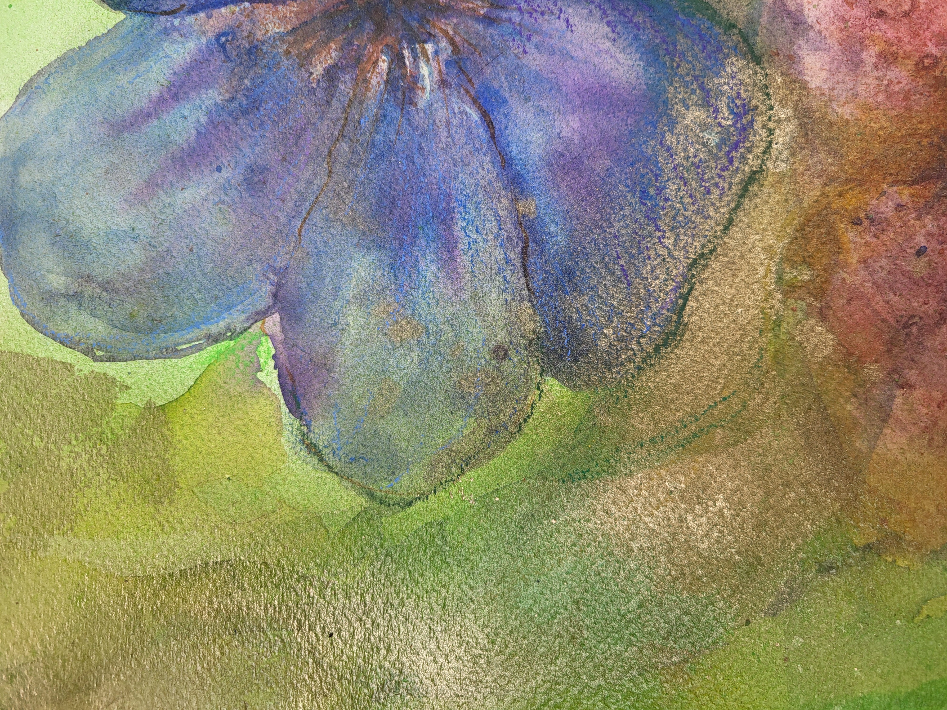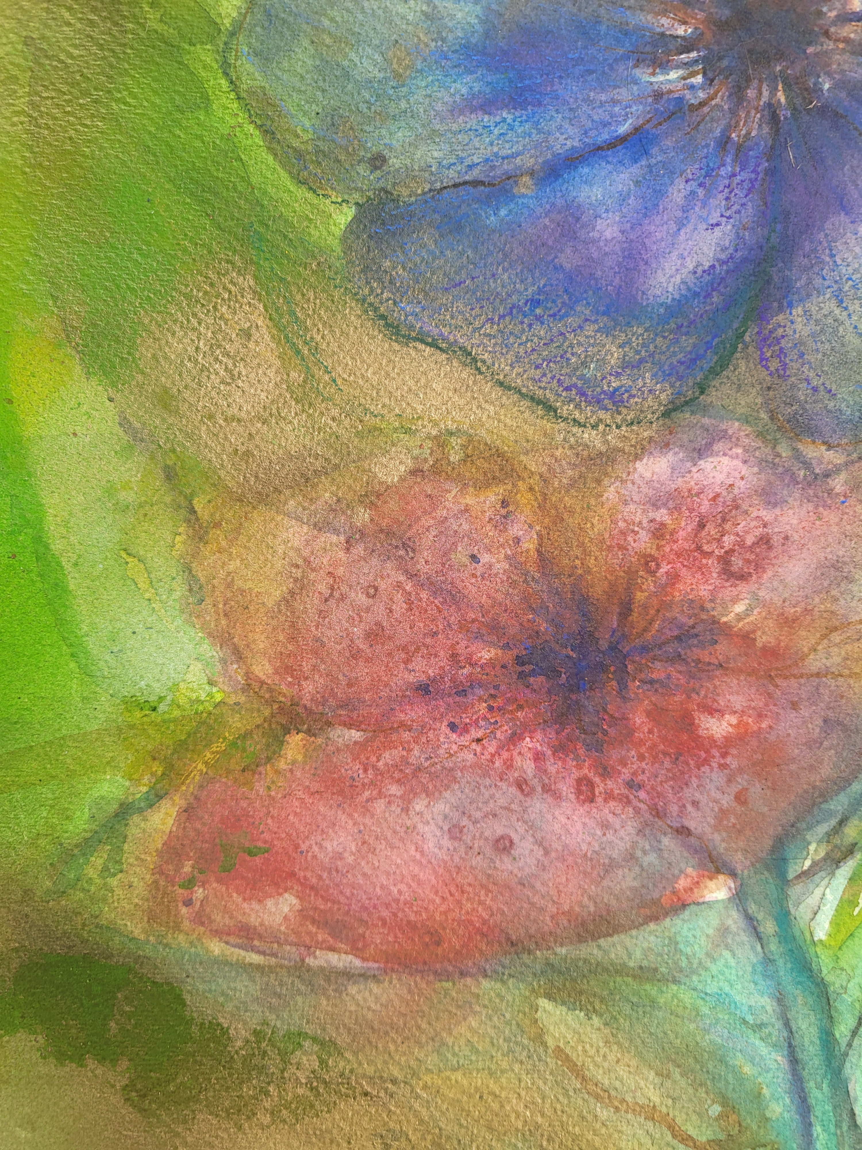 Obraz wykonany w technice mieszanej - akwareli z tuszami i akrylem na papierze akwarelowy o wymiarze 30/ 40 cm, oprawiony w ramkę 43/ 53 cm, Na obrazie dominują intensywne, żywe kolory. W centrum znajdują się dwa kwiaty — niebieski i czerwony. Artysta wykorzystał technikę akwareli, co widać w delikatnym przenikaniu się kolorów.