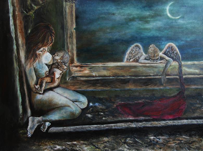 Obraz przedstawia intymną scenę w ciemnej, tajemniczej komnacie. Z lewej strony matka przytula swoje dziecko, otulona błękitnym światłem, które delikatnie rozprasza cienie wokół. Dziecko trzyma się matczynej piersi, a ich bliskość podkreślają ciepłe, ziemiste odcienie. Kolory są stonowane, dominują brązy, ciemne zielenie i zimne błękity. Na horyzoncie widać księżyc w kształcie rogalika, a nieco dalej anioł pochyla się smutno nad balustradą. Coś, co przypomina kopnięty koc, leży na ziemi. Atmosfera jest ciężka, emocjonalnie naładowana i może trochę melancholijna. I feel nostalgic, przypominają się chwile bliskości i samotności. Artysta w mistrzowski sposób łączy realistyczne cieniowanie z delikatnie surrealistycznym motywem anioła, tworząc dzieło pełne kontrastów. Niby prosty obraz, ale budzi głębokie uczucia. Dla dziecka to pewnie obraz jak z bajki: "Pani aniołek smuci się, bo jej koc uciekł!" Malarskie pociągnięcia pędzla oddają niepowtarzalny klimat i nostalgiczne nuty, które długo pozostają w pamięci.