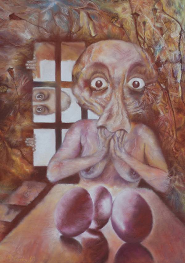 Obraz na pierwszy rzut oka wydaje się być surrealistycznym snem. Dominują w nim ciepłe barwy - brązy, pomarańcze i delikatne czerwienie, które tworzą atmosferę tajemniczości i niepokoju. Kompozycja jest ciekawa, bo główną rolę odgrywa postać o dużych oczach, patrzącą z trwogą wprost na widza. Jej twarz jest wydłużona i zdeformowana, co potęguje poczucie dziwności. Artysta wykorzystał technikę olejną, tworząc tekstury i cienie, które dodają głębi całej scenie. Z okna spogląda ktoś inny... czy to możliwe, że to tylko odbicie? Obraz, jakby chciał opowiedzieć własną historię, czasem potrafi przestraszyć, ale też zaintrygować. W tej przestrzeni "magic" spotyka zwyczajność, nie ma miejsca na nudę. Patrząc na to dzieło, widz może poczuć zarówno fascynację, jak i niepokój. Osobiście odczuwam pewien dyskomfort, ale i ciekawość. Co artysta chciał nam przekazać? Jedno z niewinnych pytań dziecka mogłoby tu zabrzmieć: "Dlaczego ten pan ma takie duże oczy?". Obraz skłania do refleksji, zostawiając nas z pytaniami bez odpowiedzi i uczuciem, że coś umknęło naszej uwadze.
