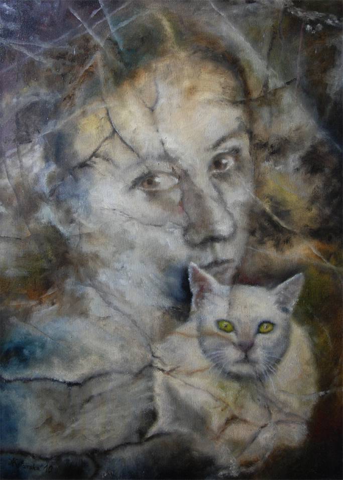 Na obrazie dominują stonowane kolory – szarości, błękity i brązy splatają się w harmonijną kompozycję. Twarz osoby, subtelnie wtopiona w tło, emanuje spokojem i tajemnicą. Obok niej widoczny jest kot o przenikliwych zielonych oczach, które przyciągają wzrok niczym magnes. Kompozycja jest nieco zamglona, jakby rozmyta, co nadaje dziełu oniryczny charakter. Atmosfera obrazu to nostalgia i spokój, ale z nutą niepokoju. Technika artystyczna sprawia wrażenie delikatnego pociągnięcia pędzlem, z lekkimi śladami impresjonistycznego stylu. To taki dreamy nastrój, gdzie rzeczywistość miesza się z iluzją. Obraz zachęca do zastanowienia się i refleksji nad ulotnością chwili. Może wywoływać poczucie tęsknoty za tym, co nieosiągalne. Albo po prostu dom i kot. Ale fajnie! Dzieło zdaje się przemawiać do emocji w sposób subtelny, ale stanowczy. Przypomina chwile, kiedy patrzymy na coś pięknego i czujemy, że nie chcemy, aby ten moment się skończył.