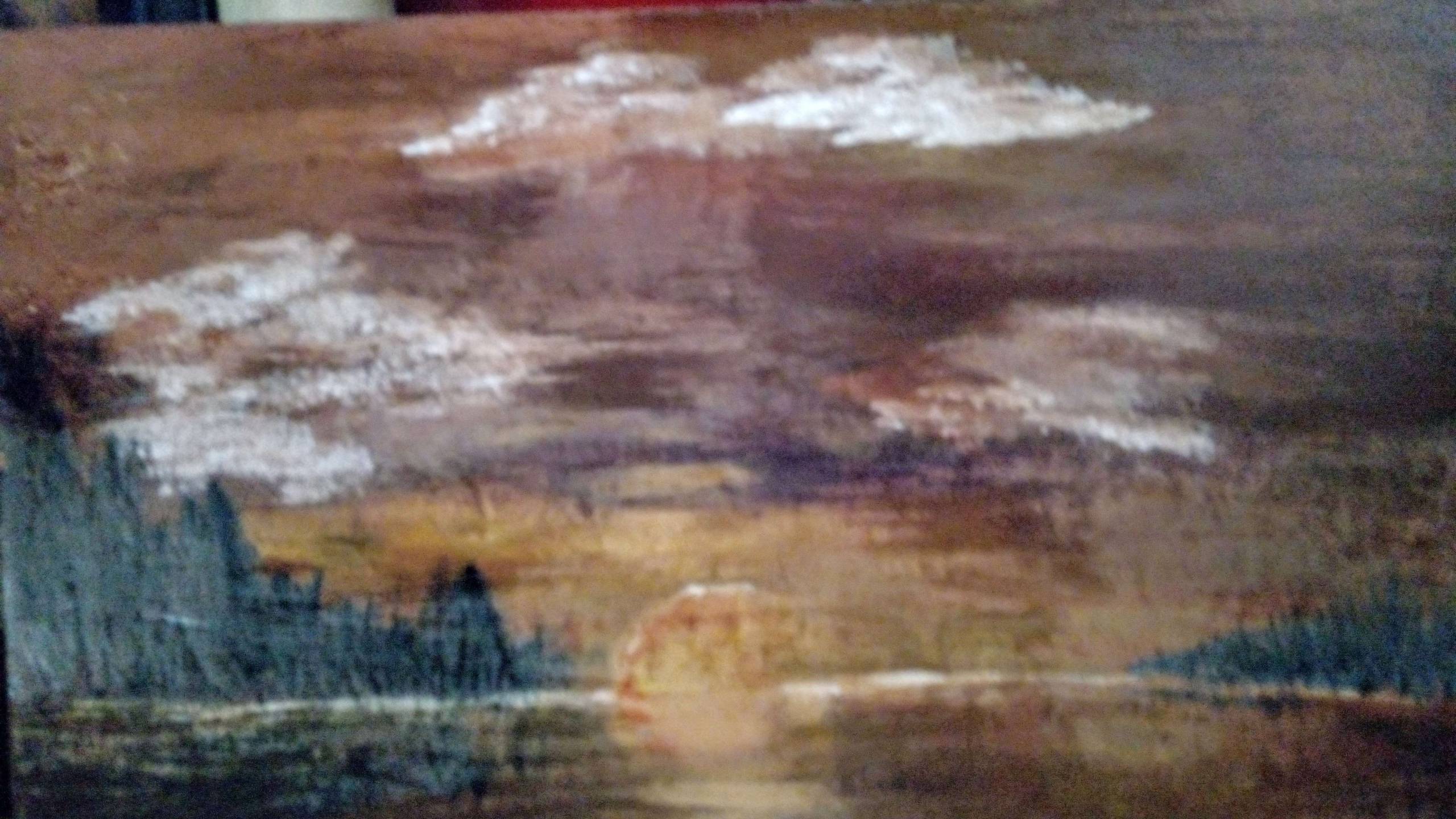 Na obrazie widzimy magiczny zachód słońca nad spokojnym jeziorem. Dominują ciepłe odcienie brązu, złota i pomarańczu, które nadają całości nostalgiczny, letni nastrój. Chmury, jak z baśni, snują się po niebie, dodając malowniczego uroku. Wyraziste refleksy słońca na wodzie przyciągają wzrok, tworząc wrażenie głębi. Kompozycja ma w sobie coś z impresjonizmu, choć artysta zdaje się flirtować z abstrakcją. Pociągnięcia pędzla są miękkie i lekko rozmyte, co sprawia, że obraz wydaje się żyć własnym życiem. Można poczuć lekki powiew bryzy i usłyszeć szum fal. Ej, ale ładne te chmurki. Jest coś hipnotyzującego w tym dziele. Feeling, który przenosi nas w świat spokoju i harmonii. Może to komuś przypominać wakacyjne chwile nad jeziorem, pełne beztroski i marzeń. Obraz budzi tęsknotę za czasami, kiedy wszystko było prostsze. To cudowne uchwycenie ulotnego momentu, który na chwilę zatrzymuje czas.