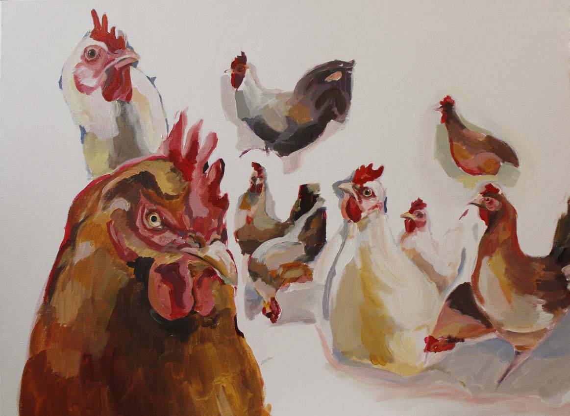 Obraz przedstawia grupę kur na tle jasnego, neutralnego tła, które sprawia, że ptaki stają się głównym punktem całej kompozycji. Kolory są ciepłe i ziemiste, z dominacją odcieni brązu, bieli i czerwieni, które nadają całości żywego charakteru. Kurki wyglądają, jakby były w ruchu, ich pióra są niedbale pociągnięte pędzlem, co dodaje obrazu dynamiki. Artysta użył techniki impasto, gdzie grube warstwy farby tworzą teksturę niemalże dotykalną, co wzmacnia wrażenie chaosu i energii bijącej od scenerii. Patrząc na ten obraz, czuję się jak w starym wiejskim gospodarstwie, gdzie czas płynie wolniej. Kurki zdają się jakby szeptać do siebie, tworząc atmosferę swojską i przytulną. To scena, która przypomina mi dzieciństwo. Siedmioletnie dziecko pomyślałoby: "Kurki są fajne, bo są kolorowe!" Ten obraz jest żywy jak "morning coffee", daje poranny zastrzyk energii. Wywołuje on we mnie uśmiech i momentalnie poprawia nastrój. Ciekawe, jak artysta uchwycił codzienną scenę w tak wyrazisty sposób.