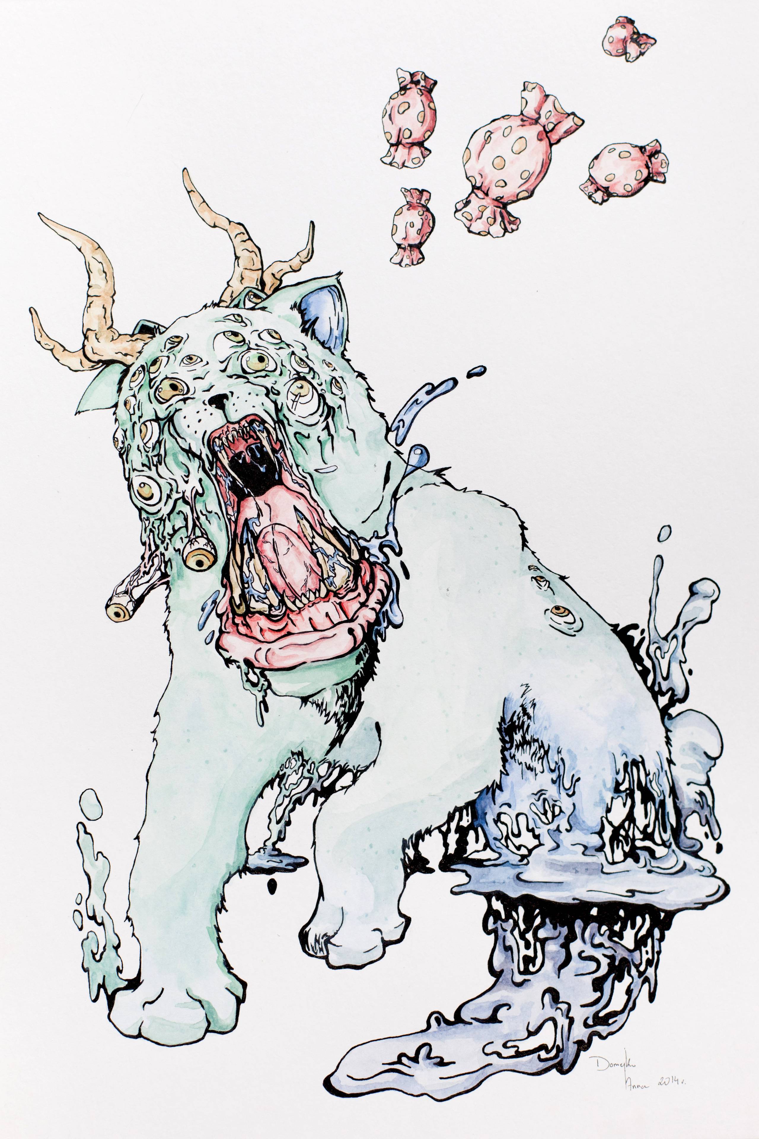 Ten obraz to fantastyczne połączenie surrealizmu i nieco przerażającej wyobraźni. W centralnej części widzimy wielką, lodowo-niebieską postać przypominającą kota, jednak z licznymi oczami rozmieszczonymi na całej powierzchni ciała. Jej otwarta paszcza, pełna ostrych zębów, zdaje się wykrzykiwać w niemym przerażeniu. Na głowie wyrastają ciemne rogi, które dodają całemu obrazowi chaosu i niepokoju. Obok unosi się kilka różowych cukierków, które wydają się niemal groteskowe w swym położeniu. Całość skomponowana jest w delikatnych kolorach akwareli, co kontrastuje z dynamiczną i niepokojącą formą środkowego motywu. Artysta użył techniki cienkiej, precyzyjnej kreski, by dodatkowo podkreślić szczegóły i nadać postaci niemal organicznego wyglądu. Ta scena wywołuje uczucie zagubienia i niepewności, jakby patrząc na nią, widz był przenoszony do innego, obcego wymiaru. Czuję się trochę, jakby ktoś wyrwał fragment ze snu - takiego, gdy ścigają cię dziwne stwory, ale one są jednocześnie fascynujące. Czasami sztuka może wywoływać takie sprzeczne emocje, prawda? To jest jak "weird" w najlepszym wydaniu. Moje dziecko powiedziałoby, że to obraz potwora muminków, bo one też są trochę straszne. To, co czyni ten obraz naprawdę niezwykłym, to jego zdolność do wzbudzania żywych emocji i zadawania pytań - co to, u licha, wszystko ma znaczyć?