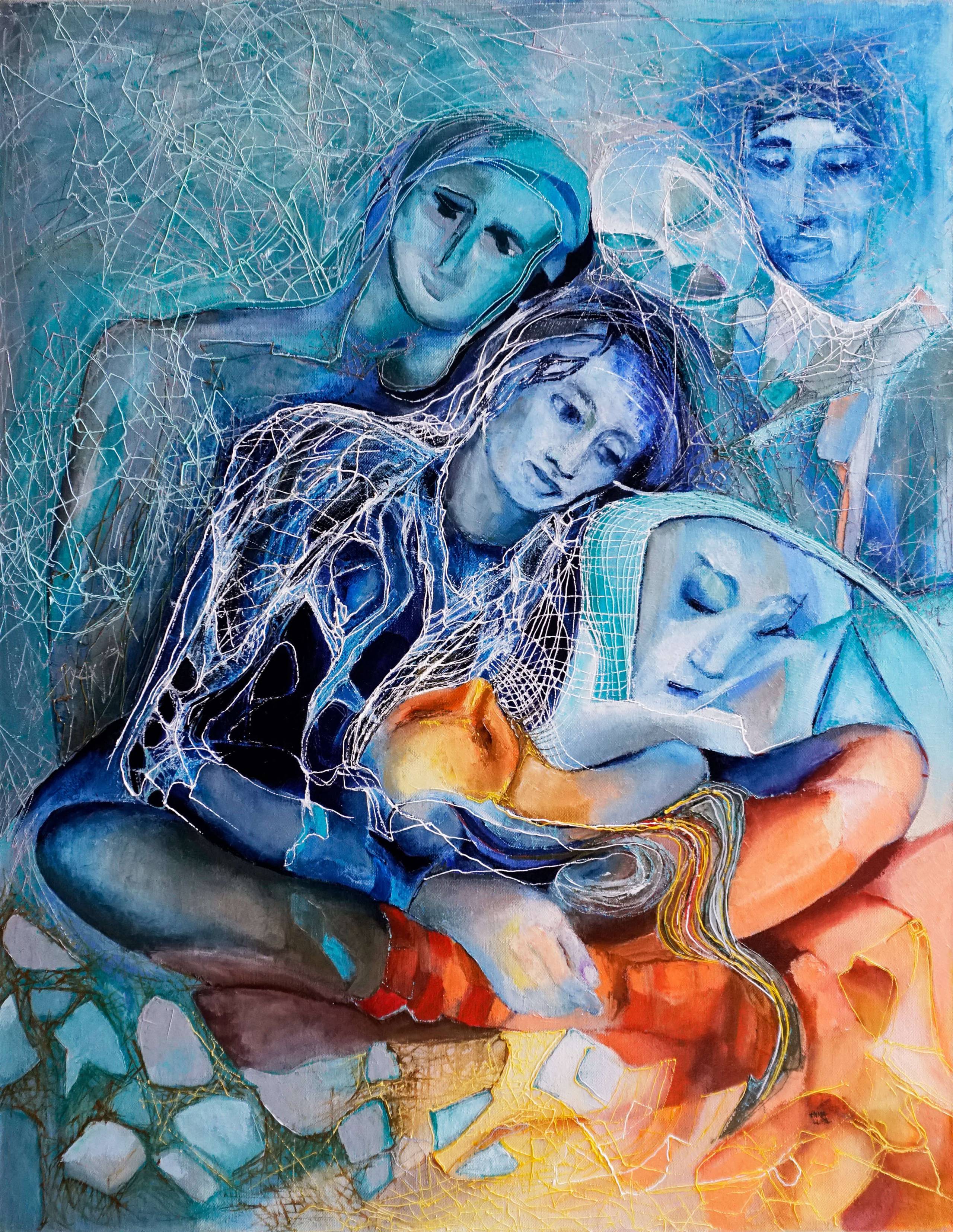 Na obrazie dominują chłodne odcienie niebieskiego, które przeplatają się z ciepłymi tonami pomarańczy i żółci. Kształty są płynne, postacie zdają się być splecione niczym w tańcu. Całość tworzy kompozycję, która przyciąga wzrok swoją harmonią. Atmosfera obrazu jest spokojna, nieco melancholijna, jakby zatrzymana w czasie chwila refleksji. Malarska technika, z użyciem subtelnych pociągnięć pędzla, nadaje dziełu delikatność i intymność. A to „web” tkaniny nałożonej na postacie dodaje głębi. Obraz budzi emocje, które można opisać jako tęsknotę za bliskością i zrozumieniem. Wygląda jak magiczne marzenie, które każdy chciałby mieć. Może wzbudzać poczucie spokoju, lecz również smutek wynikający z izolacji. Wyobraźnia prowadzi nas ku interpretacji, że to scena ze snu, w którym wszystkie troski znikają. Zdanie, które mogłoby napisać dziecko: „Te osoby wyglądają, jakby były przyjaciółkami z krainy lodu i słońca”. Artysta zastosował kontrasty świetlne, które przyciągają od pierwszego spojrzenia. Ten obraz jest jak uczucie, które się pamięta długo po jego obejrzeniu.
