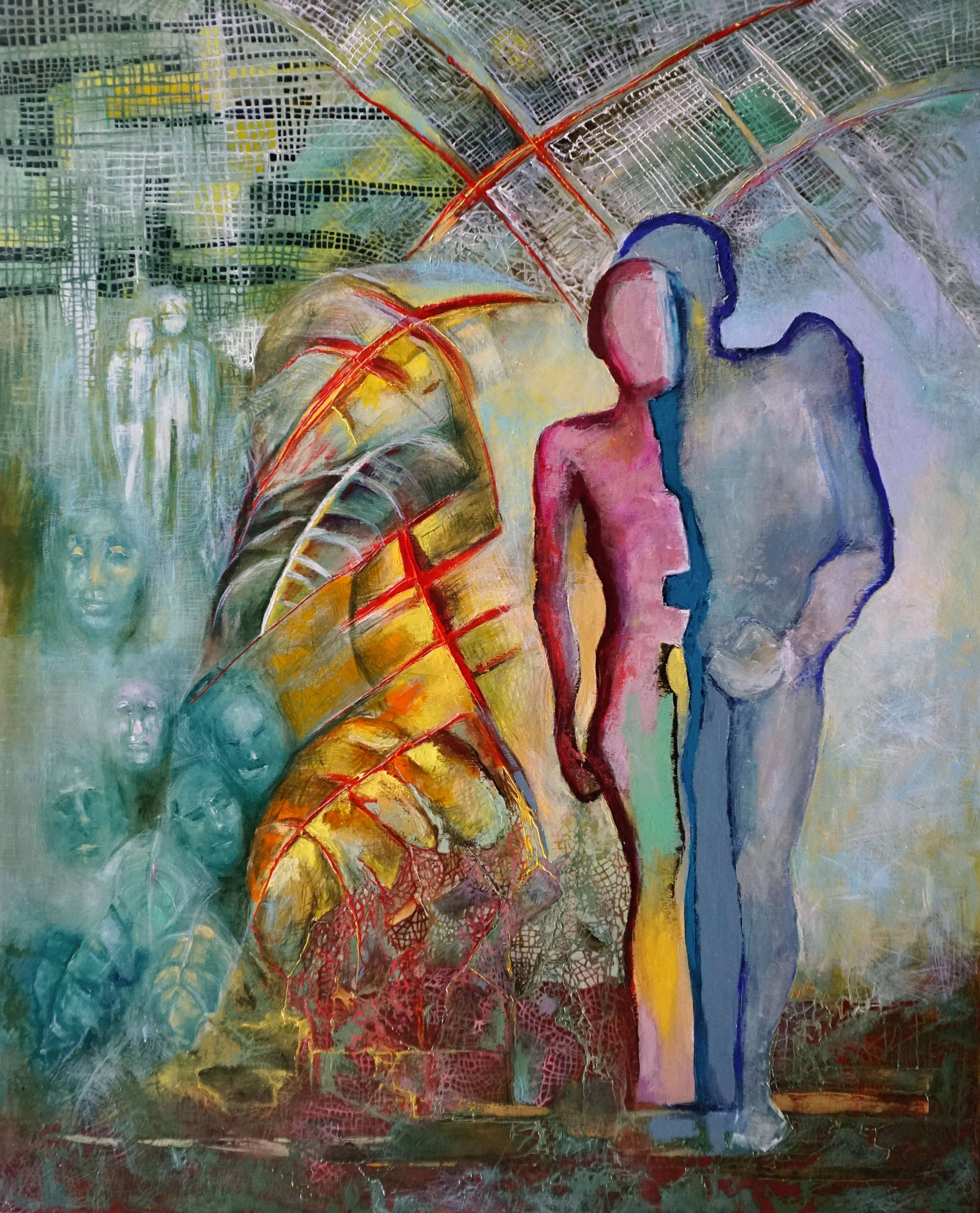 Obraz hipnotyzuje feerią barw i fantazyjnych kształtów. Postacie po prawej stronie są jakby ze snu, złożone z kontrastujących odcieni. Pastelowe róże i błękity mieszają się z intensywnymi żółciami i czerwieniami, tworząc paletę pełną życia. A tło? Przeplatane liniami niczym sieć geometrycznych korytarzy. Klimat jest nieco nostalgiczny, przypomina senne marzenia. Trochę jak z kosmosu, a trochę jak z komputerowego dreamlandu. Artystyczna technika? Mieszanka abstraktu i surrealizmu, łączenie gładkich powierzchni z fakturowanymi detalami daje niepowtarzalny efekt. Podziwiając te formy, można poczuć niejasny niepokój. Może te postacie to my, zagubieni w labiryncie codzienności? Myślę o tym, jak czasem życie jest tak chaotic. I nagle przypomina mi się zdanie: "Tam są duchy!" - to jakby echo dziecięcej wyobraźni budzące się w dorosłych. Kompozycja prowokuje do zadumy, zmusza do refleksji nad tym, kim jesteśmy. Ten obraz to nie tylko piękno wizualne, ale też emocjonalna podróż.