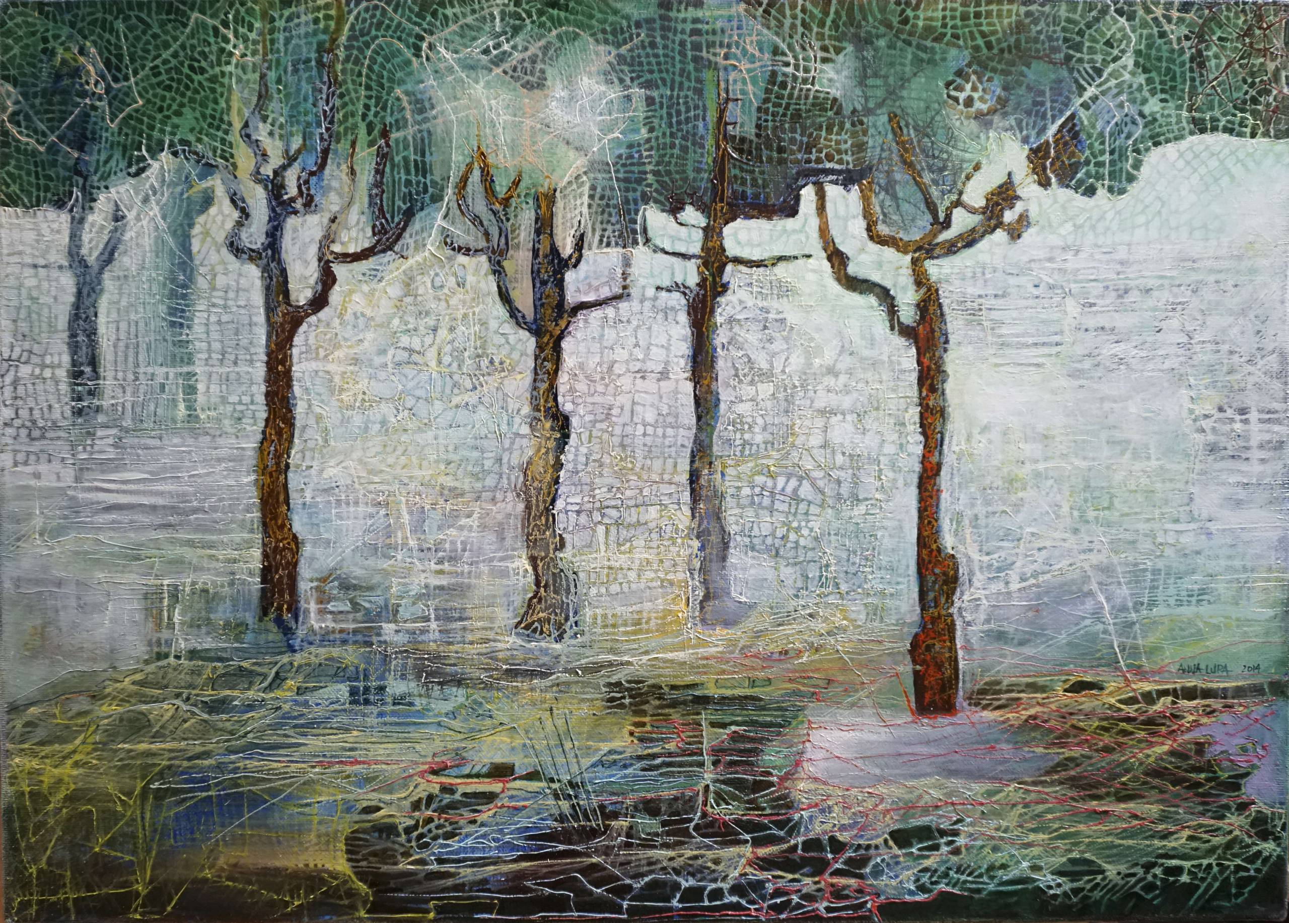 Obraz jest pełen tajemniczości i delikatnej poetyki. Dominują na nim zielenie i brązy, które płynnie przeplatają się z bielami i jasnymi błękitami. Drzewa, z ich surowymi pniami i rozgałęzionymi koronami, wirują na tle jakby z mgły wykonanym. Ich kora wygląda niemal żywicznie, zdradzając pewną szorstkość i siłę. Całość kompozycji jest dynamiczna, jakby artysta chciał uchwycić ruch natury, choć zatrzymany w chwili. Jest tu coś z chaosu, ale i niebywałej harmonii, który wciąga widza w krąg spokojnej refleksji. Styl obrazu nasycony jest teksturą, można by rzec impasto, co dodaje dziełu głębi i trójwymiarowości. Patrząc na ten obraz, przypominasz sobie spacery po lesie, gdy wszystko jest takie quiet. Sposób, w jaki kolory splatają się ze sobą, przyciąga spojrzenie, niemal hipnotyzując. Obraz może wywołać nostalgiczne wspomnienia, może tęsknotę za chwilami w lesie. W dziecięcym stylu można by stwierdzić: drzewka jak z bajki rzucają czary. To dzieło pełne ciszy, refleksji, jakby przemawiało szeptem do każdego, kto znajdzie chwilę, by przy nim przystanąć i pomyśleć, co właściwie czyni nas tak przywiązanych do natury. Jest w nim coś, co porusza serce.