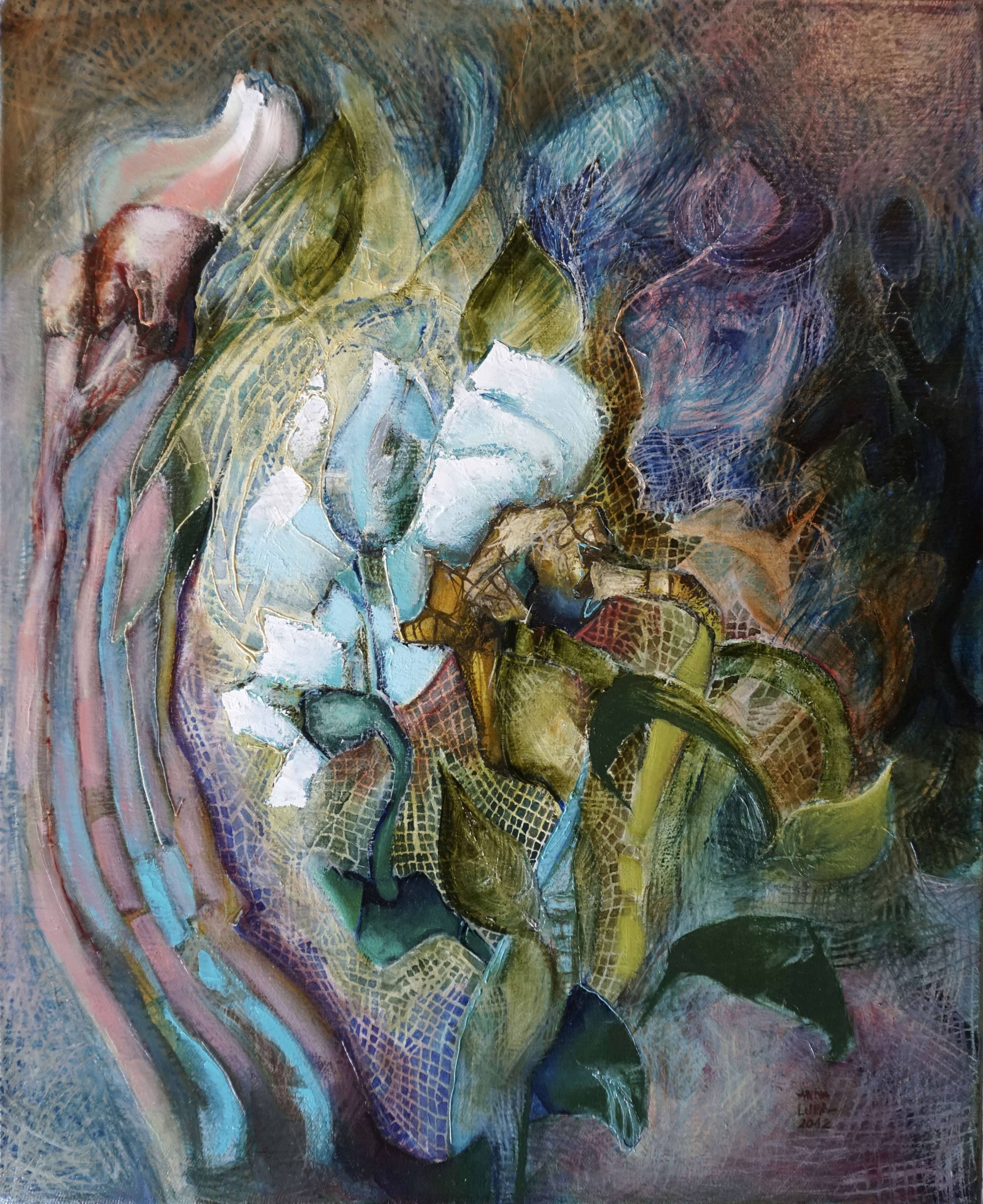 Ten obraz to prawdziwa mieszanka kolorów i kształtów, które zdają się tańczyć na płótnie. Przemieszane odcienie zieleni, błękitu i purpury tworzą świat pełen tajemnic. Kompozycja jest dynamiczna, pełna falujących, organicznych linii przypominających splątane rośliny albo morskie fale. W samym centrum dostrzegamy plamy białej farby, które przyciągają wzrok niczym latarnie w ciemną noc. Atmosfera obrazu jest magiczna, tchnie spokojem i niepokojem jednocześnie. Czujemy się jakbyśmy zaglądali do świata marzeń, gdzie wszystko jest możliwe. Artystyczne techniki, jak warstwowe nakładanie farb i tekstur, dodają głębi i złożoności. Efekt to mieszanka abstrakcji i subtelnego realizmu, która intryguje i zmusza do zadumy. To obraz, który można interpretować na wiele sposobów. Dla jednych będzie to pejzaż z innej planety, dla innych – symboliczne przedstawienie emocji. Dziełko wywołuje w nas nostalgię i ciekawość. Mała dygresja – "Wow, to jest jak magiczny ogród, mamo!”. Poruszająca wizualna opowieść skłania do zatrzymania się na chwilę i zadania sobie pytania, co artysta miał na myśli. Trochę tajemniczy, a na pewno captivating.