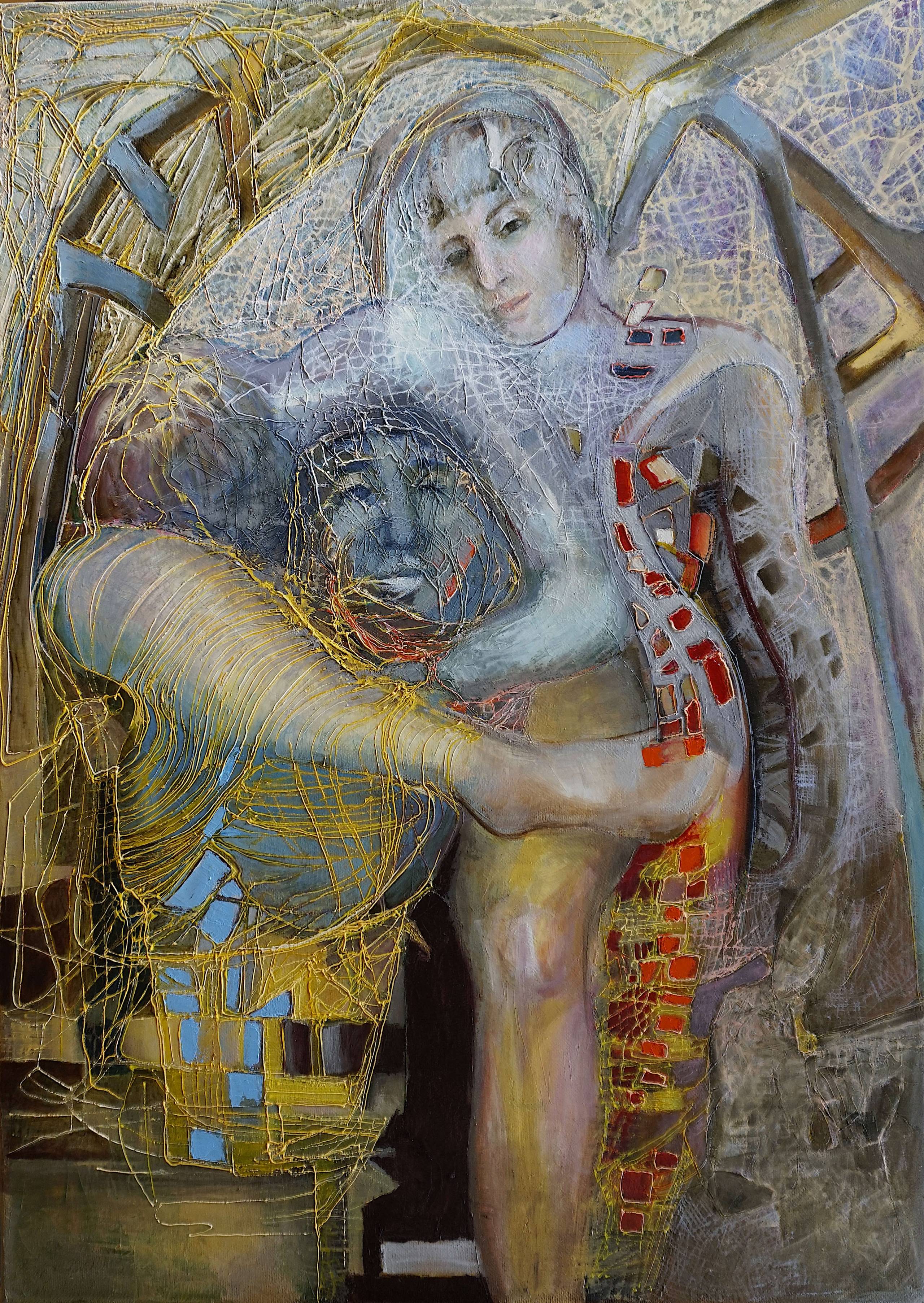 Obraz jest jak mozaika marzeń, gdzie delikatne barwy przeplatają się z żywymi czerwieniami i złocistymi nitkami. Centralna postać przyciąga wzrok, przypominając zagubionego anioła otoczonego tajemniczym światłem. Wszystko to spowite w misternie splecioną sieć, jakby czas i przestrzeń same się poskładały jak puzzle. Klimat dzieła jest pełen nostalgii, ale też pewnego rodzaju spokoju. Może to nostalgia za utraconym snem, a może jedynie cisza po burzy. Artysta stosuje technikę na pograniczu surrealizmu, tworząc coś jednocześnie bardzo osobistego i uniwersalnego. Te wszystkie rozciągnięte linie i krzywe formy mogą wzbudzać poczucie zagubienia, ale też fascynacji. "Czemu ten pan ma takie smutne oczy?" - mogłoby zapytać dziecko. Obraz może sprawiać, że odbiorca poczuje się jakby ktoś delikatnie wsunął mu rękę do serca. Jest w tym coś magic, jakby na chwilę czas się zatrzymał, pozwalając nam zajrzeć trochę głębiej w siebie.