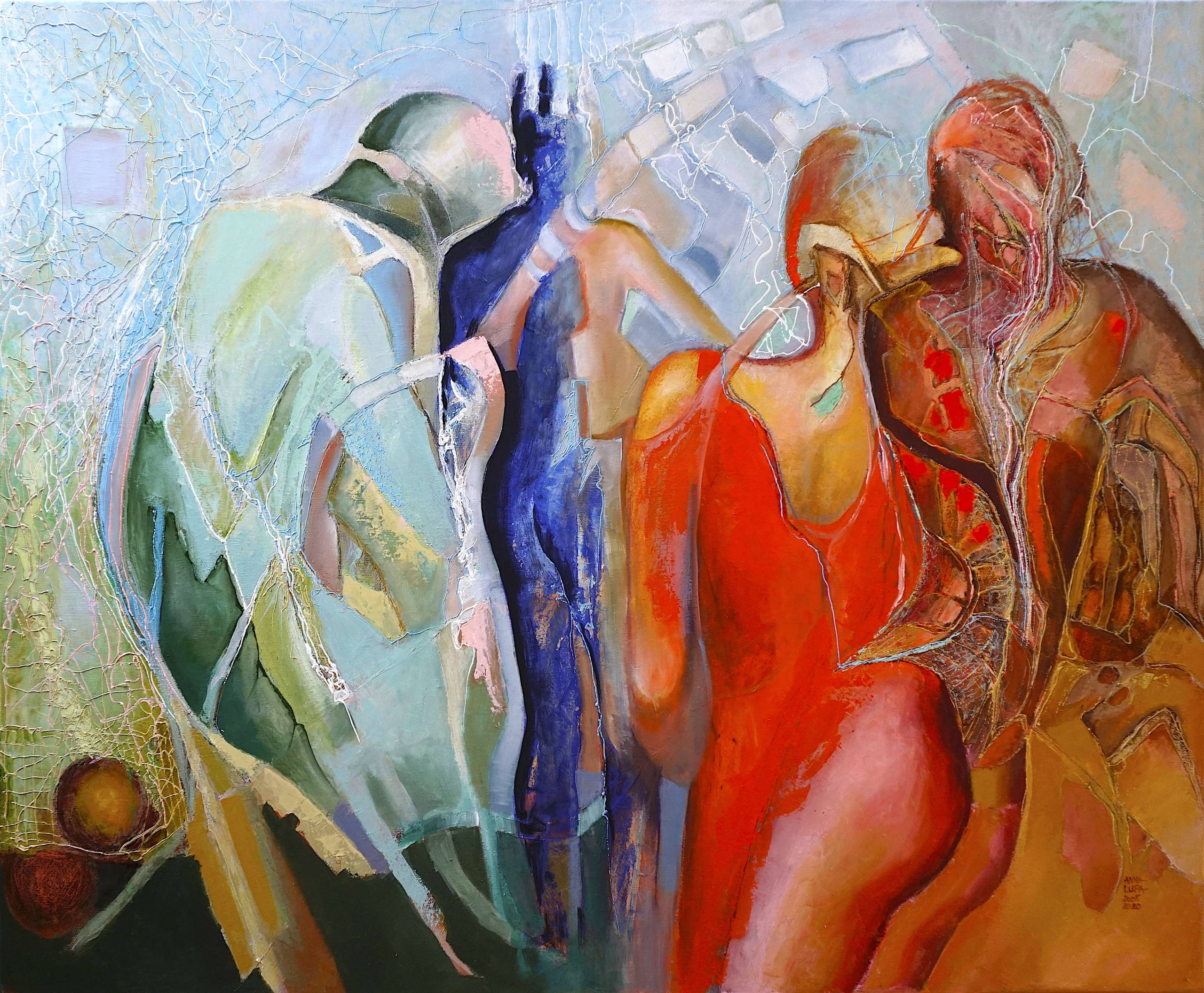 Obraz przedstawia kalejdoskop barw, gdzie dominują odcienie zieleni, niebieskiego i pomarańczy. Kształty są dynamiczne, nieregularne, płynne jak w kalejdoskopie. Ta abstrakcyjna kompozycja wygląda jakby artysta uchwycił ruch w samym jego centrum. Malowidło emanuje aurą tajemnicy i delikatnego napięcia, które przyciąga spojrzenie. Czy to taniec czy rozmowa? Atmosfera jest raczej melancholijna, ale i pełna energii. Styl artysty przypomina ekspresjonizm abstrakcyjny - są śmiałe pociągnięcia pędzla i wyraźna tekstura farby na płótnie. Emocje? Ja tam czuję jakby sztuka łapała oddech życia. Interpretacje mogą być różne, ale dzieło z pewnością prowokuje do refleksji. Taka eksplozja kolorów może budzić radość i nostalgię jednocześnie. Wow! Nawet dziecko patrząc by wykrzyknęło "Ale to kolorowe!" Jest coś magicznego w tym jak te kształty się przenikają, a kolory łączą. To jest jak harmonious chaos, taki kontrolowany, ale i pełen niespodzianek. Zaskakujące i piękne zarazem.