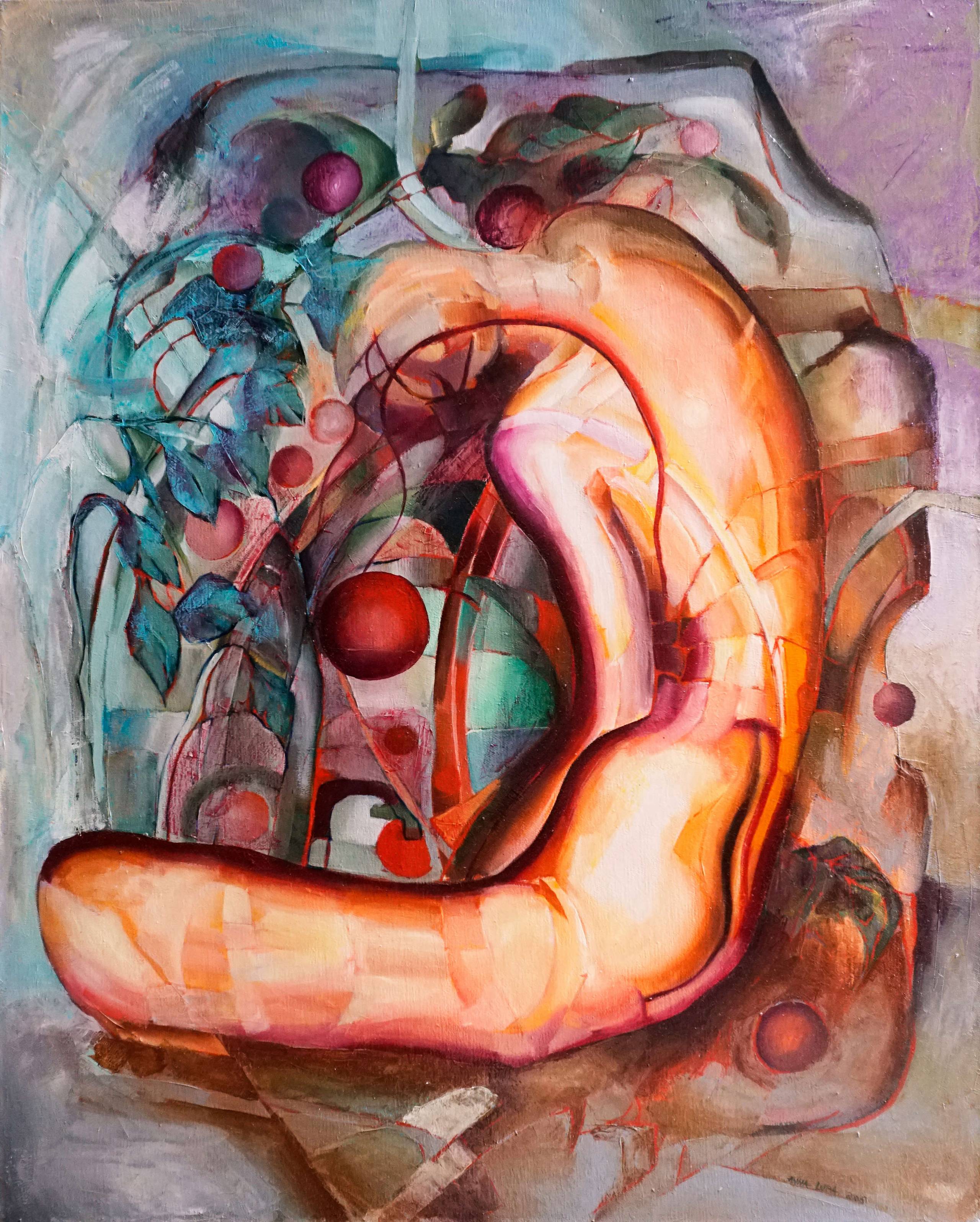 Na obrazie dominują odcienie pomarańczu i fioletu, splecione w dynamicznej kompozycji pełnej zaokrągleń i nieoczywistych kształtów. Wszechobecne krzywizny tworzą formę przypominającą abstrakcyjne przedstawienie ciała, które przeplata się z liśćmi i kulistymi elementami. Całość emanuje tajemniczym, nieco eterycznym nastrojem. Może czujesz się jakbyś zaglądał do innego świata, w którym wszystko jest płynne i nieuchwytne. Artysta zaskakuje nas techniką, łącząc olejne, rozmyte kontrasty i żywe detale. Jest w tym coś bardzo dreamlike, jakbyśmy śnili na jawie. Ktoś mógłby powiedzieć - o, to wygląda jak magiczna dżungla. Ukryte drobiazgi i subtelna gra światła sprawiają, że obraz zdaje się żyć własnym życiem, a odbiorca czuje się zaproszony do jego odkrywania. Każdy patrzący może interpretować to inaczej - może to być walka lub embrionalny początek czegoś nowego. A może to po prostu pomarańczowy wąż wśród jagód? Obraz porusza, intryguje i zaprasza do refleksji nad ukrytymi znaczeniami.