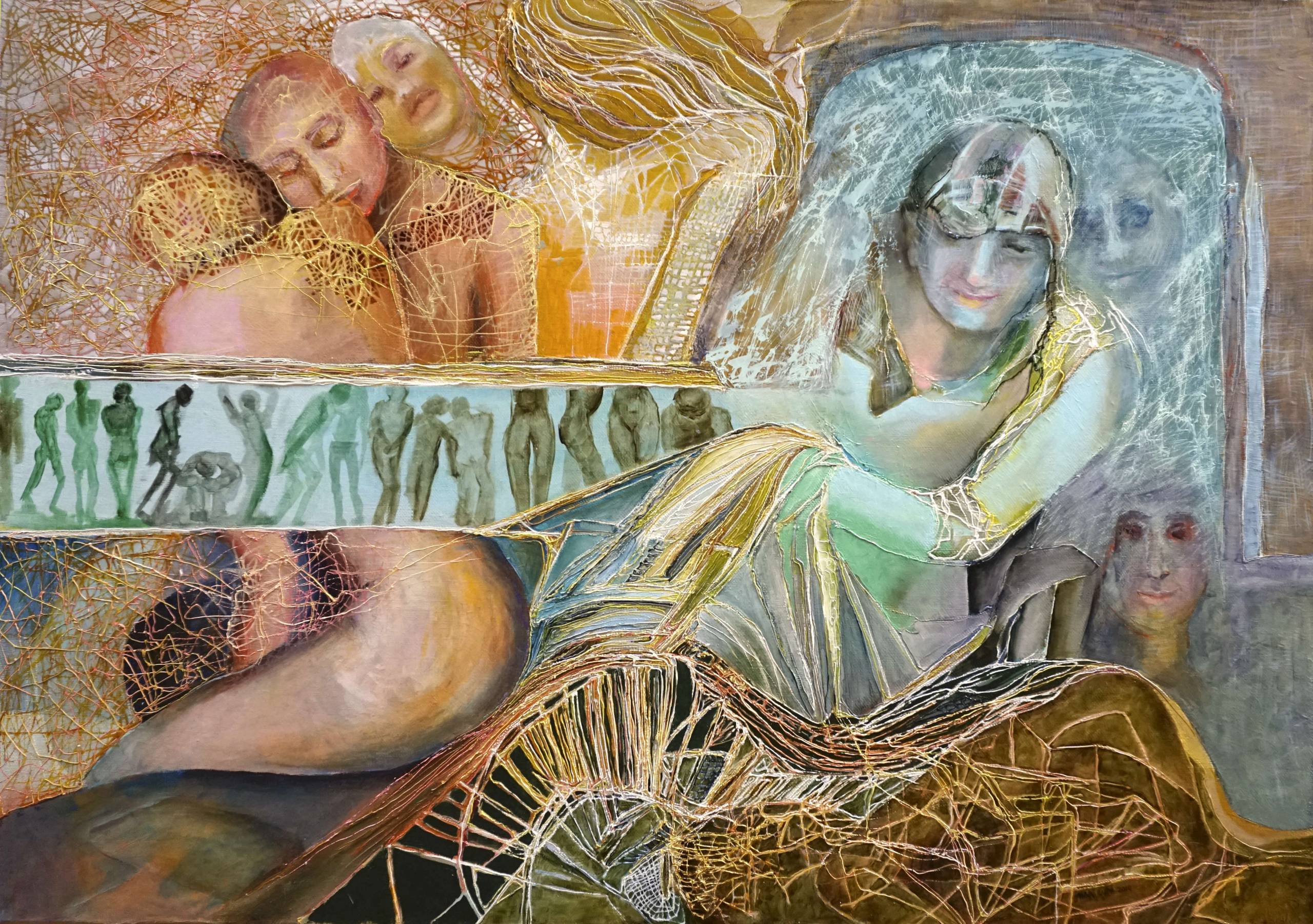 Obraz hipnotyzuje feerią kolorów i zawiłą kompozycją, gdzie dominują ciepłe odcienie złota i zimniejsze błękity. Postacie zdają się zatapiać w plecionych teksturach, które przywodzą na myśl pajęcze sieci łączące marzenia z rzeczywistością. To dzieło bije nostalgią i odrobiną tajemnicy, jak wieczór spędzony na rozmyślaniach o tym, gdzie zmierzają nasze kroki. Artysta wykorzystuje technikę łączenia klasycznych motywów z dynamicznymi liniami, które przykuwają wzrok i sprawiają, że każdy centymetr płótna ma swoje życie. Emocje tu? Hm, trudne do uchwycenia w jednym słowie, ale there's a sense of longing, jakby postacie poszukiwały sensu w chaosie. Krótka historyjka: „Pan siedział i był smutny, bo było mu zimno”. To refleksyjne spojrzenie na kształty człowieczeństwa i wzajemne relacje. Kontury postaci, choć delikatnie zakreślone, niosą z sobą ciężar ludzkich odczuć. Sztuka tu nie boi się być nieco roztrzepana, jak ja czasem, ale to czyni ją tylko bardziej prawdziwą. Odbiorca może zanurzyć się w niej jak w melodyjnej symfonii, odkrywając nowe znaczenia za każdym spojrzeniem.