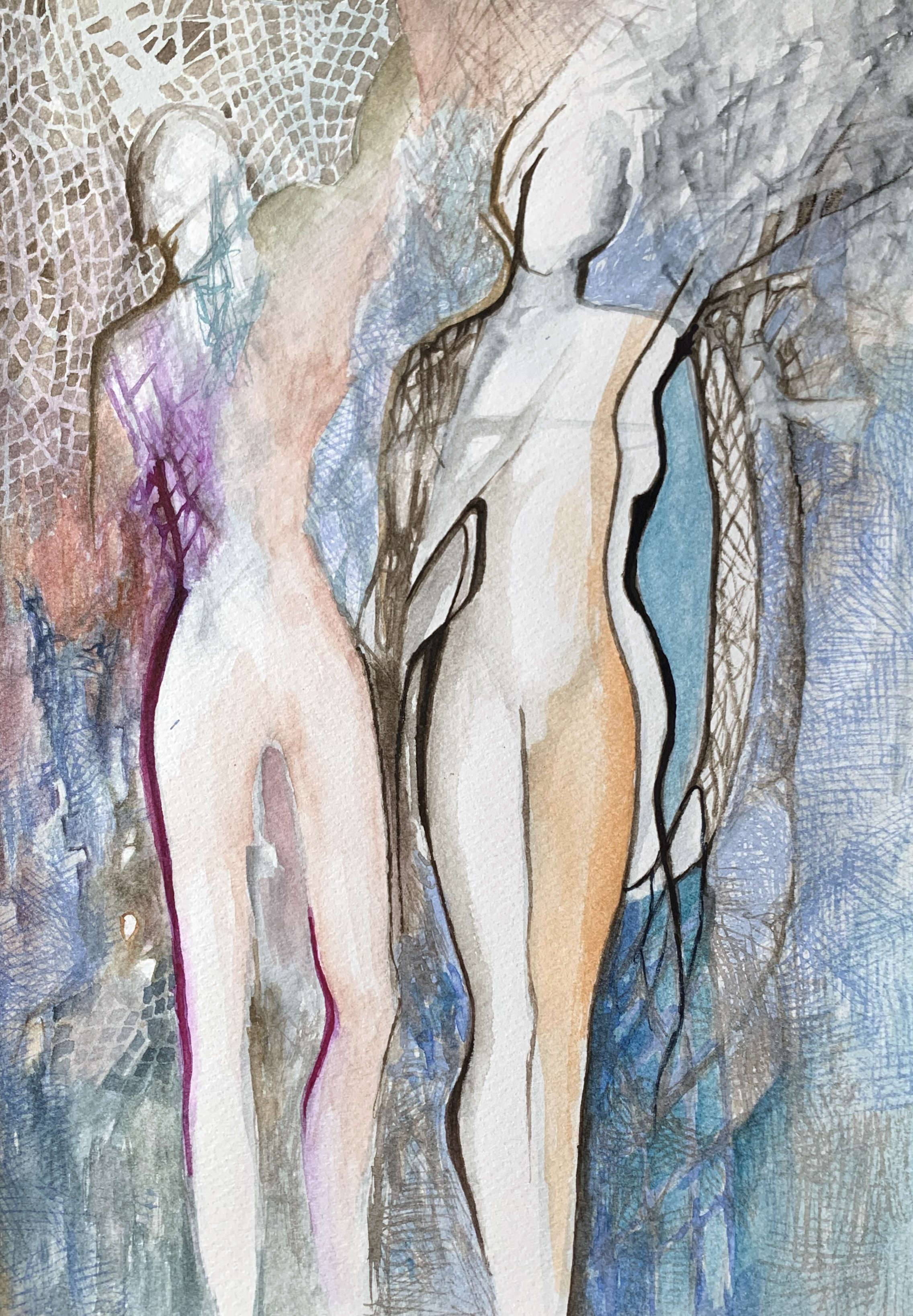 Akwarela oprawiona w passe-partout o wymiarze zewnętrznym 30 x 40 cm.