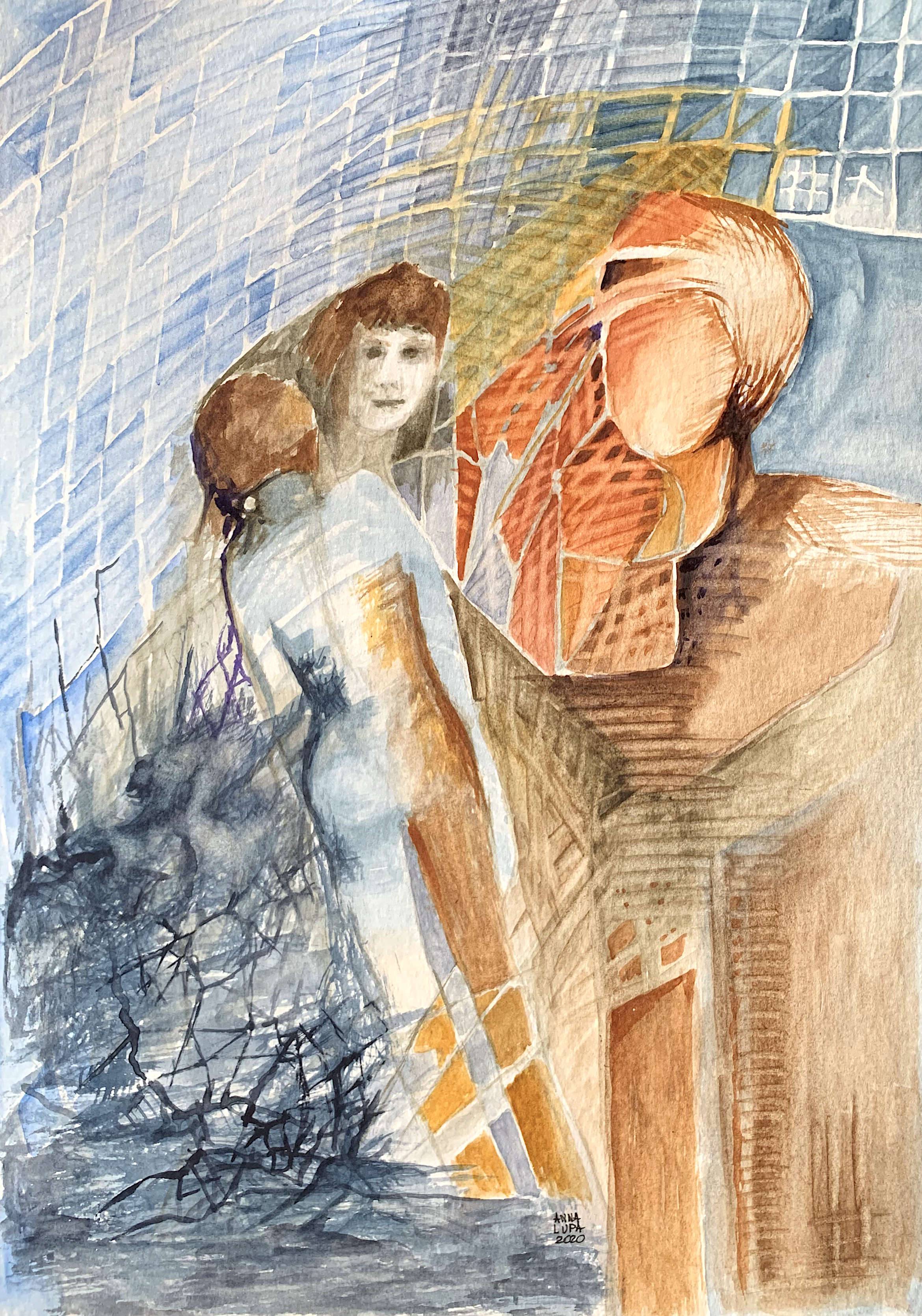 Akwarela oprawiona w passe-partout o wymiarze zewnętrznym 30 x 40 cm.