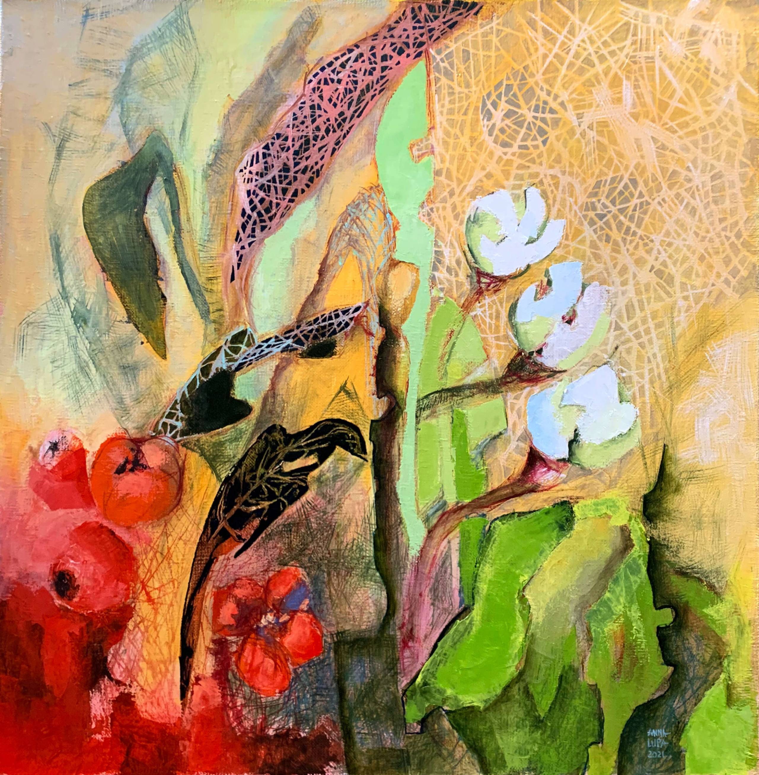 Na obrazie dominuje harmonijna mieszanina ciepłych i zimnych kolorów. Przejścia między czerwieniami, zieleniami i żółcieniami tworzą dynamiczną kompozycję. Rozległe, abstrakcyjne kształty przypominają fragmenty natury – liście, gałązki, kwiaty. Centralnie umieszczone białe formy zwracają uwagę, kontrastując z ciemniejszymi tonacjami w tle. Styl jest nieco chaotyczny, jakby artysta prowadził swój pędzel z intuicją, zamiast z precyzyjnym planem. Atmosfera jest pełna energii, jakby obraz pulsował życiem. Czujesz, że to miejsce, gdzie czas się zatrzymał, a kolory zaczynają swoją magiczną 'dance'. Techniki użyte przez artystę to połączenie impastu i delikatnych pociągnięć, dzięki czemu dzieło zyskuje na głębi. Emocje? Wow, jest ich mnóstwo! Można poczuć spokój, ale też jakieś nieodparte napięcie. Jak na to patrzę, zastanawiam się nad nieskończonością natury. Jak 7-letnie dziecko powiedziałoby: "To wygląda jak kraina czarów!". Ten obraz uderza w nuty zarówno nostalgiczne, jak i ekscytujące, pozwalając na osobiste refleksje na temat ulotności momentów. Memo to self: czasem chaos jest piękny.