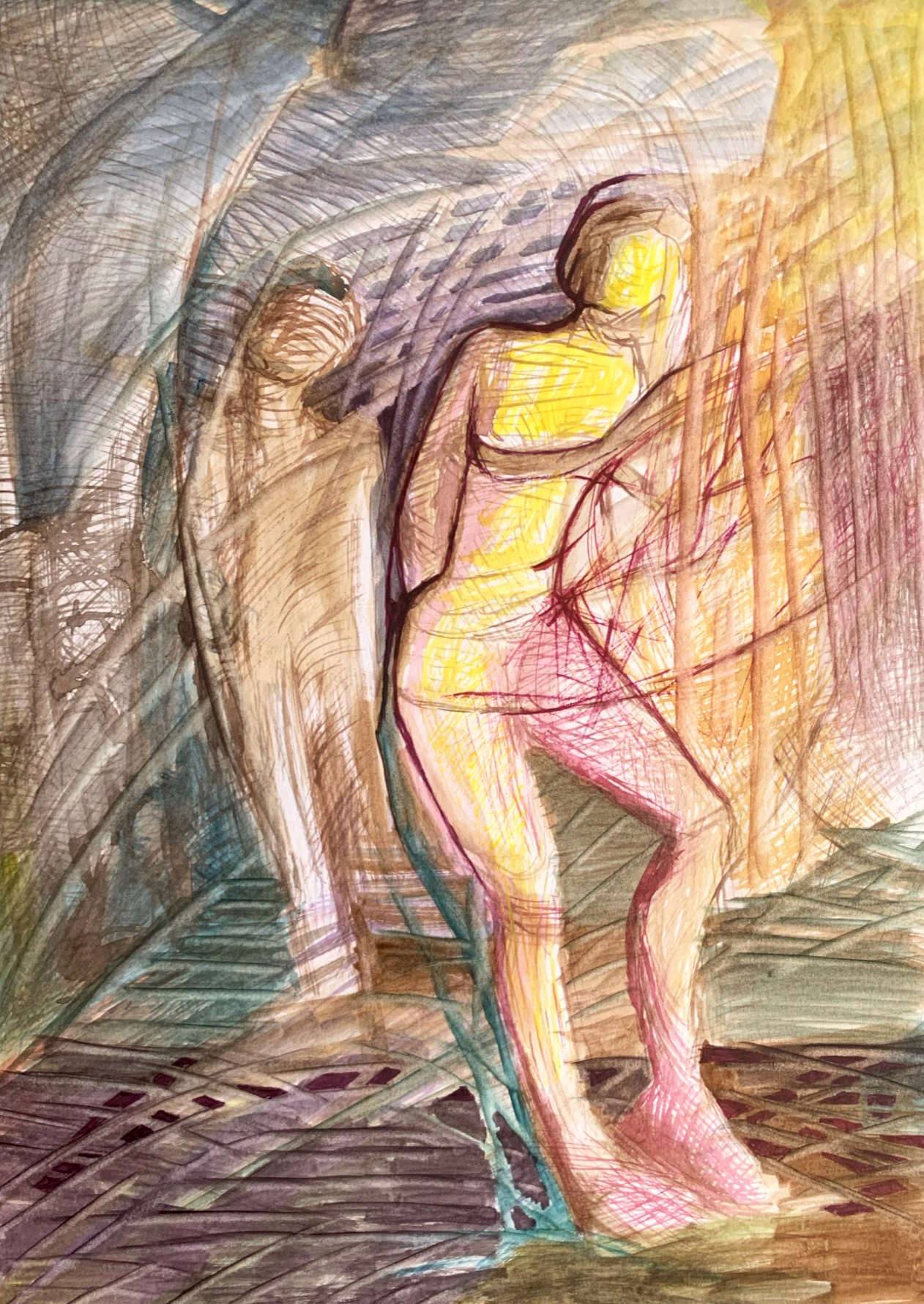 Akwarela oprawiona w passe-partout o wymiarze zewnętrznym 30 x 40 cm.