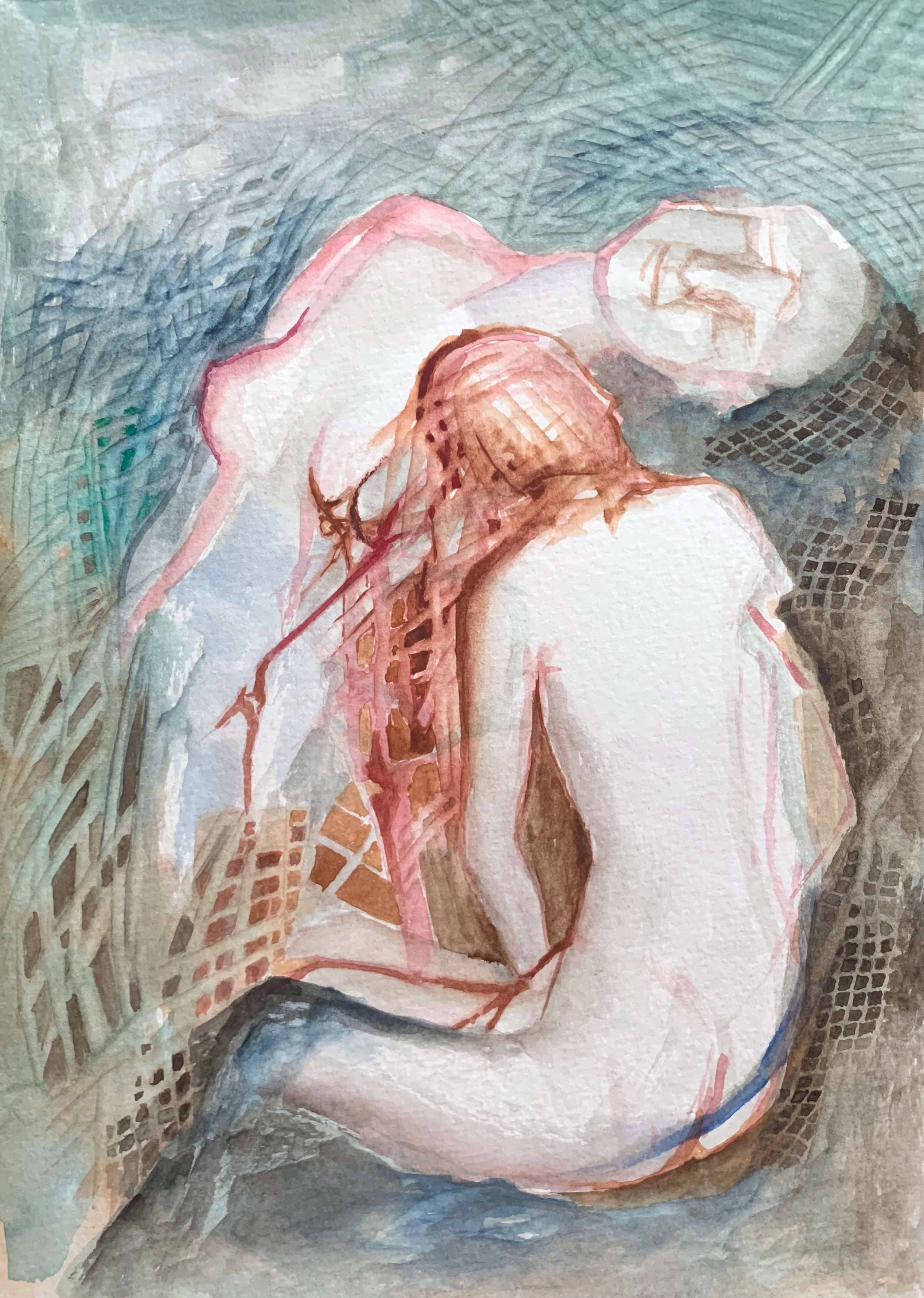 Akwarela oprawiona w passe-partout o wymiarze zewnętrznym 30 x 40 cm. Obraz emanuje delikatnością i subtelnością. Na pierwszy rzut oka przyciąga pastelowa paleta kolorów, dominują lekkie odcienie różu i błękitu. Te barwy harmonijnie przeplatają się z gładkimi, miękkimi liniami, które tworzą finezyjne kształty. Wzór na tle przypomina delikatne tkanie, co dodaje kompozycji głębi. Atmosfera jest spokojna, momentami wręcz melancholijna. Można by rzec, że patrząc na obraz, czuje się jak w "dreamland". Technika malarska wskazuje na wykorzystanie akwareli, co daje wrażenie lekkości i ulotności chwili. Ta delikatność przywodzi na myśl motyw z dziecięcym opowieściami sennymi. A ja widzę tam ukrytą opowieść o poszukiwaniu siebie. Obraz może wywołać uczucie nostalgii lub refleksji nad własnymi doświadczeniami. Jest coś magicznego w tym, jak artysta potrafi zagrać na emocjach widza za pomocą tak prostych środków. Taki obraz mógłby wisieć nad łóżkiem i być przyjacielem w chwili zadumy.