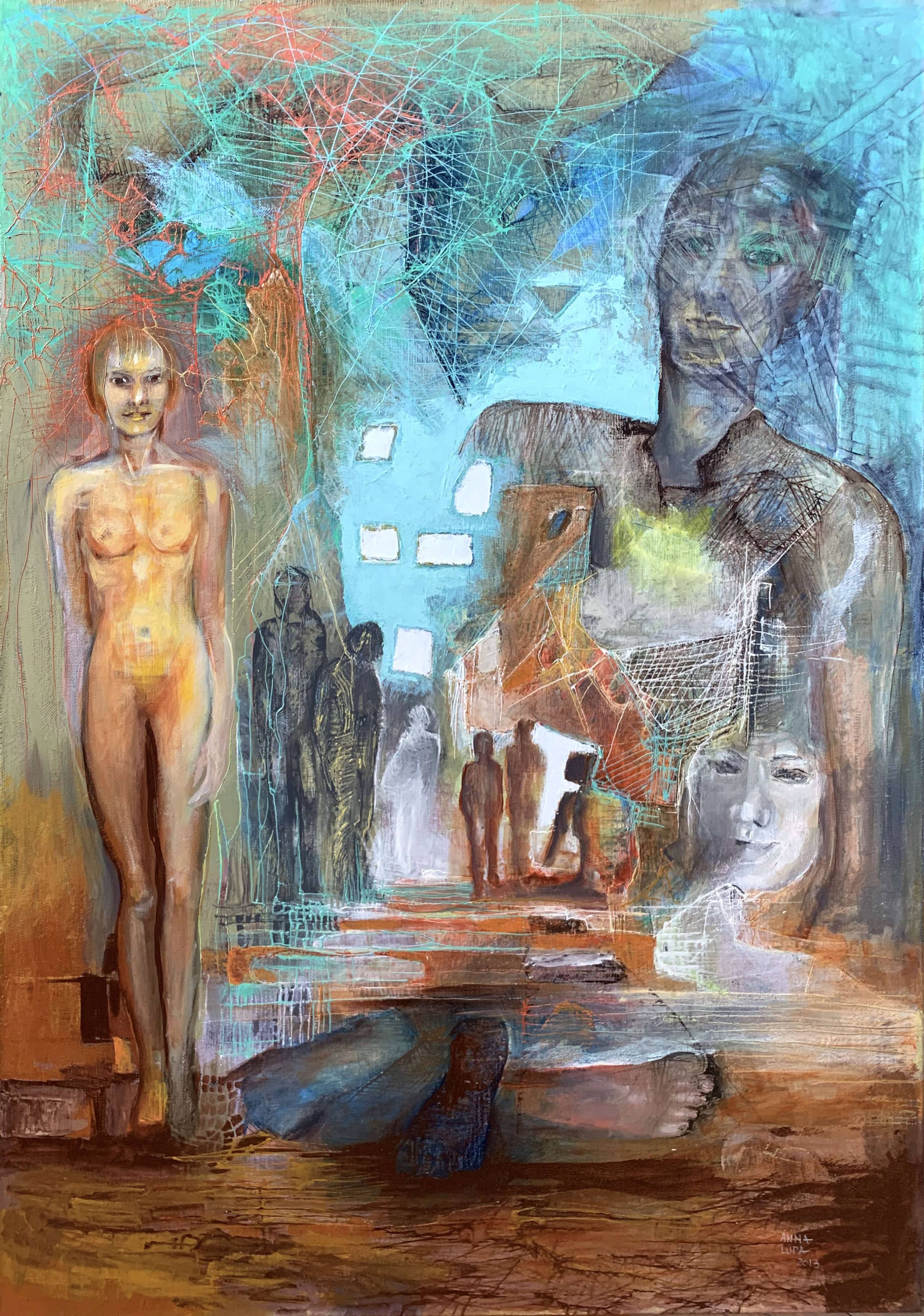 Obraz pełen jest kolorowych plam, które mieszają się w kalejdoskop emocji. Dominują odcienie błękitu, które splatają się z delikatnym brązem i pomarańczem. Kompozycja wydaje się chaotyczna, ale to właśnie w tym chaosie kryje się jej urok. Postaci zdają się wypływać z tła, tworząc nieco surrealistyczny nastrój. Artysta bawi się perspektywą, używając szerokich pociągnięć pędzla i delikatnych linii przypominających sieć. Ta technika dodaje obrazowi głębi. Atmosfera jest tajemnicza, jakby obraz opowiadał historię nie do końca zrozumiałą dla widza. Jest w tym coś niepokojącego, ale i fascynującego. Można poczuć ciszę, która emanuje z każdej figury. Obraz sprawia, że zastanawiamy się nad samotnością w tłumie, a jednocześnie czujemy jakieś niewypowiedziane connection. Kiedy patrzę na ten obraz, myślę o chwilach introspekcji. Gdzieś w tych zamazanych konturach można dostrzec ludzkie emocje – strach, nadzieję, może nawet miłość. Kolory są jak dream w pastelach, tworząc miejsca, do których chce się wracać. Dziecko powiedziałoby: "Tu są ludzie i kolory jak w bajce.". Moje osobiste odczucia są podobne – obraz przyciąga, hipnotyzuje i zostawia z pytaniami, na które każdy musi odpowiedzieć sam.