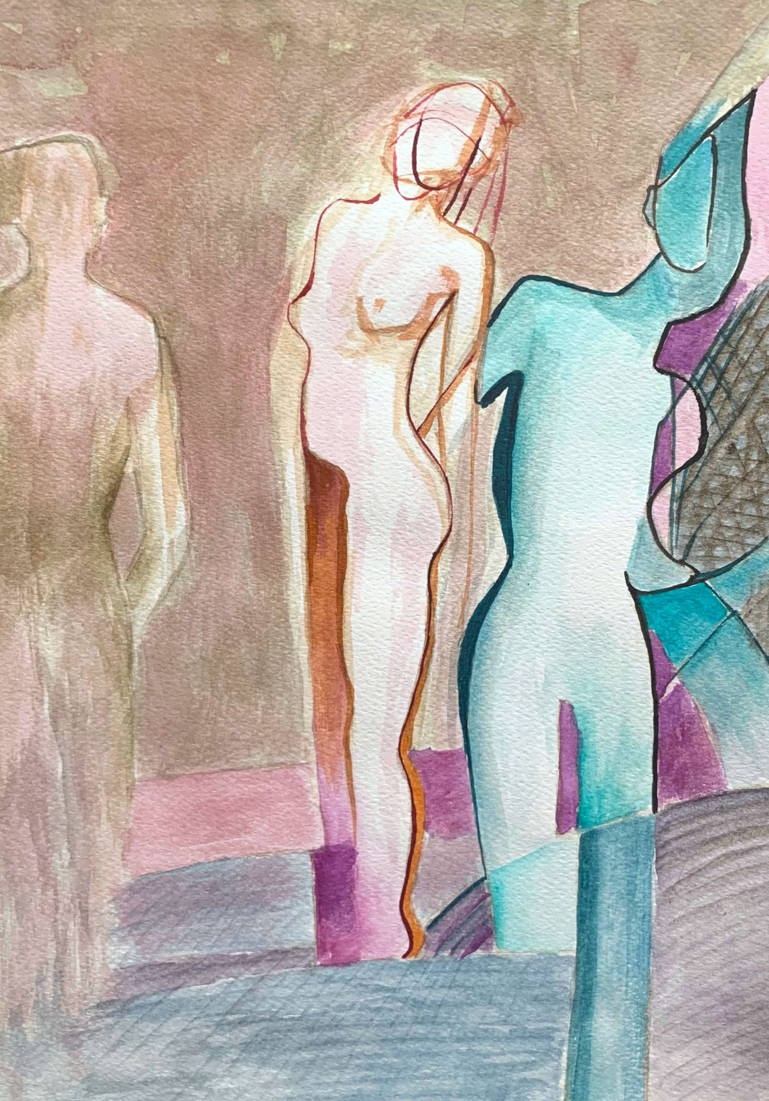 Akwarela oprawiona w passe-partout o wymiarze zewnętrznym 30 x 40 cm.