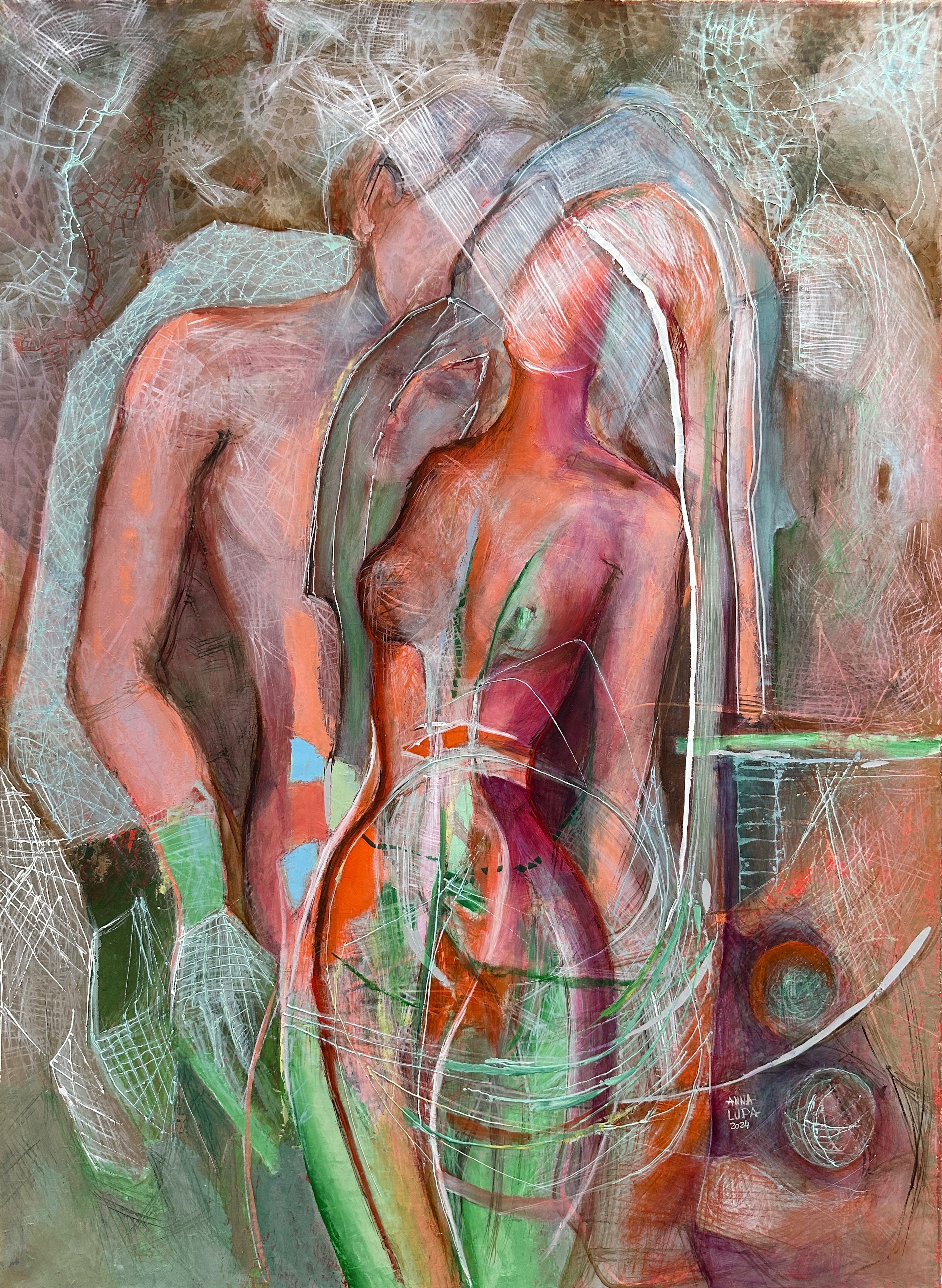 Obraz emanuje tajemniczą aurą, w której delikatne pastelowe odcienie przeplatają się z intensywnymi zieleniami i różami. Postacie są splątane w niezwykłym tańcu form i linii, które wydają się niemalże żyć, balansując na granicy rzeczywistości i abstrakcji. Atmosfera tego dzieła jest niesamowicie zmysłowa i intrygująca, wciągająca jak magnes. Technika artysty jest finezyjna, z użyciem dynamicznych pociągnięć pędzla oraz subtelnych przejść tonalnych. Każdy detal zdaje się opowiadać własną historię. Jest w tym obrazie coś, co sprawia, że człowiek zaczyna się zastanawiać nad ulotnością chwil i emocji, które towarzyszą nam podczas wzajemnych spotkaniom i relacji. Cisza, spokój, a jednocześnie pewna wewnętrzna dynamika sprawiają, że oglądanie tego dzieła staje się fascynującą przygodą. Nawet jeśli czasem nie wszystko jest jasne, piękno polega na interpretacji i odnajdywaniu swoich własnych odpowiedzi. Każdy detal wciąga w głąb, pozostawiając widza z mieszanką refleksji i zachwytu. .
