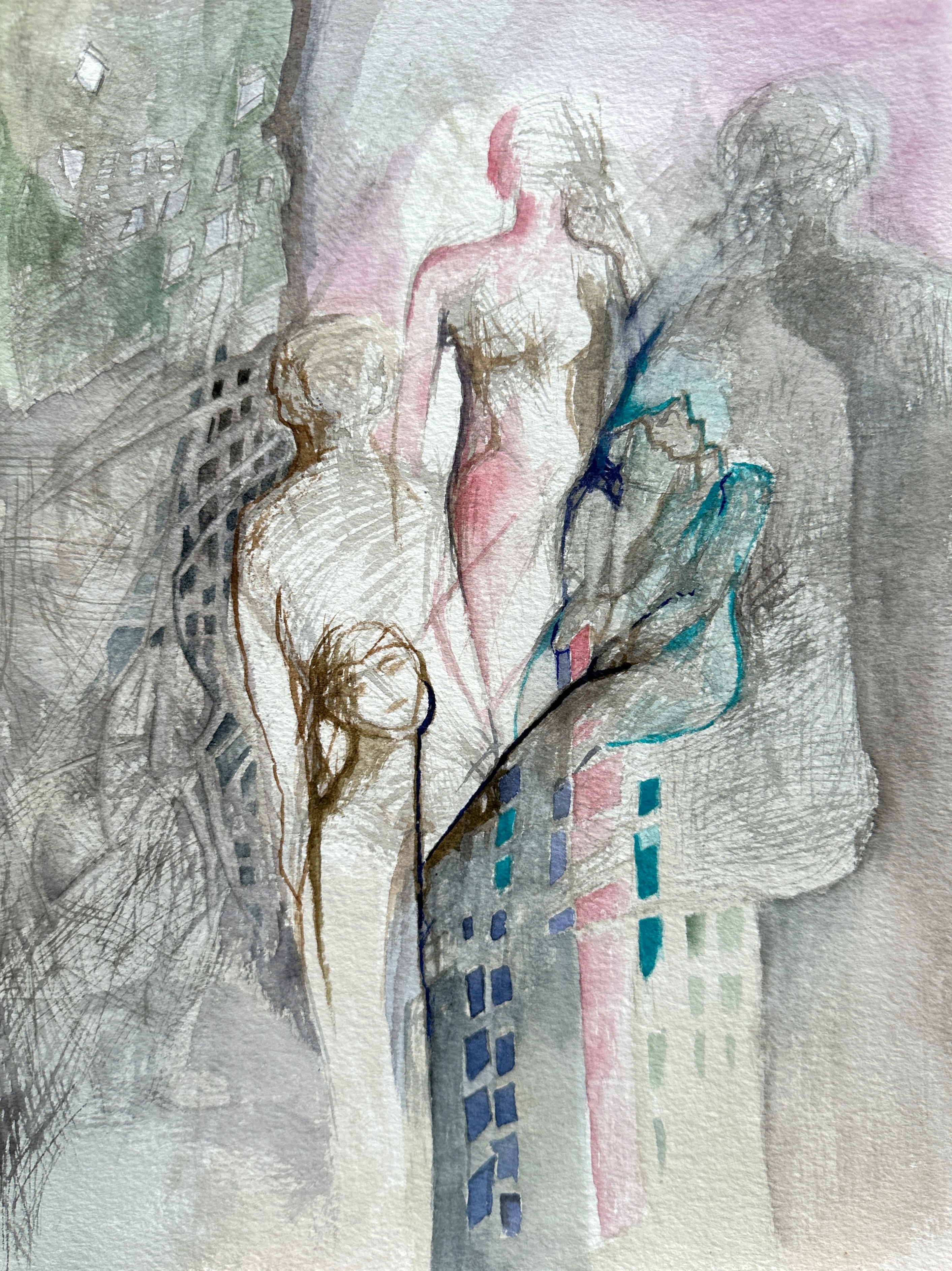 Dominują tu subtelne odcienie różu, szarości i zieleni, które tworzą łagodne, niemal eteryczne tło dla ludzkich sylwetek. Postacie namalowane są lekkimi, niedbałymi pociągnięciami pędzla i oddają wrażenie emocji i ruchu. Kompozycja przybiera formę zgiełku, ale jest w tym coś magicznego, jak obserwowanie miasta o zmierzchu. Atmosfera tego obrazu jest pełna intymności i emocji. Styl przypomina nieco minimalizm w połączeniu z abstrakcyjnym ekspresjonizmem. Artysta używa delikatnych linii i lekkich plam koloru, co dodaje dziełu przestrzeni i głębi. Wchodząc w świat tego obrazu, odrywamy się od rzeczywistości, a jego urok tkwi w jego niedoskonałości.