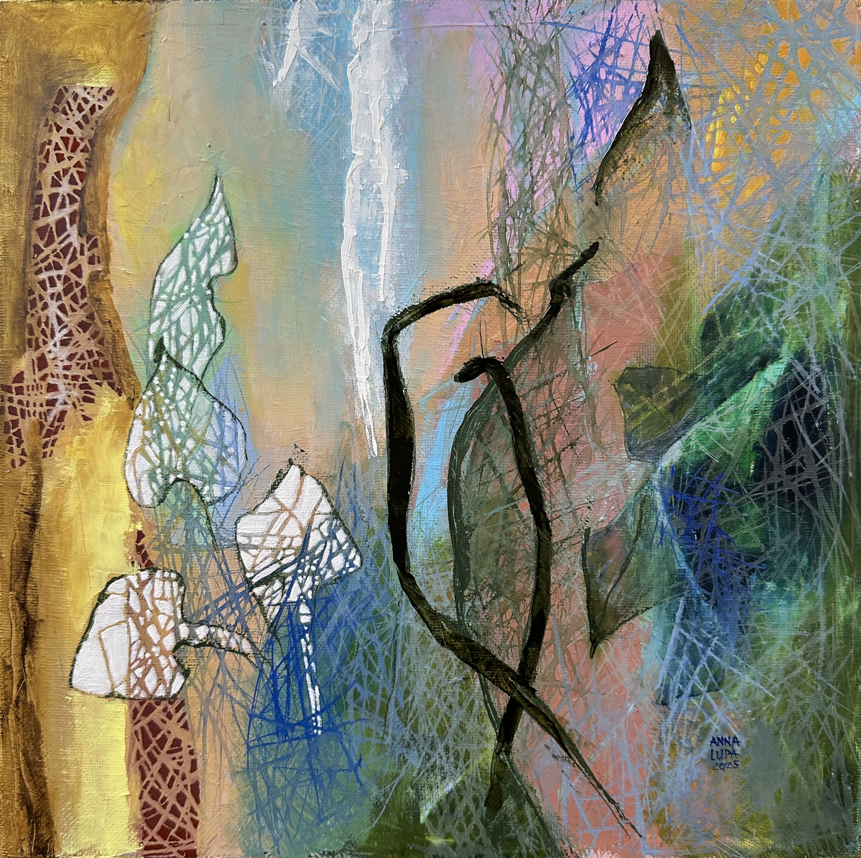 Na płótnie migoczą pasma ochry, mięty, błękitu i różu, przecięte siecią rys, kresek i pajęczynowych wzorów. Centralny gest, czarna wstęga, wygina się jak gałąź albo ptak w locie, obok bieleją nieregularne płatki przypominające liście. Kompozycja jest pionowa, poszatkowana, lecz trzyma rytm, jak muzyka grana na jednym oddechu. Atmosfera półsnu, trochę niepewna, trochę ciepła. Wygląda jak liść, co tańczy z wiatrem i mówi hop. Artysta zdaje się używać akrylu, laserunków, może frotażu i drapania, do tego warstwy kolażowych siatek. Tekstury są tak gęste, że niemal słychać trzask pędzla, a czasem ciszę. Te kolory jest naprawde fizyczne, z chwile blade, po chwili nabierają glow. Obraz może mówić o kruchości i opiece, o ścieżce w gąszczu, zreszta każdy znajdzie coś innego. Ja czuję spokój i małe ukłucie ciekawości, serio.