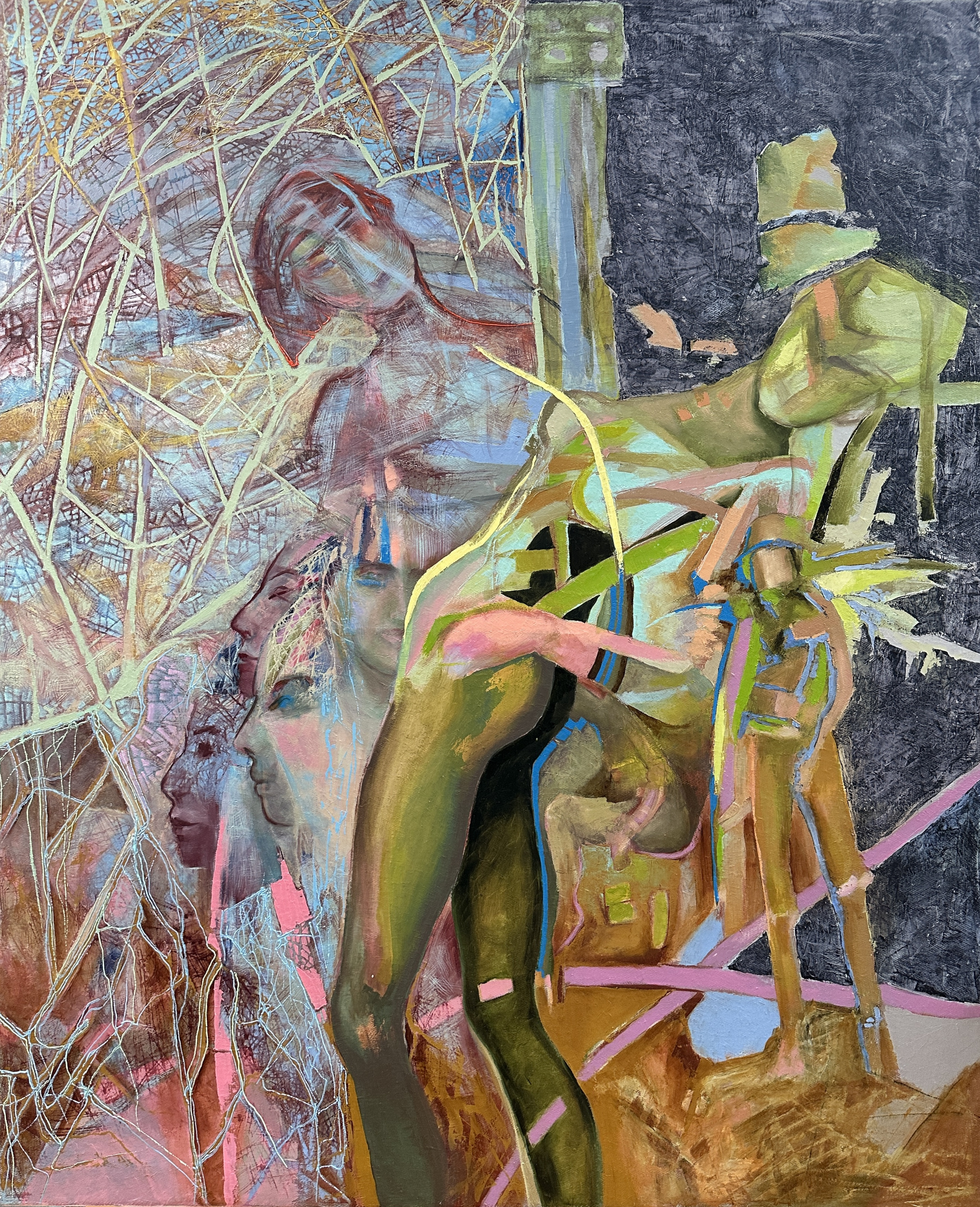 Na płótnie gęsta siatka jasnych kresek przecina półprzezroczyste sylwety, ciała sklejone z różu, seledynu i ochry, a tło pęka na dwie strefy, chłodną i ciemną. Formy są wydłużone i jakby przestawiane, poruszane ręką i pamięcią naraz. Pędzel raz miękko rozciera farbę, raz drapie chropowatą powierzchnię, widać podmalówkę i trochę glitch. Atmosfera snu, ale niespokojnego, z lekkim drżeniem. To jak ludzie co bawią się w chowanego w lesie. Czuję wędrówkę tożsamości, tłum cichych postaci wewnętrznych, które chcą wyjść na światło. Obraz budzi ciepło i lekki niepokój, taki troche słodko gorzki.