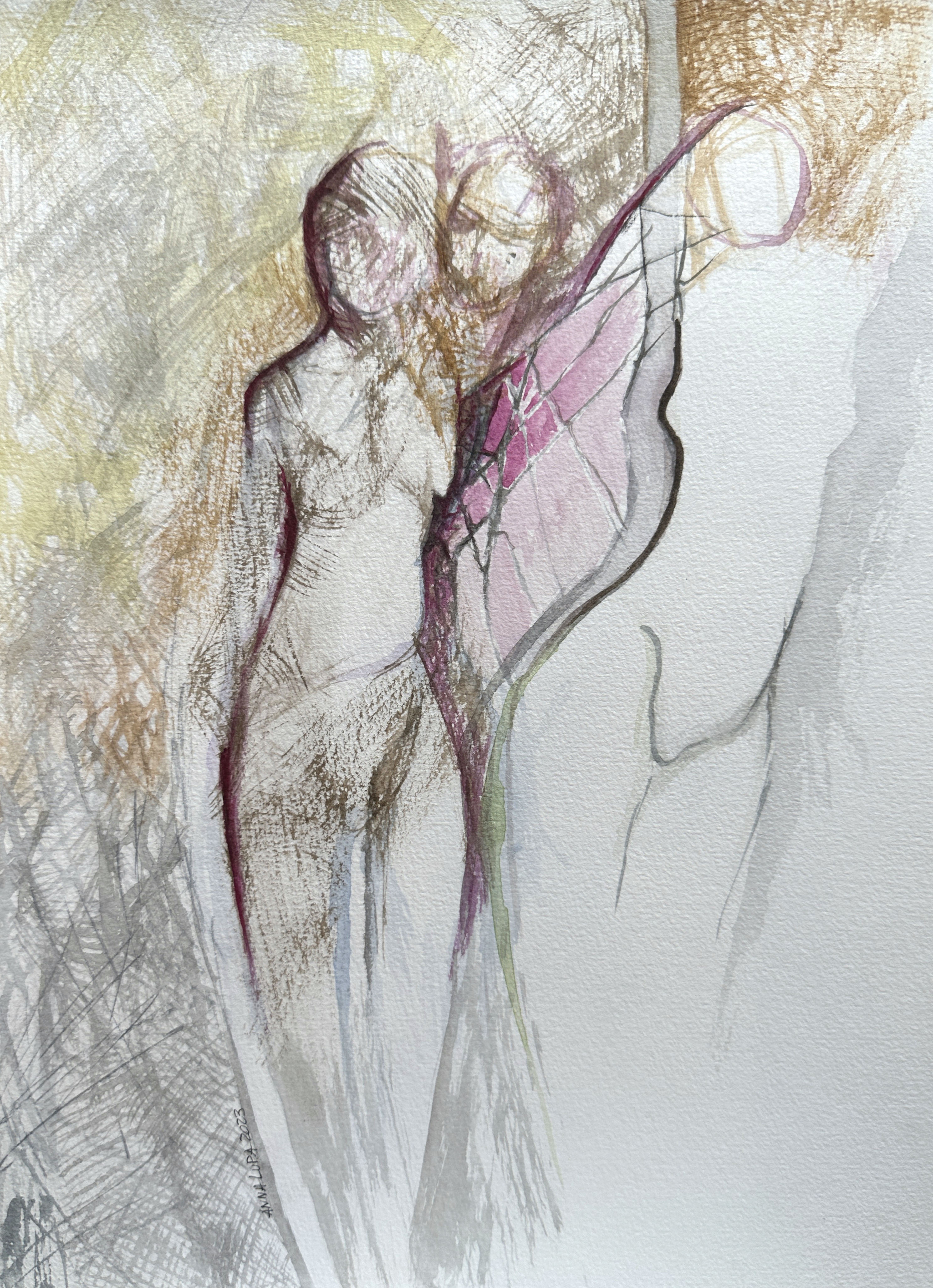Na papierze widać dwie szkicowe postacie. Jedna stoi bliżej. smukła sylwetka w beżach i szarościach. obrys podkreśla fioletowa kreska jak nerw. Druga figura chowa się za nią i unosi rękę w stronę okrągłego kształtu po prawej. jakby lampy albo księżyca. Tło jest rozmyte. ciepłe plamy ochry mieszają się z chłodnym grafitem. Kompozycja idzie ukośnie. a siatka czarnych linii przypomina pęknięte okno. Atmosfera jest cicha i troche niepokojąca. Jest tu dużo smug i niedopowiedzeń. ja czuję tu napięcie. ale i jakąś bliskość. To jest jak dream. Ktoś kogoś chroni. albo właśnie odpycha. Ja bym chciał ich przytulić. Bo oni są spokojni. Akwarela oprawiona w passe-partout o wymiarach 30 x 40 cm.
