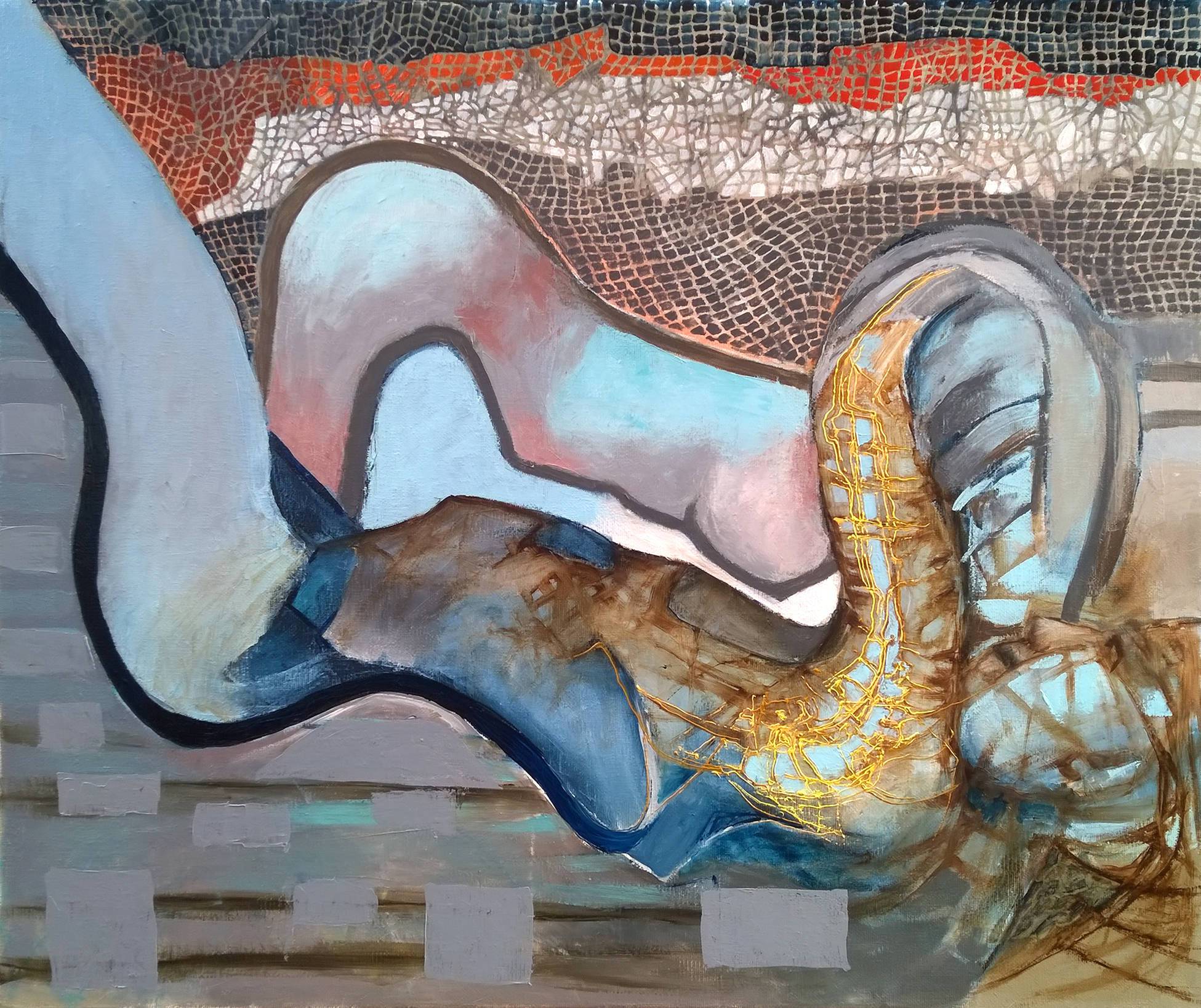 Ten obraz to uczta dla oka pełna miękkich, falujących kształtów i zaskakujących kolorów. Przewijające się odcienie błękitu i brązu tworzą wyrafinowaną harmonię, przełamaną jaskrawymi, pomarańczowymi akcentami. Podziwiając te pociągnięcia pędzla, można poczuć, jak zanurzasz się w śnie pełnym surrealistycznych form. Atmosfera jest nieco tajemnicza, prawie jakby ukrywała sekret pod spodem. Artysta zastosował technikę mozaiki, której fragmenty zdobią górną część kompozycji. Mieszanka płynnych linii i ostrych konturów tworzy dynamiczny kontrast, który przykuwa wzrok. Emocje? No jasne. Obraz budzi ciekawość, może nawet niepokój. A co to znaczy? Każdy musi sam odkryć jego "hidden meaning". Zastanawiam się, co artysta chciał przekazać. Może chodzi o podróż przez życie? A może to walka z własnymi demonami? Jak małe dziecko może powiedzieć: "To wygląda jak niebieski wąż, co robi wygibasy!". Czy nie o to dokładnie chodzi w sztuce? Oczywiście. Interpretacje mogą być różne, ale co do jednej rzeczy nie ma wątpliwości - ten obraz zmusza do myślenia. Chociaż jego forma jest abstrakcyjna, emocje emanujące z pracy są absolutnie rzeczywiste.