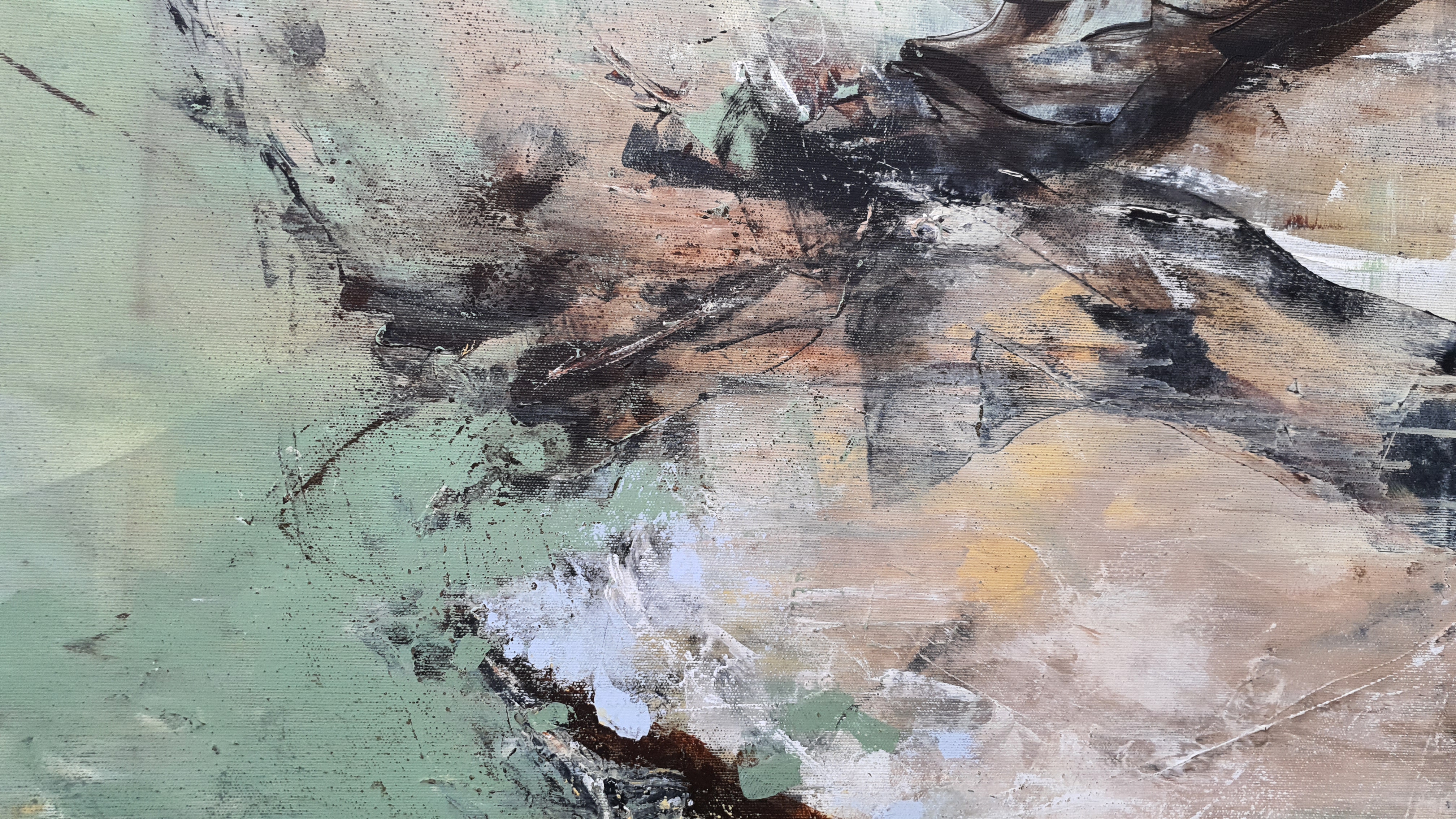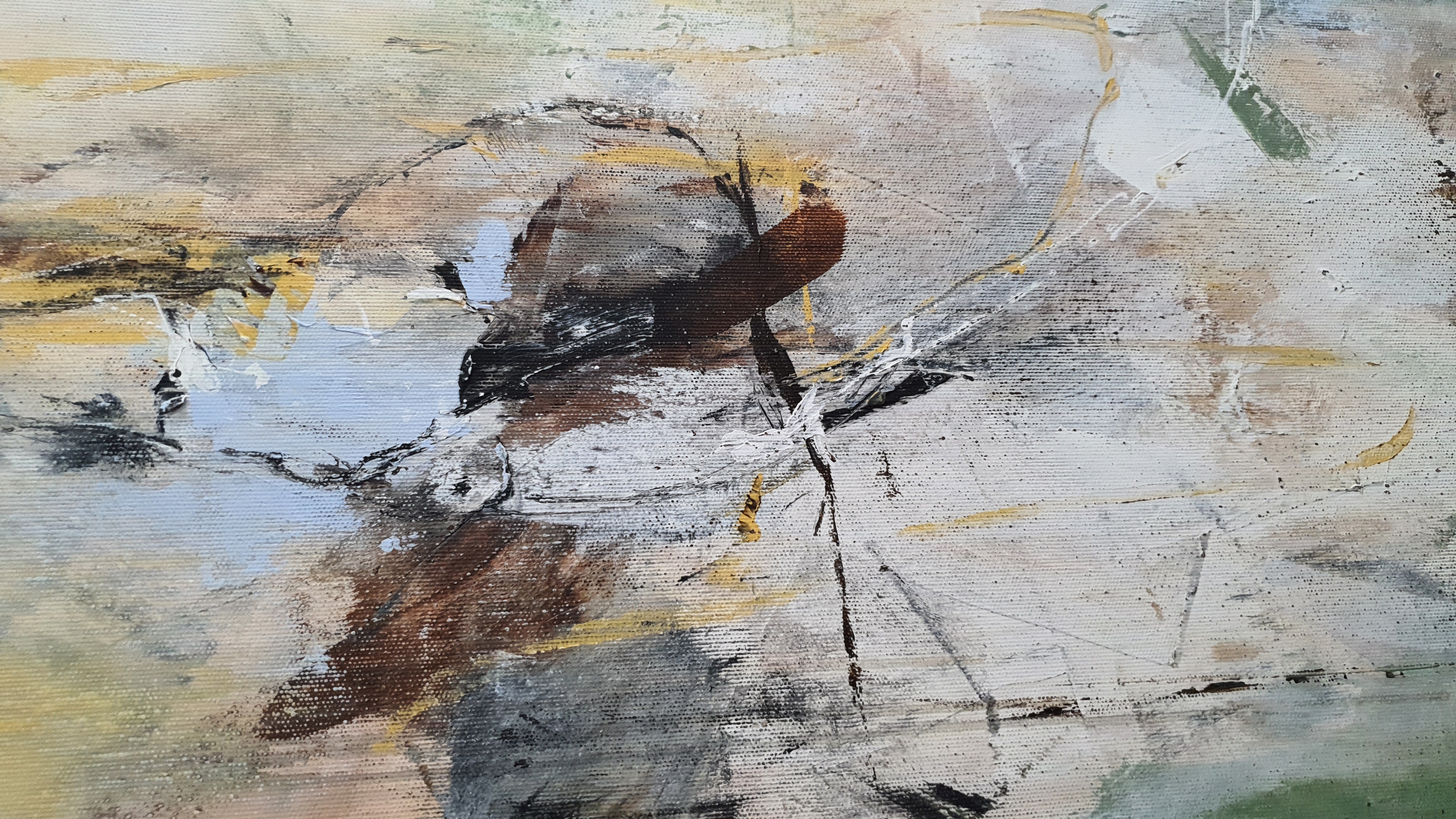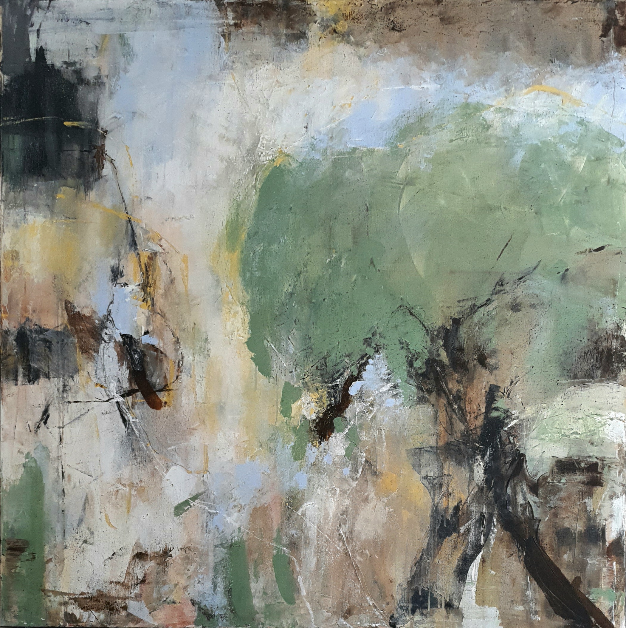 Na płótnie tańczą plamy szałwiowej zieleni, zgaszonych beży i szarości, przełamane żółtym światłem. Atmosfera mglista jak poranny spacer po ogrodzie, ciszę przenikają dzwięki, barwy i śpiew ptaków. Styl lirycznej abstrakcji, trochę ekspresyjny, trochę notatnik z emocjami. Czuć spokój jakby wracało lato z dzieciństwa. Niby chaos, a wszystko miekko się składa, oddycha i zostawia jakos ślad.