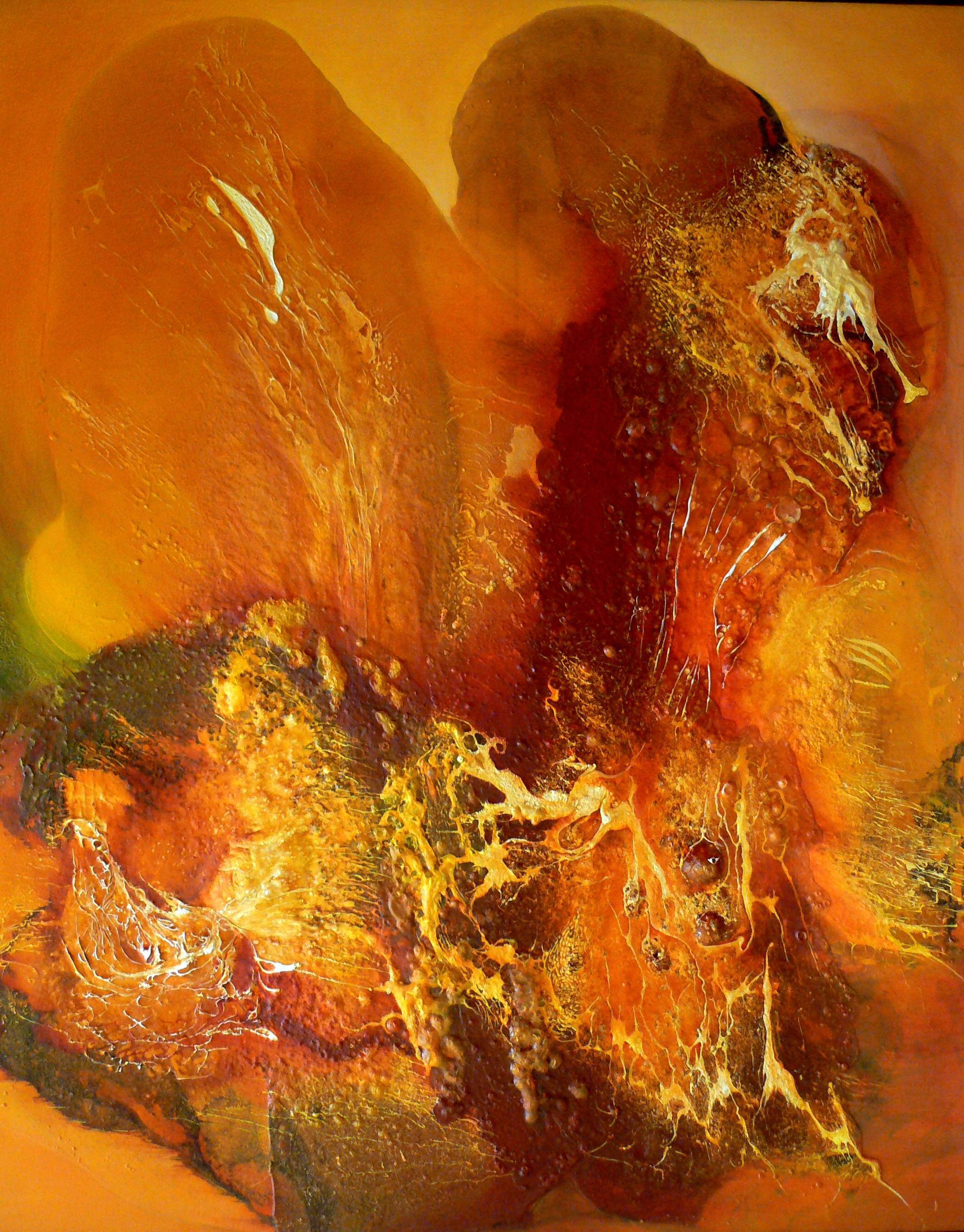 Obraz tętni życiem dzięki bogatej kolorystyce zdominowanej przez ciepłe odcienie pomarańczu, czerwieni i złota. Kształty zlewają się w dynamiczną kompozycję, przywodzącą na myśl płynące strumienie lawy. Chaos i harmonia, te dwa przeciwstawne aspekty, spotykają się tu w intensywnej interakcji. Atmosfera obrazu jest gorąca i śmiała, niemalże palpably dynamiczna. Artysta zastosował technikę impasto, co sprawia, że tekstura jest wyczuwalna i dosłownie zaprasza do dotyku. Użycie grubych pociągnięć pędzlem oraz spontanicznych rozprysków farby nadaje dziełu energię. To mi przypomina o płomieniach ogniska, taka ciepła energia emanuje z obrazu. Dzieciak by pewnie powiedział: „Wow, to wygląda jak wybuch wulkanu!”. Emocje płyną jak ciepłe fale, obserwator może poczuć się zanurzony w atmosferze gorączki twórczej. Dla mnie to takie „wow”, jakby artysta uchwycił moment natury, który jest zarówno piękny, jak i przerażający. Ten vibrant obraz wzywa do refleksji nad potęgą żywiołów i ulotnością chwili.