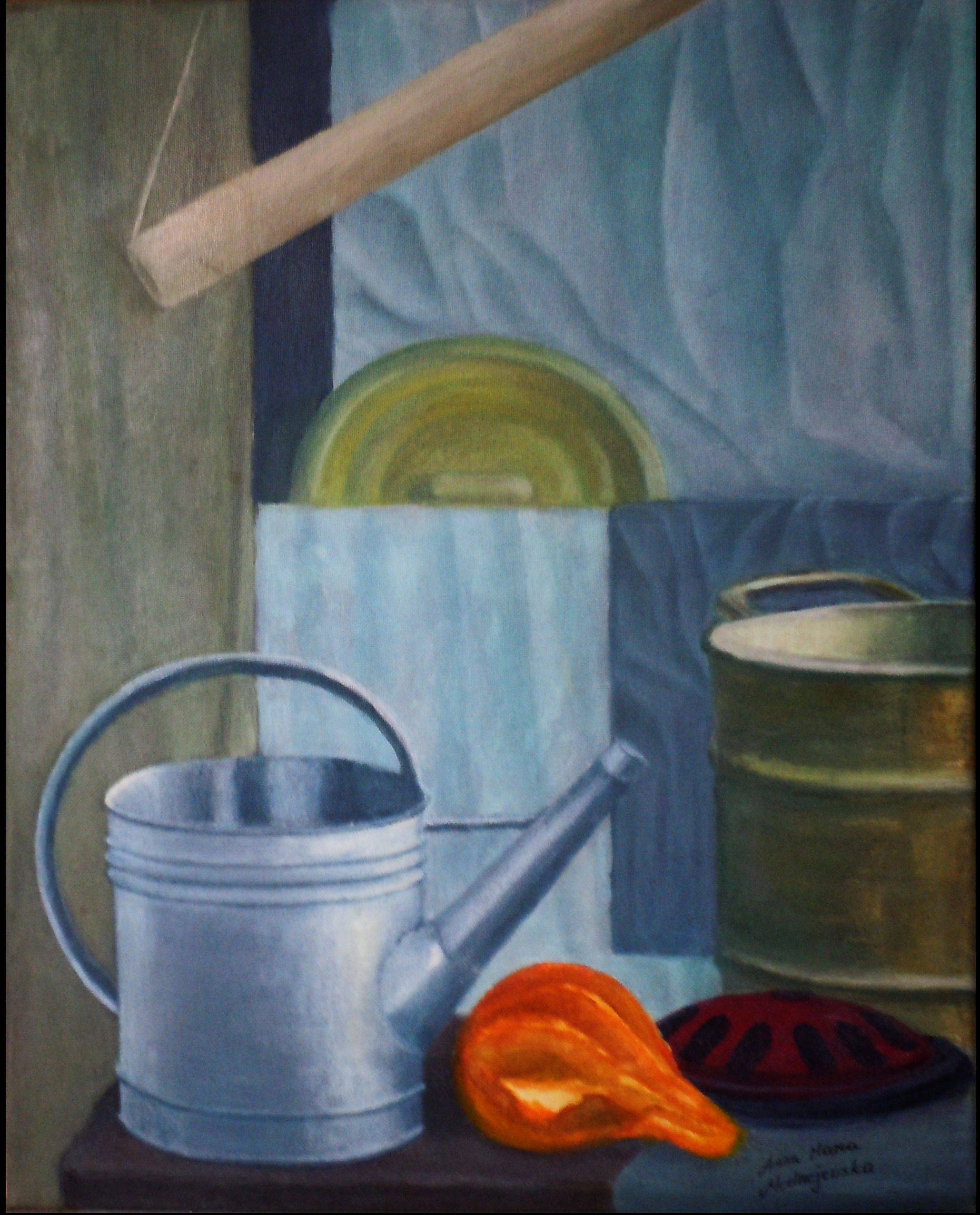 Obraz przedstawia spokojną martwą naturę, gdzie dominują chłodne błękity i szarości, przeplatane ciepłym pomarańczem dyni. Na pierwszym planie widzimy metalową konewkę, której srebrzysta powierzchnia odbija delikatne światło, podkreślając jej surową fakturę. Obok spoczywa niewielka tykwa, której intensywna barwa dodaje energii całej kompozycji. Tło to mieszanka geometrycznych płaszczyzn, w których przebija się zgaszona zieleń talerza, lekko przesłonięta przez falujące tkaniny. Atmosfera tego obrazu jest nieco nostalgiczna, jakby przywoływała wspomnienia z dzieciństwa. Czuć spokój, ale i pewną izolację. Styl artysty cechuje się realizmem, ale i subtelną abstrakcją. Linia i forma są tu wyważone, co nadaje dziełu elegancji; wygląda jakby było malowane z sercem. Patrzący może odczuwać mieszankę spokoju i tęsknoty. Check it out! Takie detale budują intymność, jak wspomnienie babcinej kuchni w letnie popołudnie. Dla siedmiolatka to może być obraz z magicznym dzbankiem. To dzieło, które zaprasza do refleksji nad codziennym pięknem ukrytym w prostocie.
