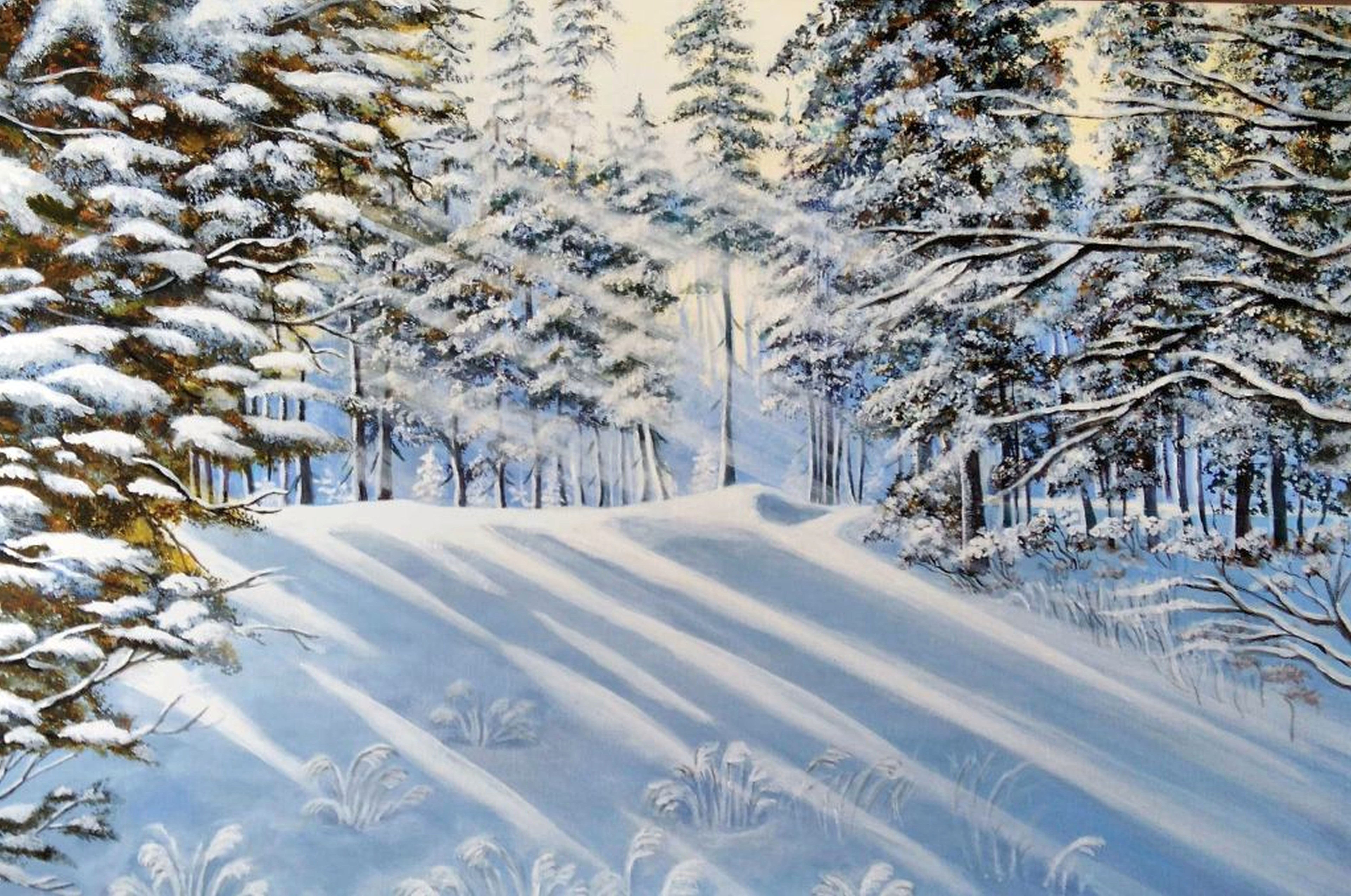 Na obrazie widać zimowy las z szeroką bielą na pierwszym planie i zwartą ścianą drzew po bokach. Błękity przechodzą w srebro i delikatne złotawe tło, a gałęzie dźwigają puchate plamy. Kompozycja prowadzi wzrok w głąb ku polanie, gdzie cienie rysują długie pasy. Śnieg jest miękki jak kołderka i chcę tam biegać. Atmosfera jest cicha, crisp, troszke jak pierwszy wdech mrozu. Malarskość sugeruje olej na płótnie z miękkimi laserunkami i suchym pędzlem na iskierkach sniegu. Rozpryski i przetarcia zdradzają swobodny gest i radość tworzenia. Czuję spokój, lecz i ciekawość, bo ścieżka znika. To zaproszenie do samotnej wędrówki i krutkiej ucieczki od hałasu dnia.