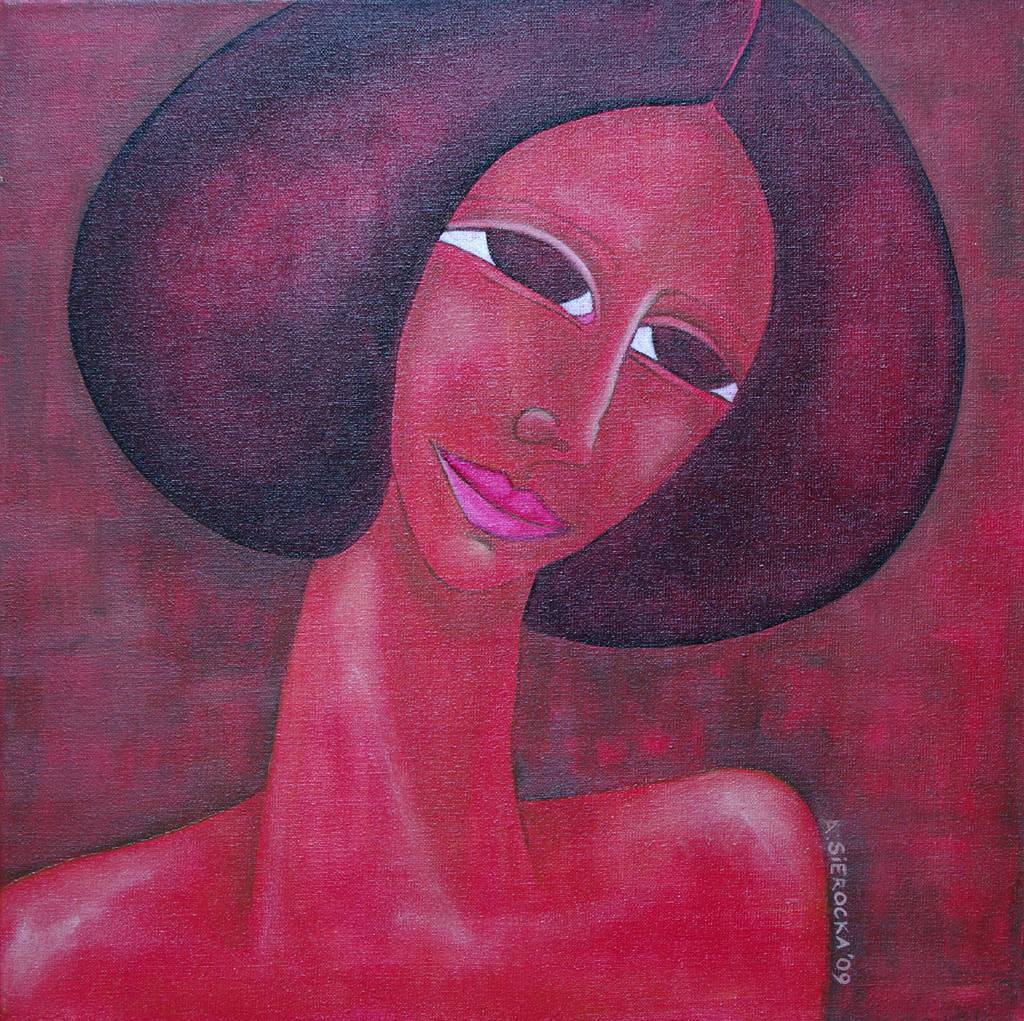 Obraz emanuje intensywnym ciepłem czerwonych i różowych tonów, które dominują kompozycję. Centralna postać o smukłej szyi i dużych, wyrazistych oczach przyciąga wzrok swoją tajemniczą aurą. Jej asymetryczna fryzura dodaje dziełu nowoczesności i odrobinę playful nature. Właściwie, gdy patrzę na nią dłużej, zastanawiam się, co skrywa ten delikatny, lekko uśmiechnięty wyraz twarzy. Artysta w mistrzowski sposób łączy abstrakcyjną formę z wyrazistymi konturami, tworząc niepowtarzalny efekt. Farby nakładane płynnie, jakby malowane pędzlem z jedwabiu, dodają delikatności i harmonii. Mały Jaś powiedziałby: "Ta pani ma włosy jak chmurka!". Ten obraz to jak rozmowa z duszą, niejednoznaczność, która wzbudza ciekawość i zadumanie. To dzieło nie tylko ozdabia przestrzeń, ale także pobudza do refleksji. Co kryje się za tymi oczami? Może w każdym z nas można znaleźć podobne emocje, a może coś zupełnie innego. Jednak jedno jest pewne - na tym obrazie można zawiesić wzrok raz i wracać do niego w nieskończoność.