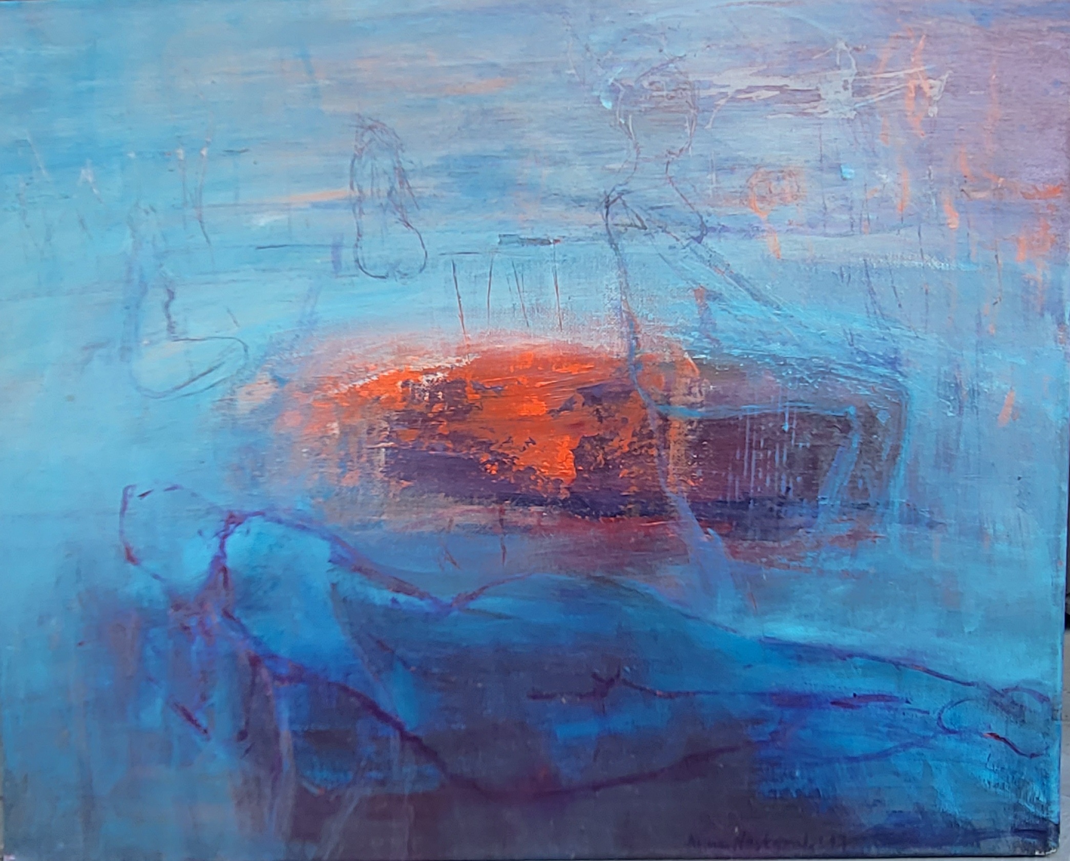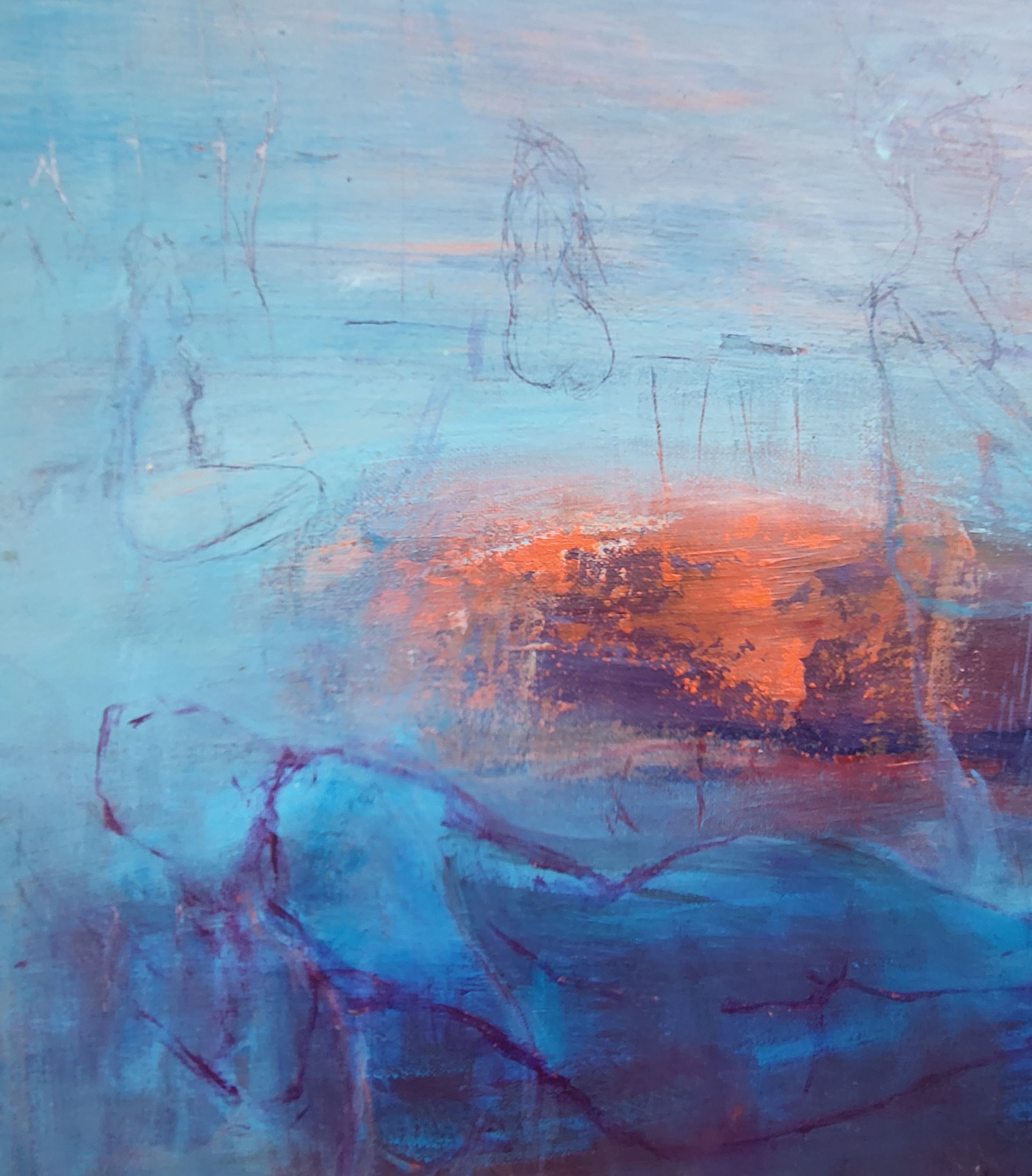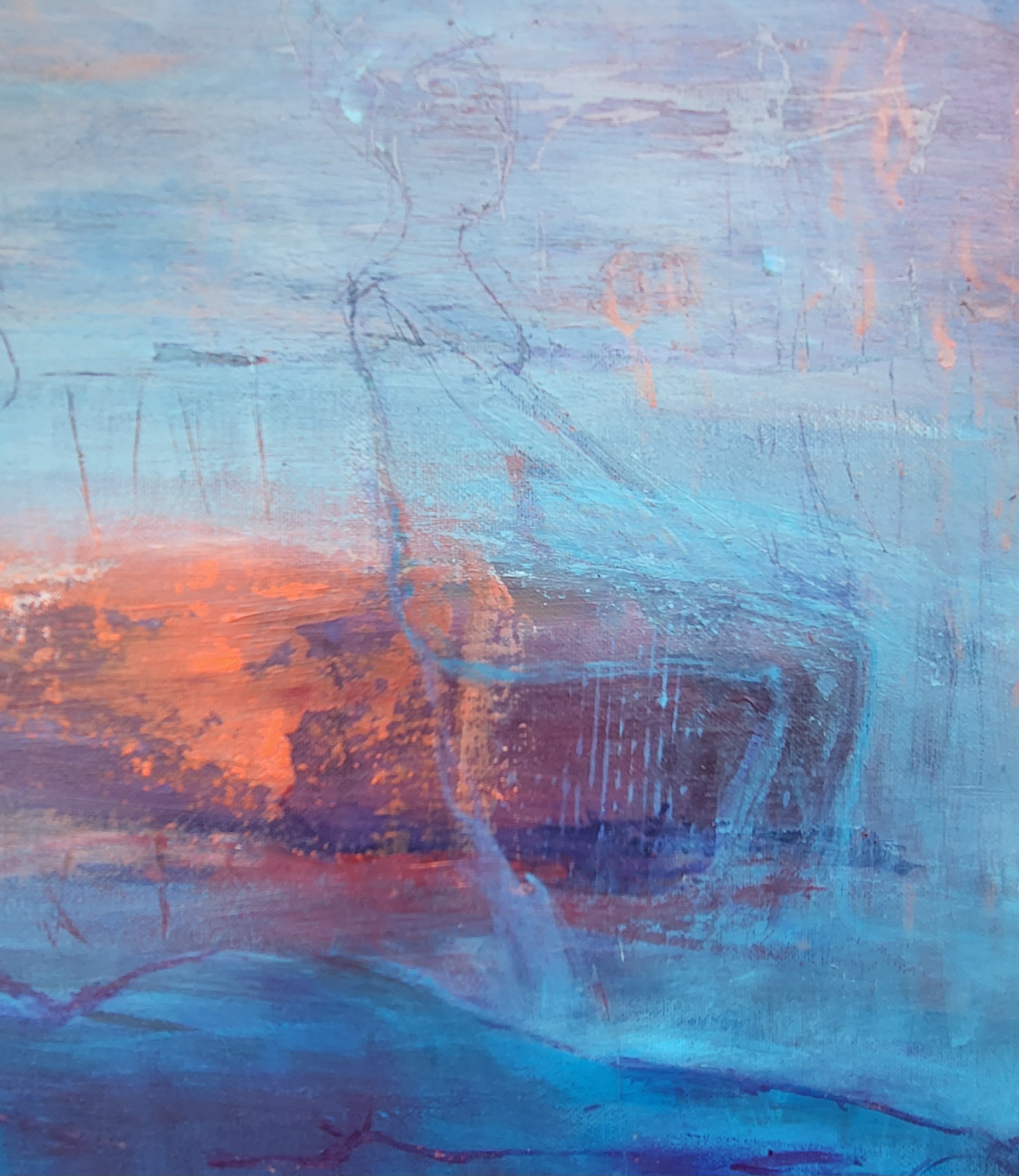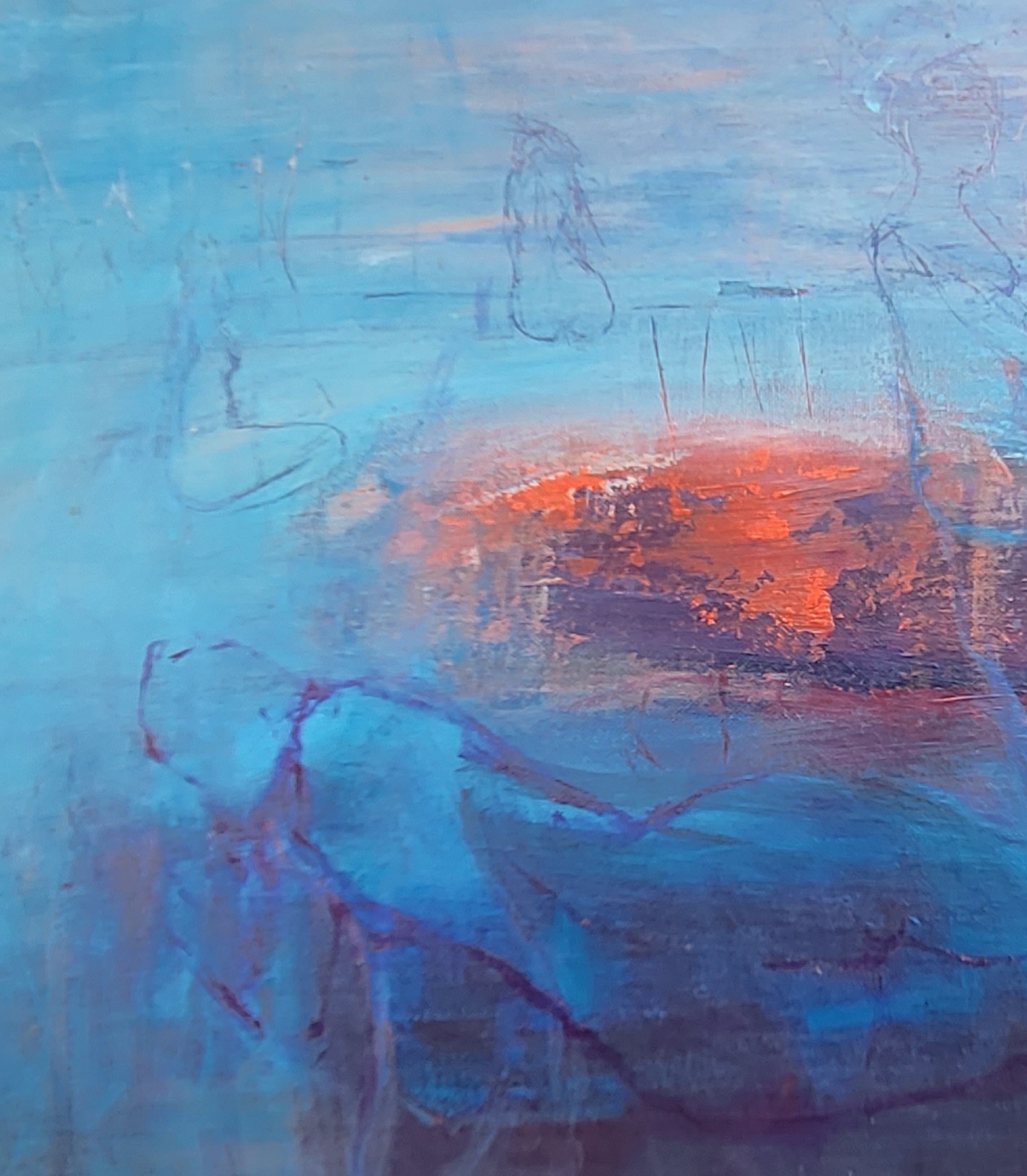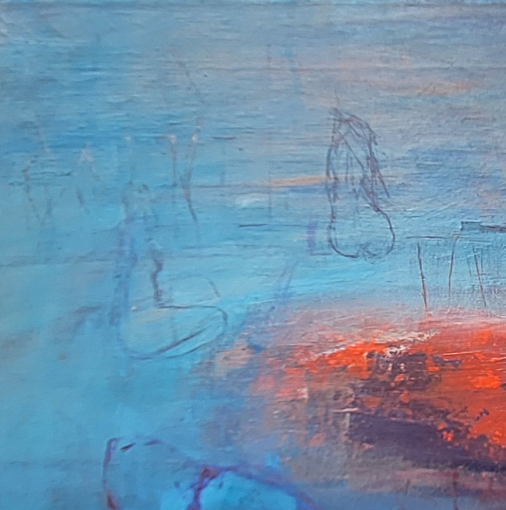 Obraz nowoczesny o wymiarach 50/ 40 cm, wykonany w technice farb akrylowych. Na główny plan obrazu wysuwa się mocna, abstrakcyjna forma zachodzącego słońca, przenikająca jednocześnie przestrzeń wody i nieba. Dopiero po chwili można dostrzec delikatne figuratywne formy, są one dopełnieniem nadmorskiego pejzażu. Mimo ostrych kontrastów kolorystycznych, zarys postaci kobiecych na plaży, wprowadza balans, pozwalając nienachalnie wprowadzić się w opowieść, nastrój plażowania, relaksu i wieczornego spokoju.