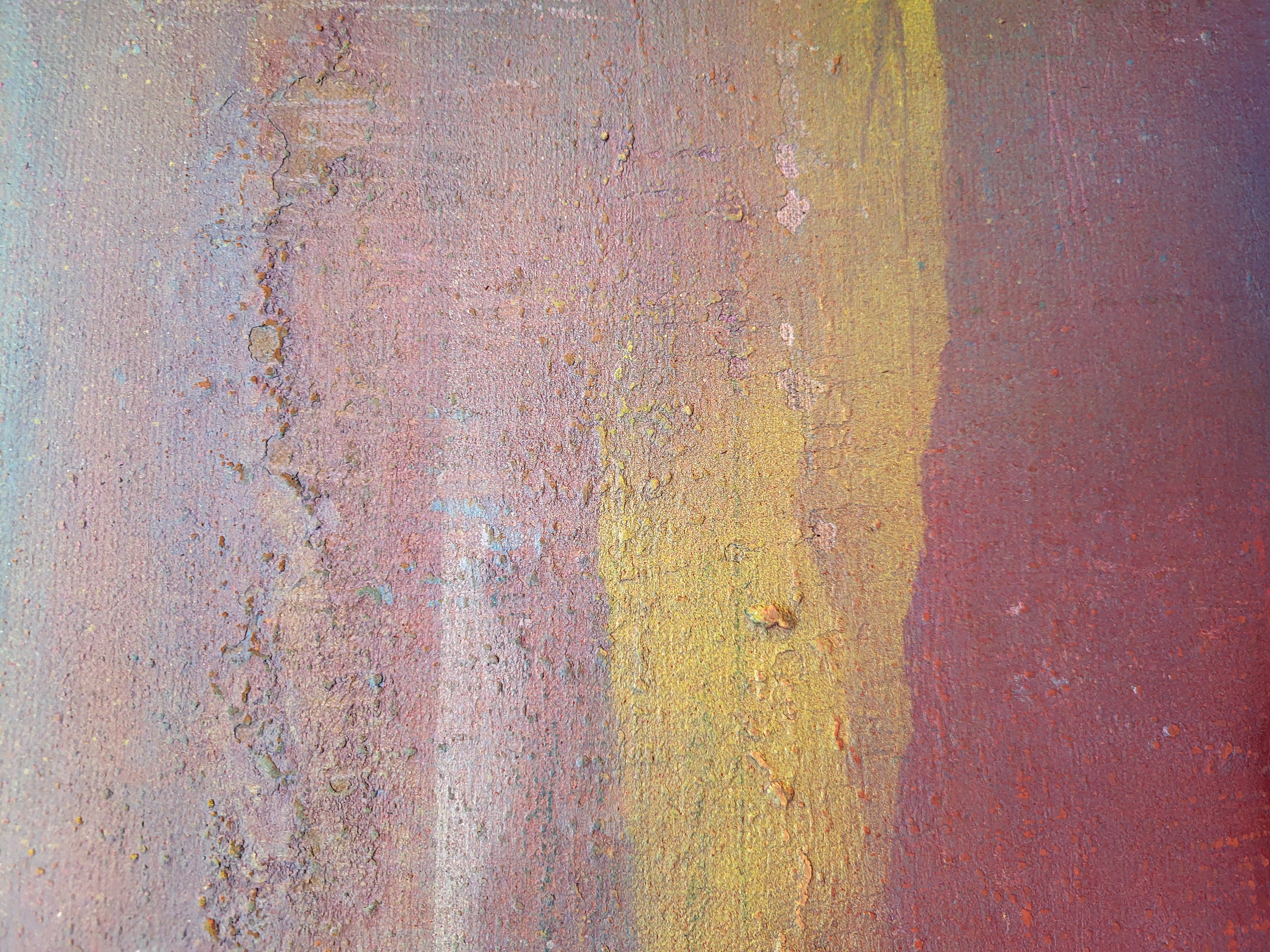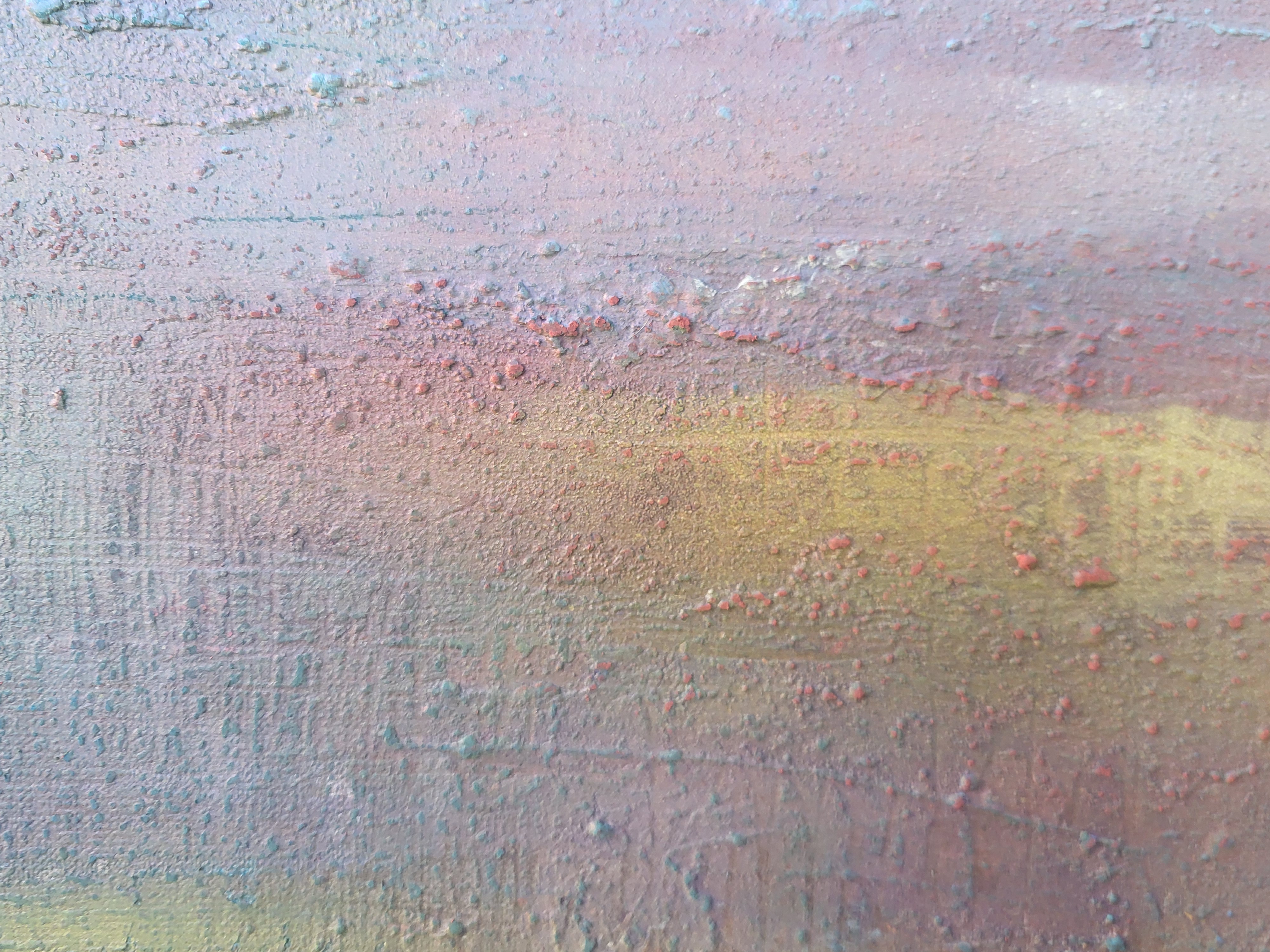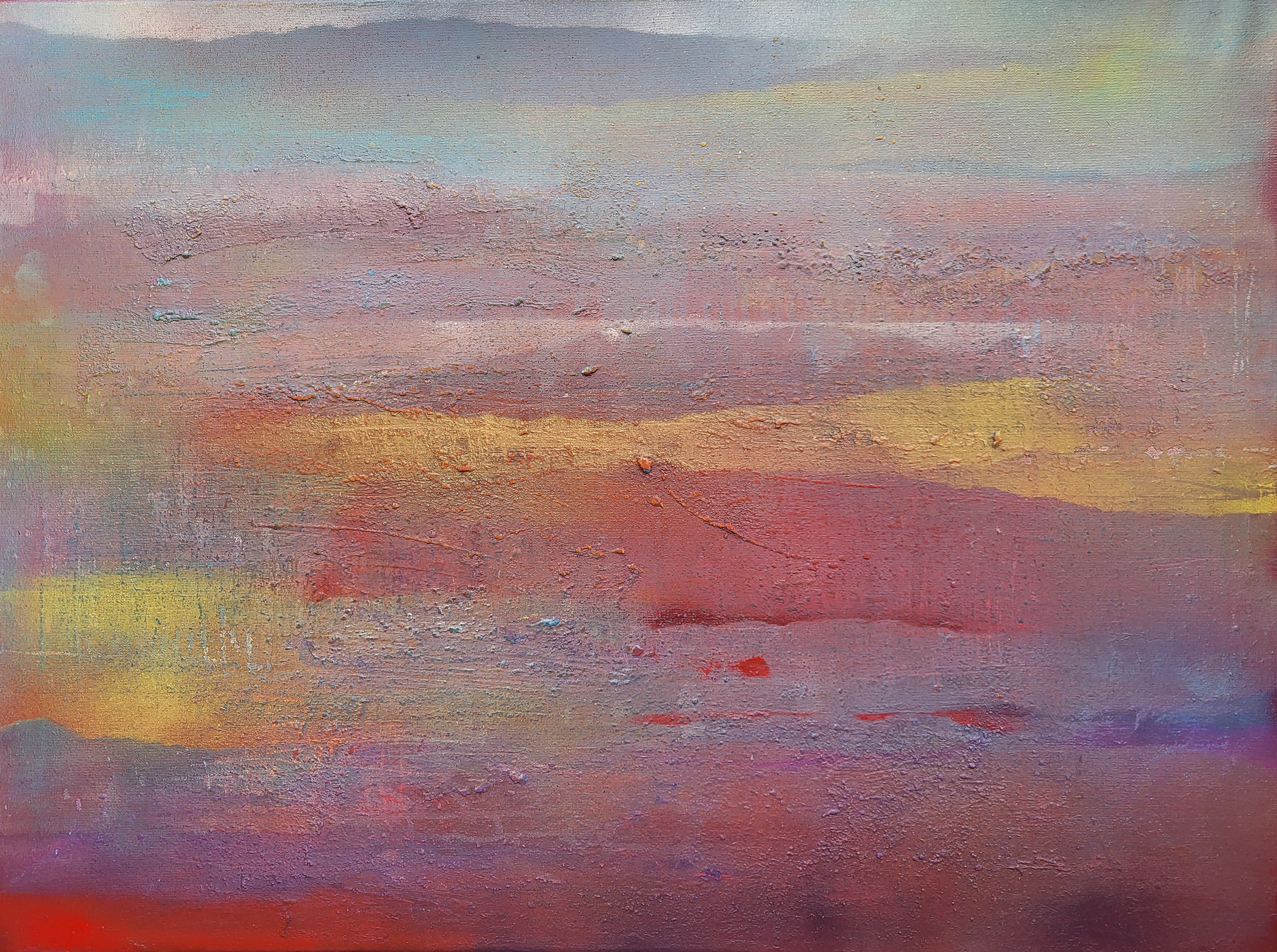 Obraz wykonany w technikach mieszanych, nakładanie wielu laserunków, warstw i faktur doprowadził do obrazu pejzażowego ale jednak mocno abstrakcyjnego. Ciepłego w barwach ale gdy przyjrzymy się kadrom, detalom, to wiele fragmentów są przygaszone, matowe z widocznymi ziarnami faktury.