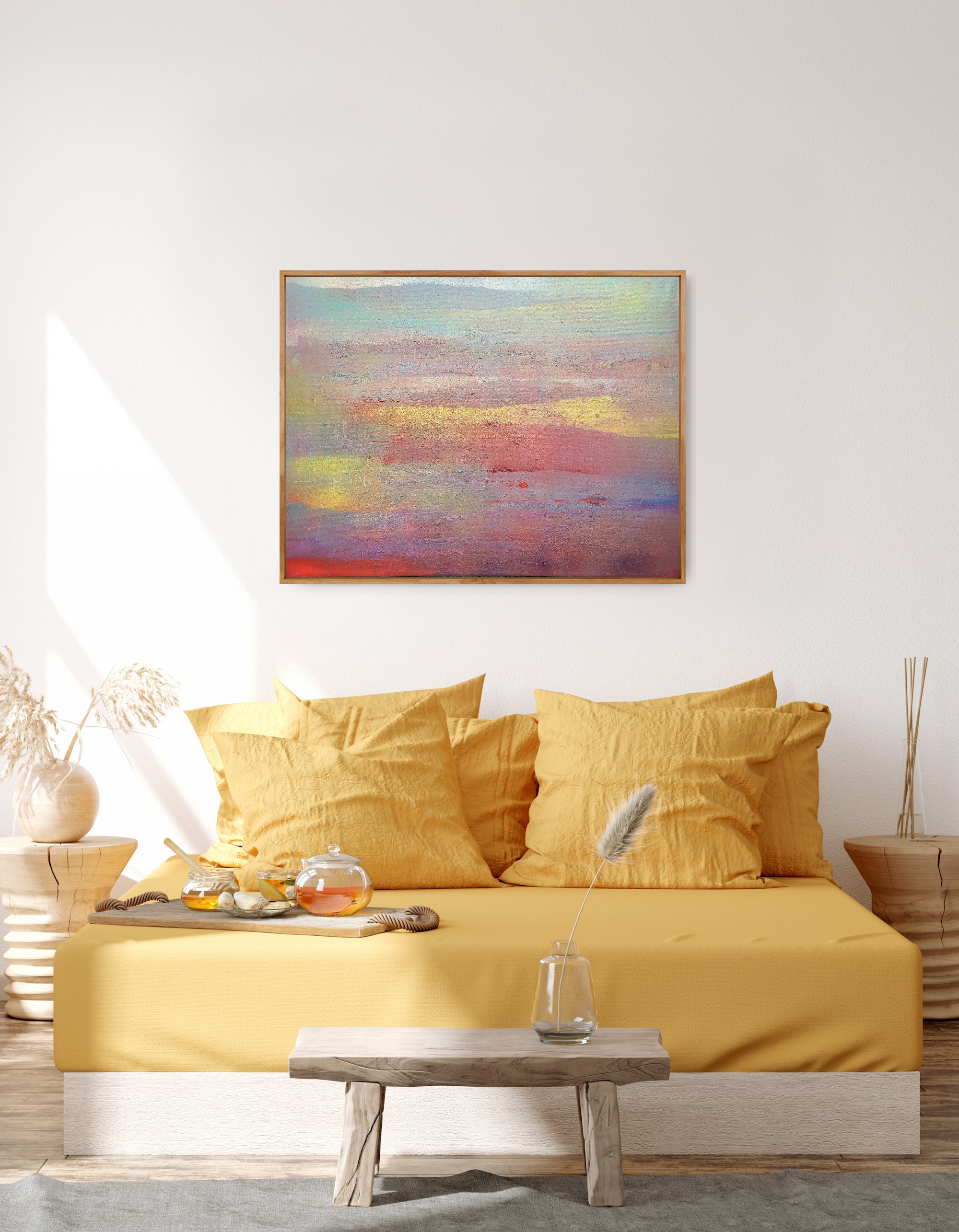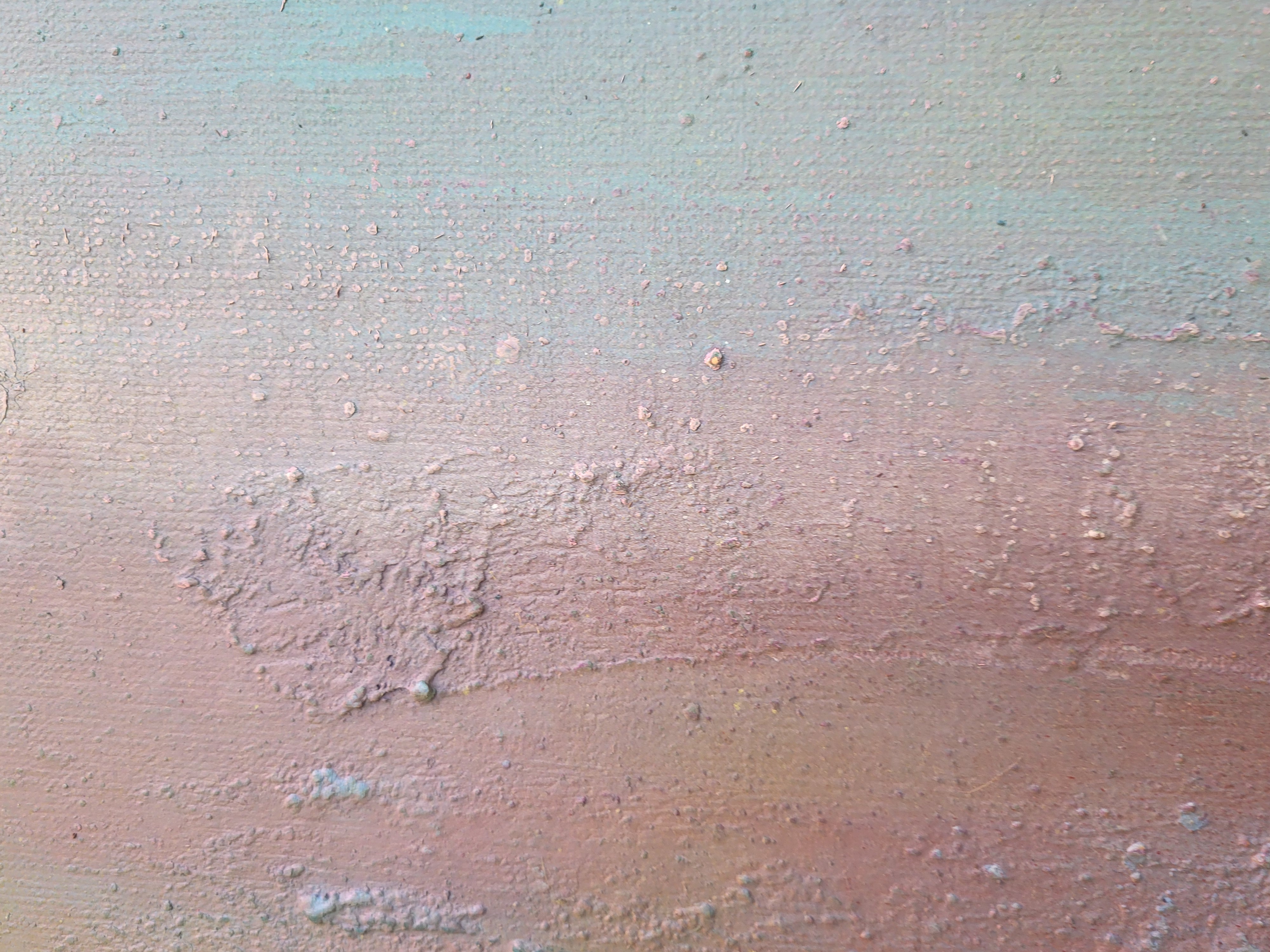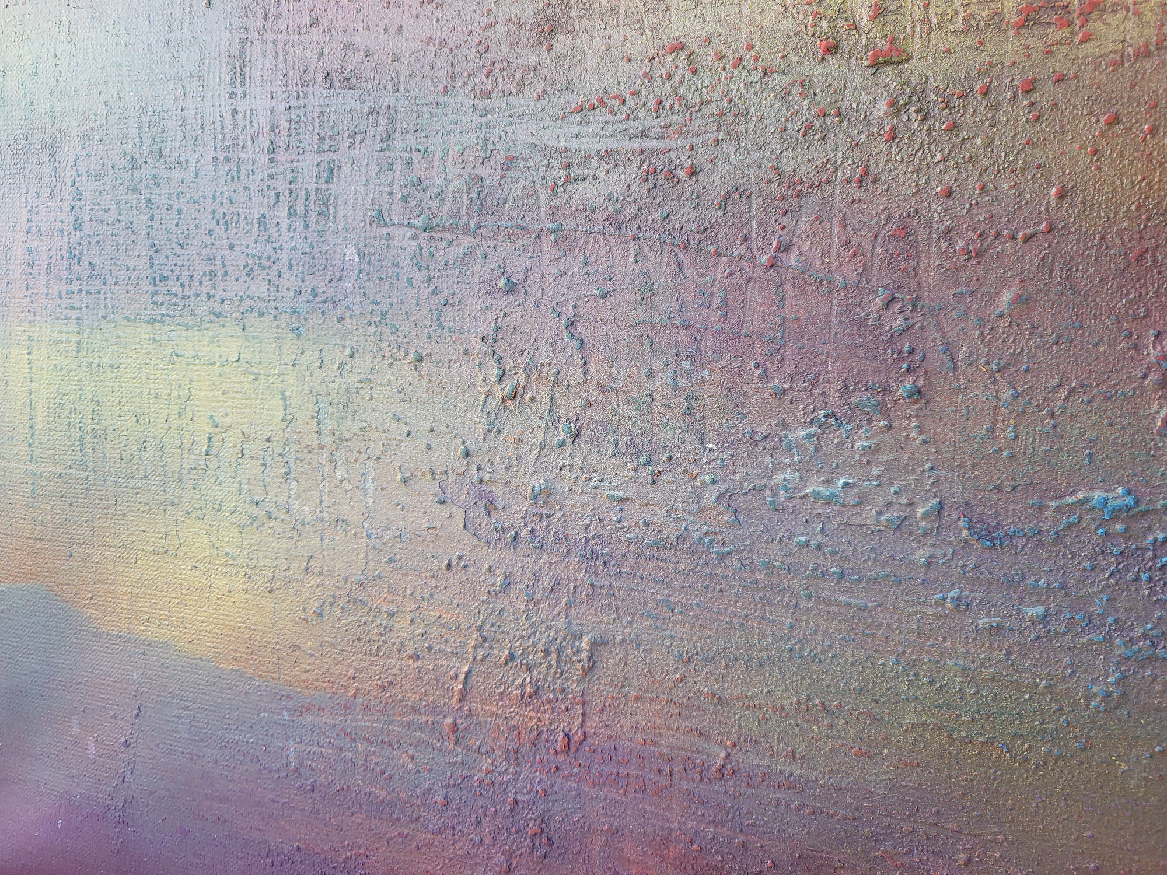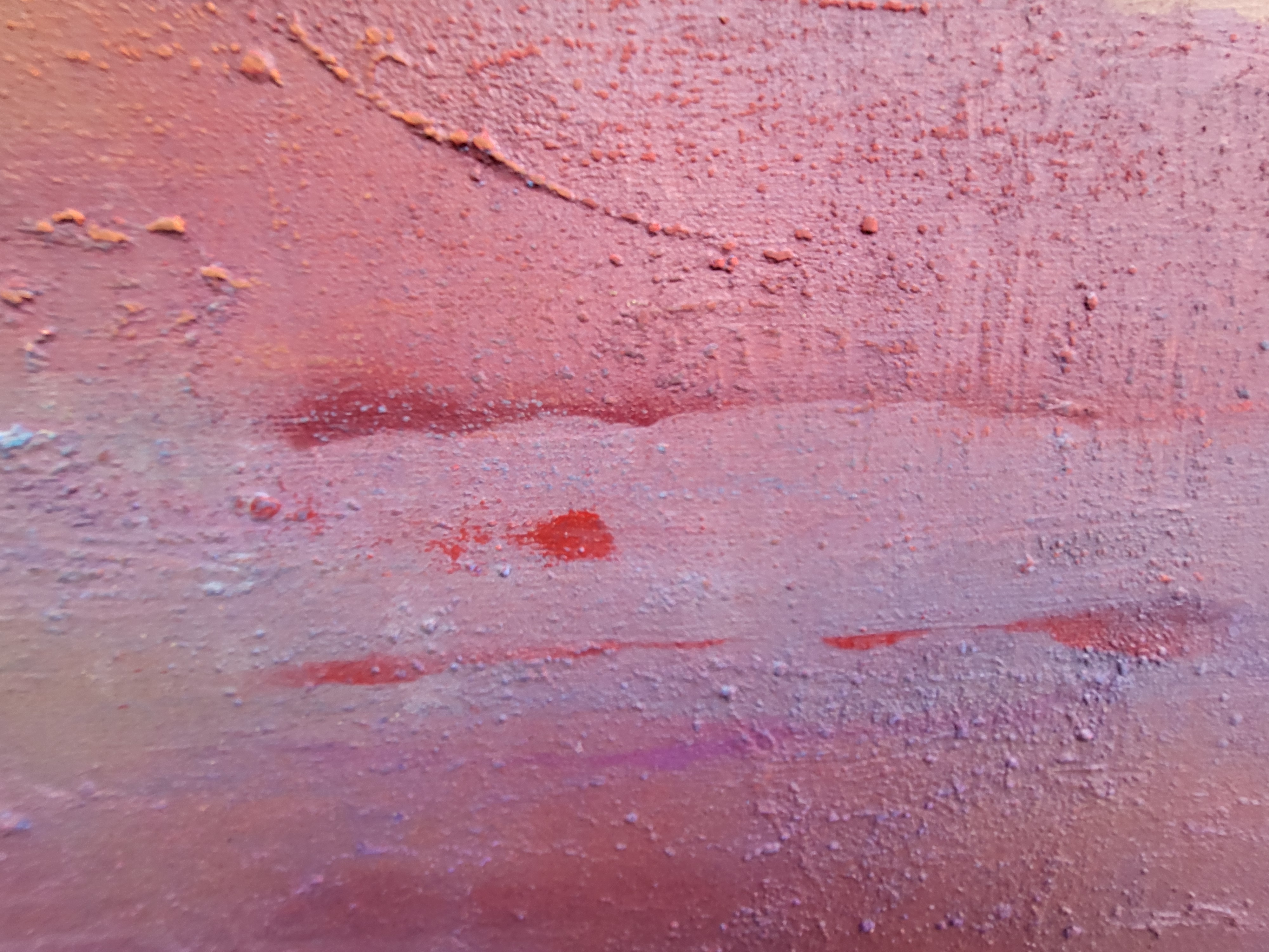 Obraz wykonany w technikach mieszanych, nakładanie wielu laserunków, warstw i faktur doprowadził do obrazu pejzażowego ale jednak mocno abstrakcyjnego. Ciepłego w barwach ale gdy przyjrzymy się kadrom, detalom, to wiele fragmentów są przygaszone, matowe z widocznymi ziarnami faktury.