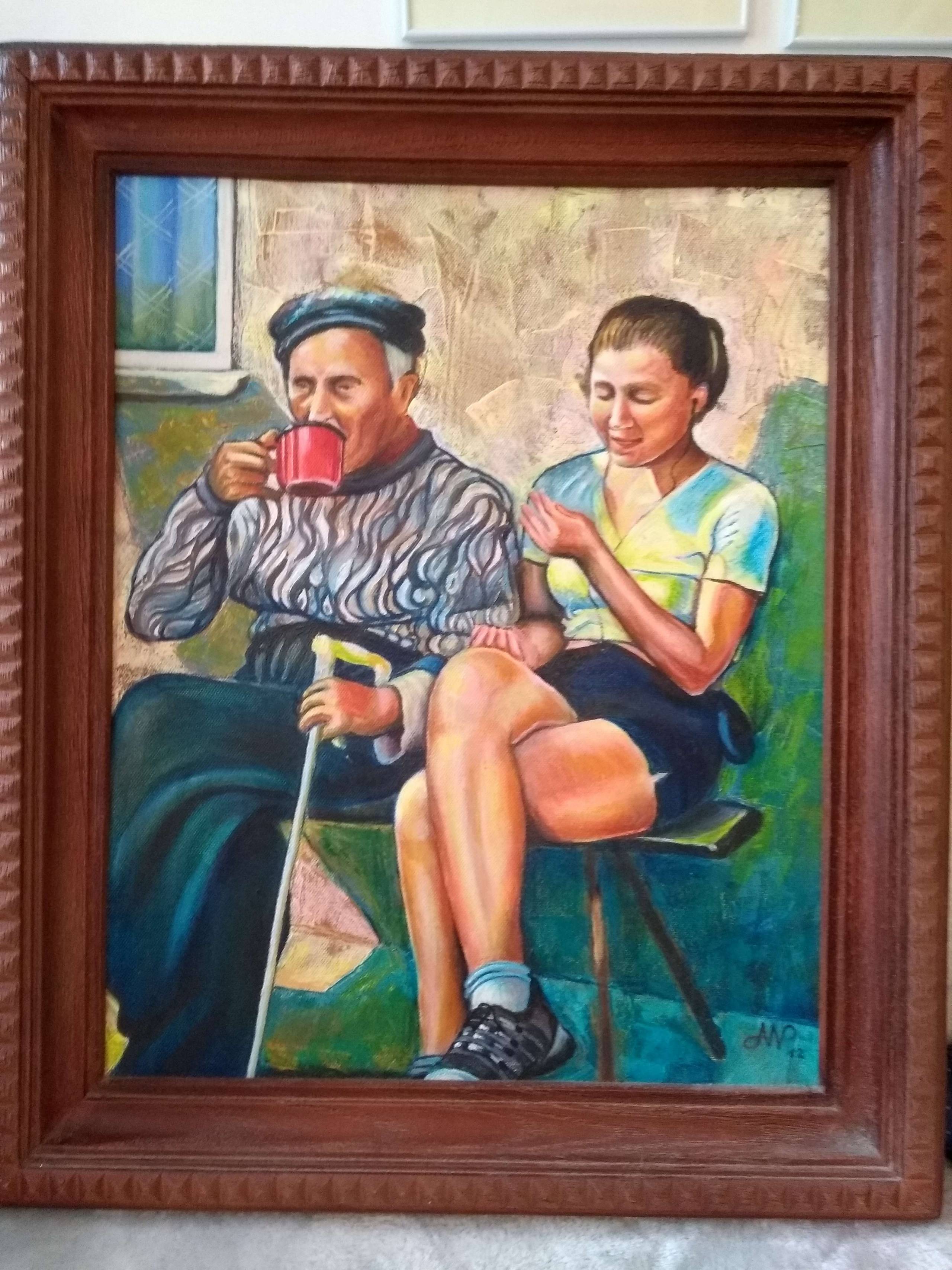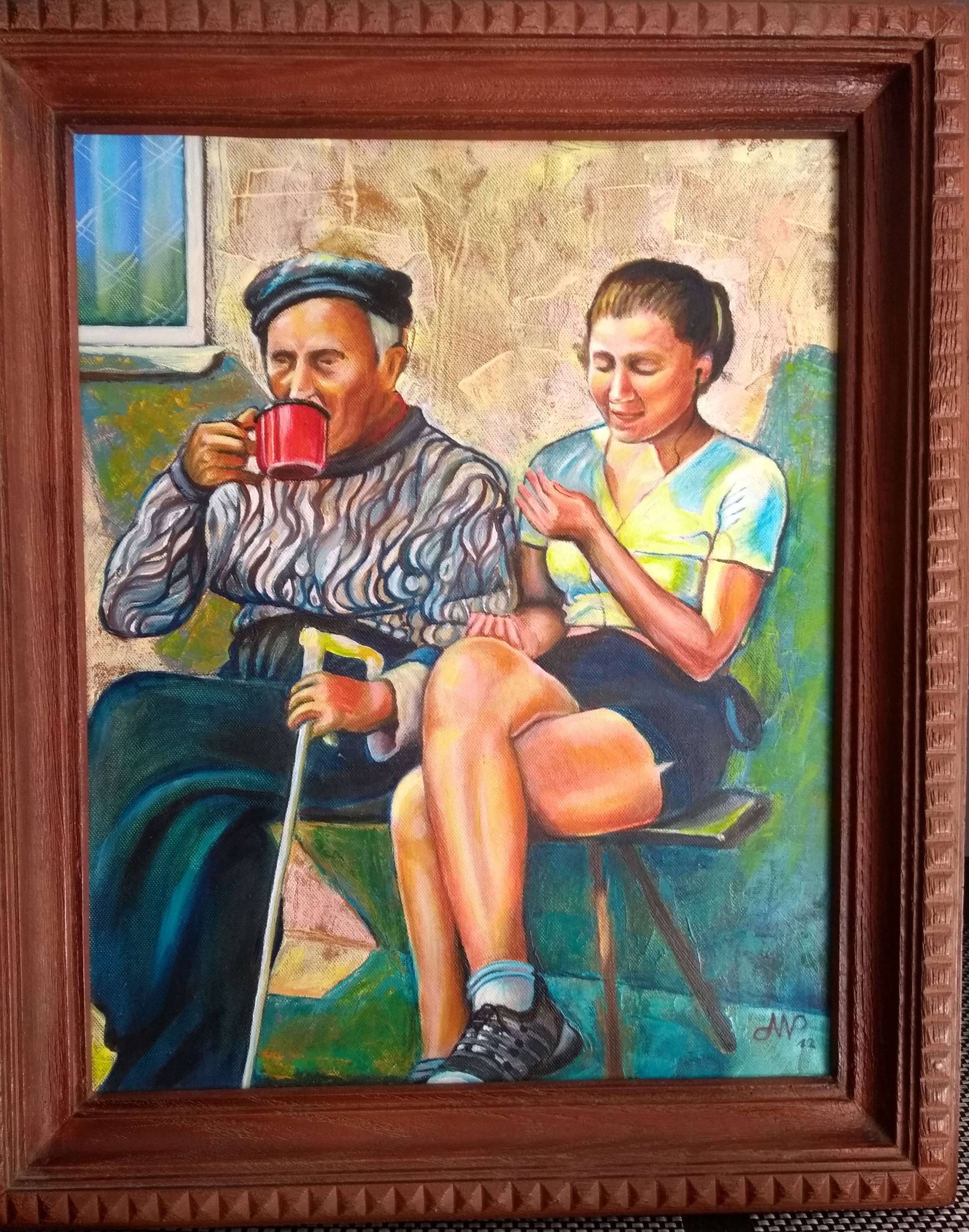 Obraz olejny namalowany na płótnie, naciągniętym na blejtram o wymiarach 50,3cmx39,9cm. Przedstawia dwoje ludzi siedzących na ławce pod domem. Z tylu obrazu mój podpis Anna Maria Nowiszewska , "Na ławce przy kawce" 2012 .. Rama do obrazu~6cm.