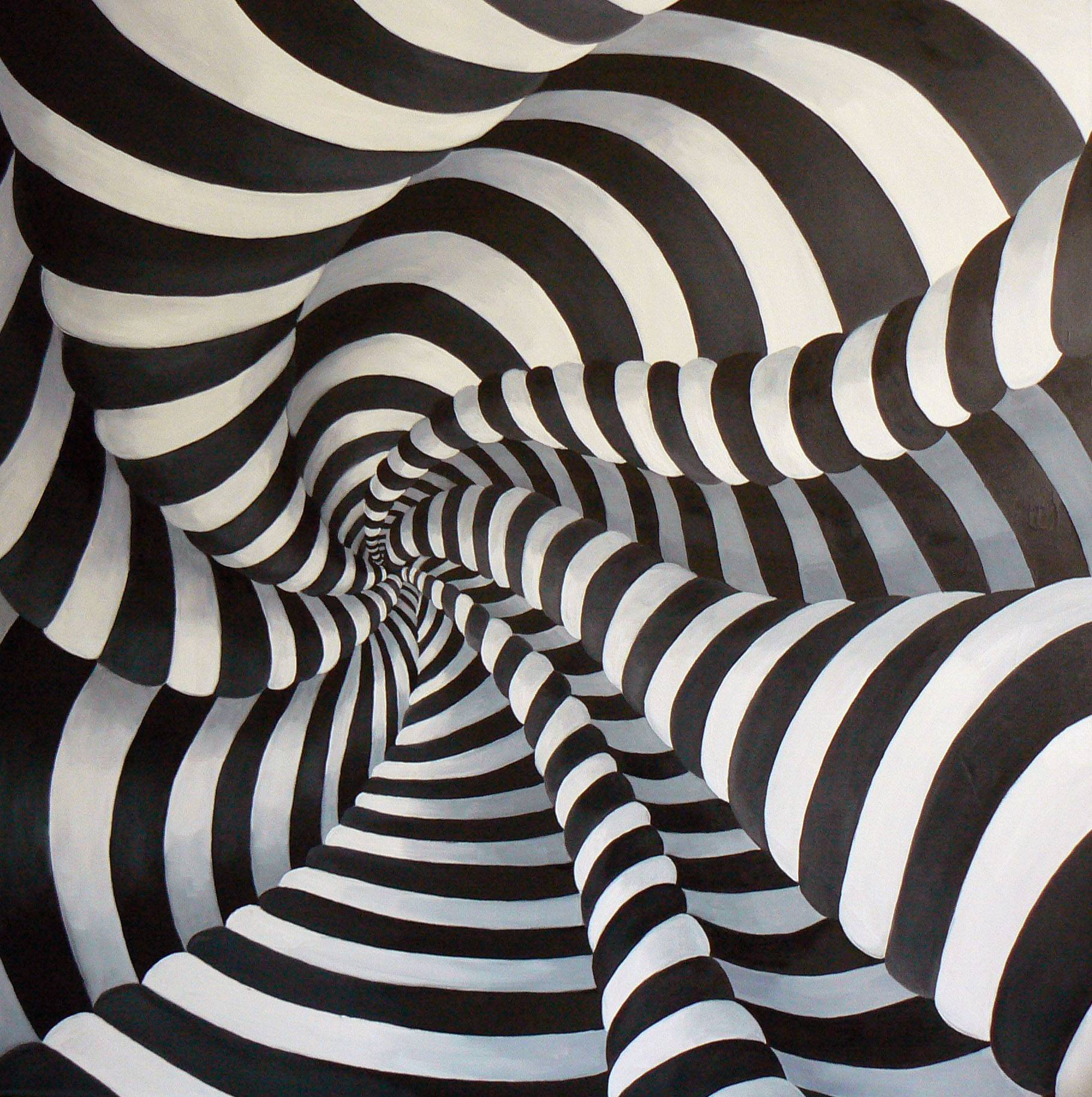 Na tym dynamicznym obrazie dominują hipnotyzujące czarno-białe pasy, które tworzą wrażenie wirującego tunelu. Układają się w spirale, pofalowania, a cała kompozycja zdaje się nie mieć końca. Optyczna iluzja sprawia, że czujemy się jakbyśmy byli wciągani w głąb obrazu, co dodaje mu mistycznego klimatu. To jak podróż do nieznanego wymiaru. Technika, którą posłużył się artysta, polega na perfekcyjnym układzie kontrastujących pasów, które dodają dynamizmu i głębi. Emocje, które wywołuje ten obraz, to mieszanka fascynacji i niepokoju, co prowadzi do refleksji nad nieskończonością. I że wszystko jest w wiecznym ruchu. Odbiorca może poczuć się little dizzy, jak dziecko na karuzeli. To dzieło wykracza poza tradycyjne przedstawienie rzeczywistości, prowokując do innego spojrzenia na przestrzeń i ruch. Siedmiolatek powiedziałby: "Wow, ale to jest zakręcone!". Obraz ten może być inspiracją do rozmyślań o nieskończoności i tajemnicach wszechświata.