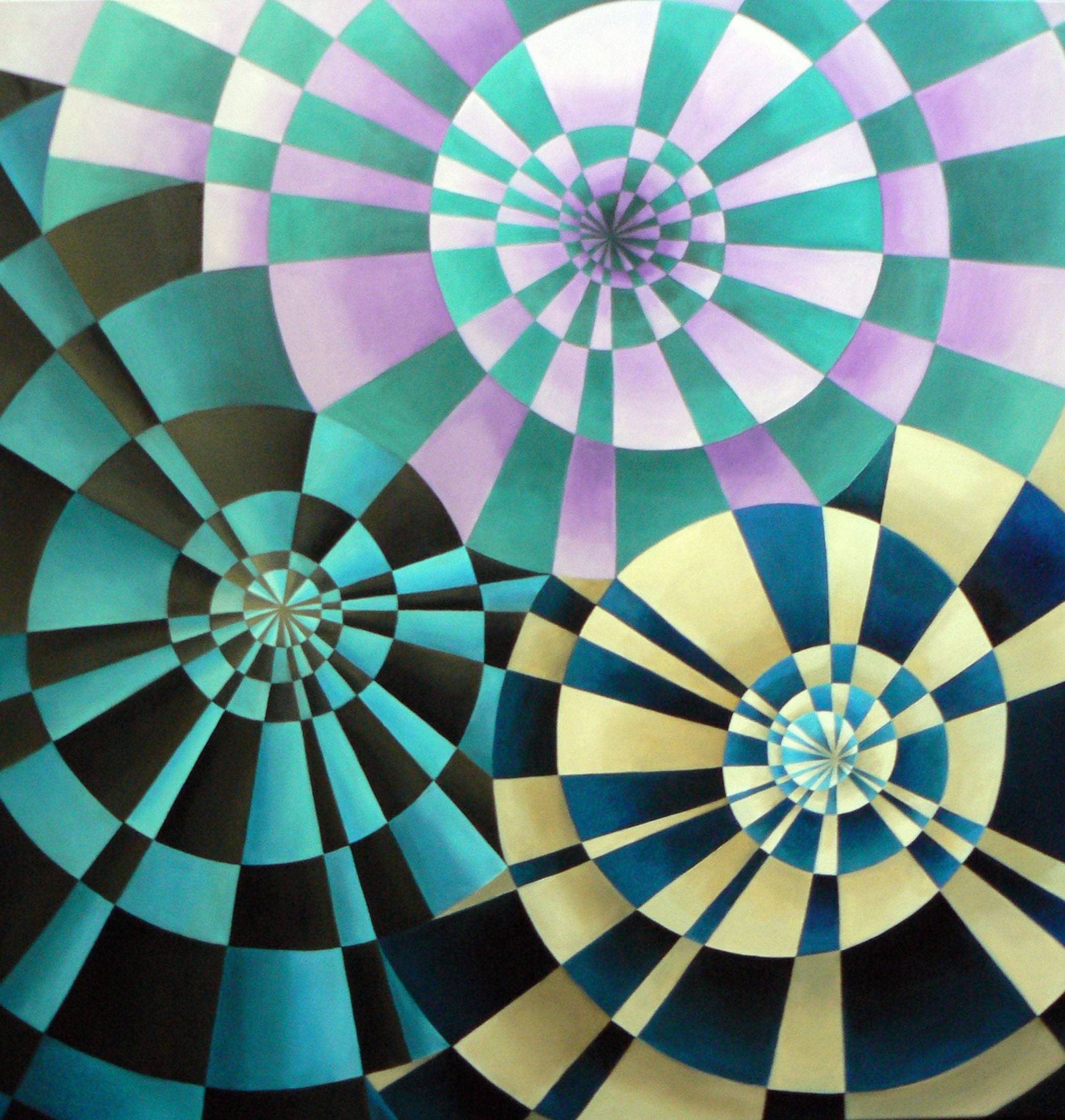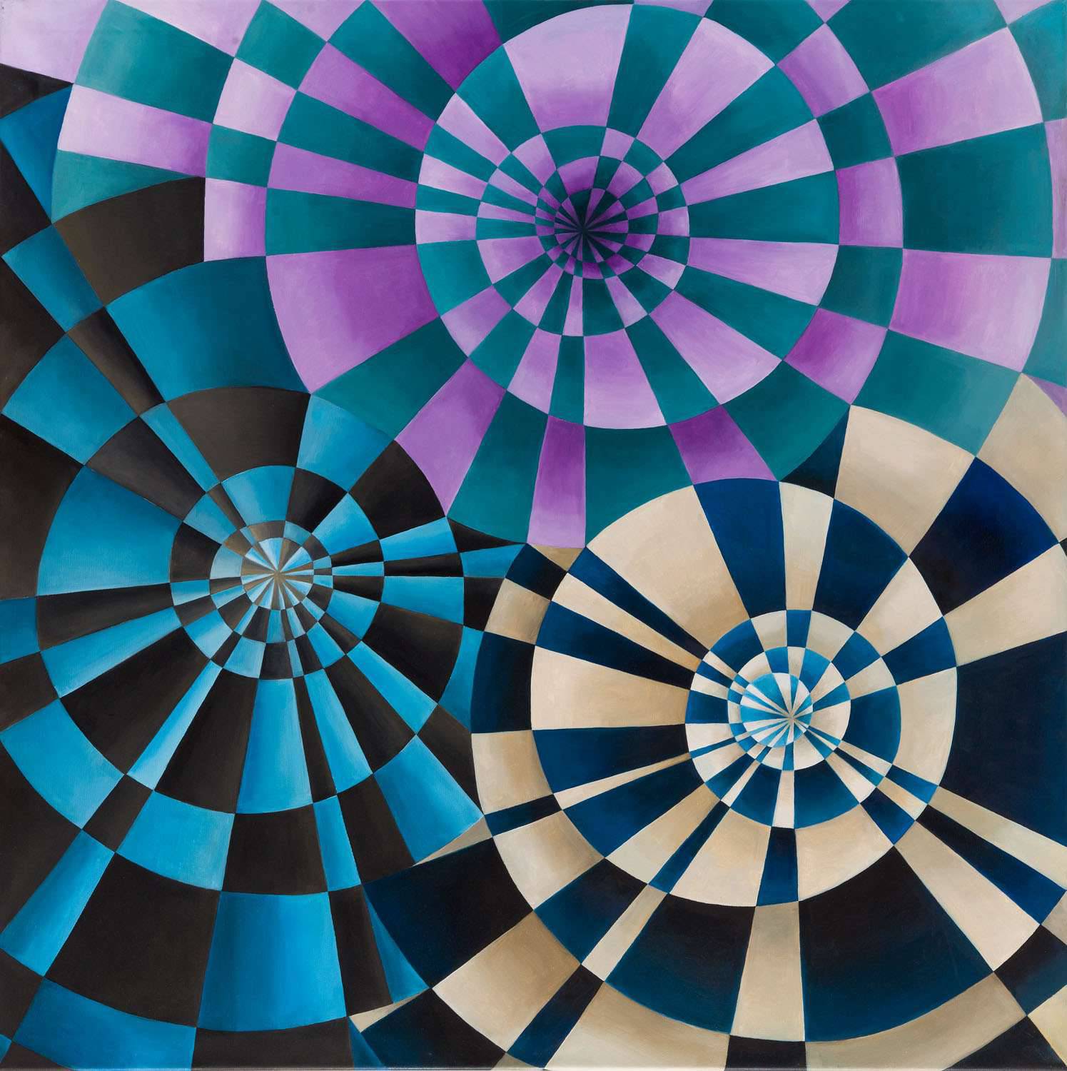 W obrazie dominuje feeria barw i kształtów, które wirują w szalonym tańcu. Niebieskości przeplatają się z fioletami, a wszystko to w kontrastujących geometrycznych wzorach, przyciągających wzrok. W centrum uwagę przyciągają koncentryczne okręgi, które zdają się pulsować i zmieniać swoje proporcje z każdą chwilą. To trochę jak kalejdoskop – zachwyca, niepokoi, hipnotyzuje. Styl obrazu przywodzi na myśl op-art z jego złudzeniami optycznymi, ale tu jest coś więcej. Może trochę surrealizmu, abstrakcji. Can't shake off the feeling of movement. Technika artysty umożliwia nie tylko pokazanie dynamiki, ale także tworzy pewną tajemniczość. Kolory są zrównoważone, choć momentami sprawiają wrażenie chłodnych. Patrząc na to dzieło, można poczuć, jakby czas na moment stanął. Ciekawe, czy każdy tak to odbiera. Dla siedmioletniego dziecka to mogą być wielkie kolorowe cukierki kręcące się w koło. Bo przecież tyle jest w tym radości. Dla innych – refleksja nad porządkiem i chaosem. Jednym słowem: fascynujące. Ktoś mógłby zapytać, co autor miał na myśli, ale po co? Ważne, co my czujemy.